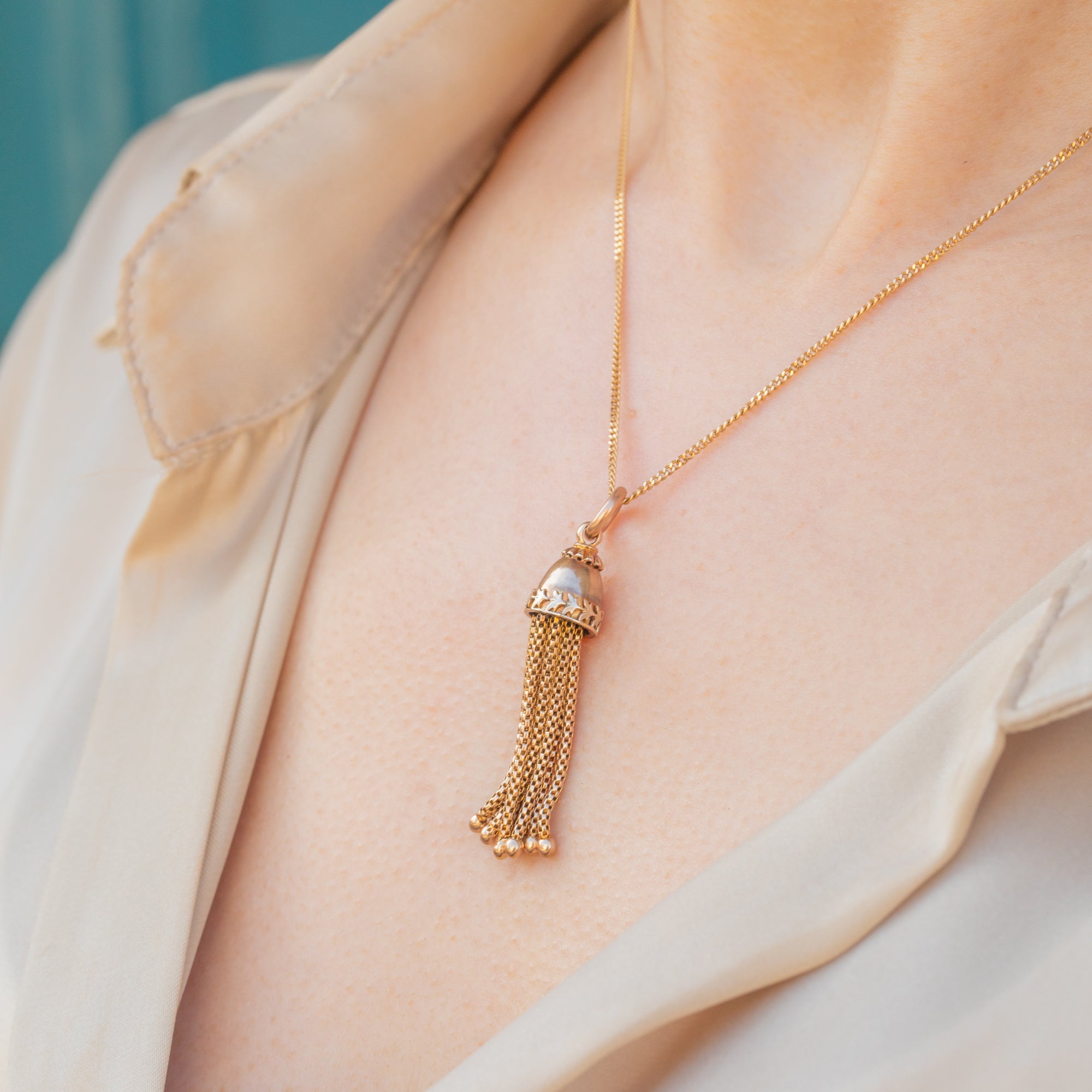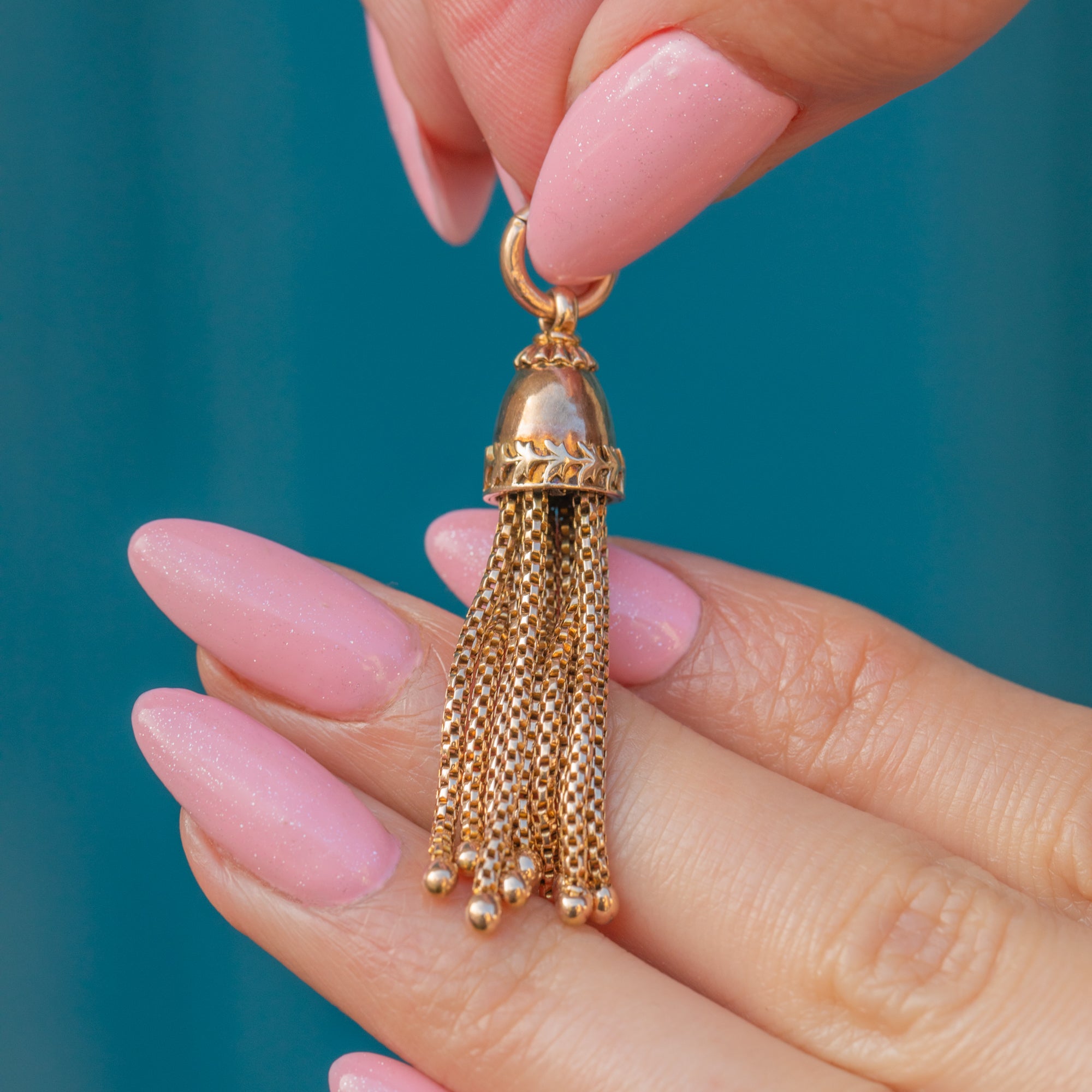 This Victorian 9ct Gold tassel pendant is gorgeous! Crafted from solid 9ct Gold throughout, this tassel has pretty foliage detailing and wonderful double belcher links.