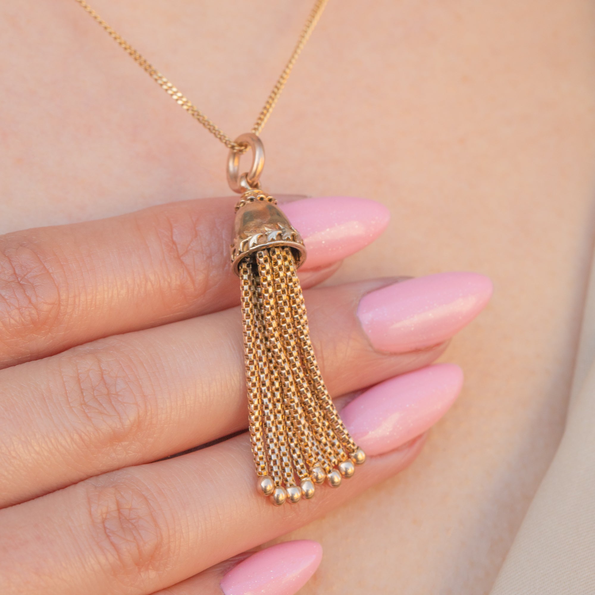 GOOD: This Victorian 9ct Gold tassel pendant is presented in good condition. Her 9ct Gold is honey-hued and bright with some minor surface wear to the Gold, commensurate with her grand age. There is one Golden bead missing on the end of her shimmering tassels but this is often hidden in-between the movement of the other dangling tassels. Complete with a chunky jump ring, this lovely piece promises you many more years of fun!