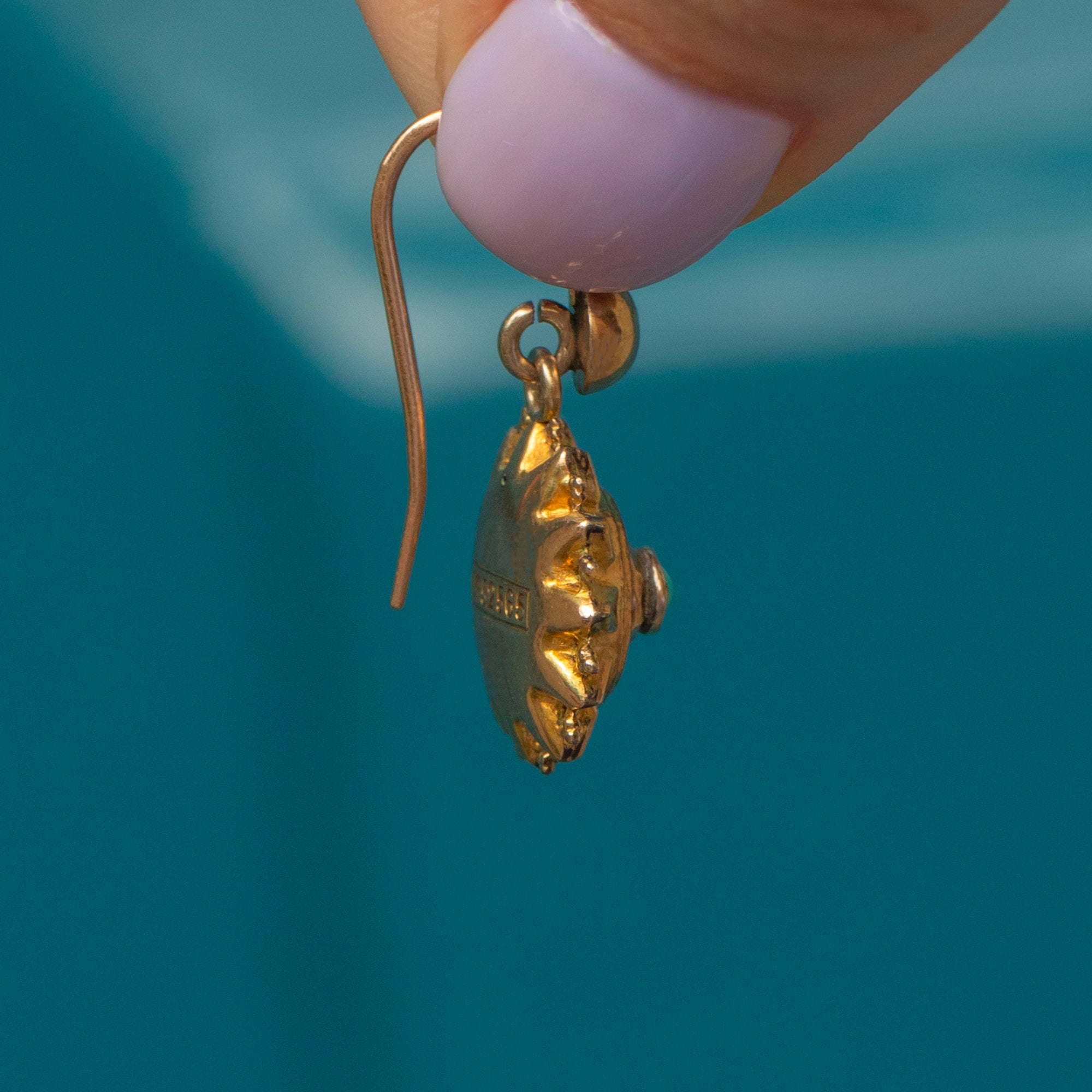 These Gold star earrings have beautifully detailed fronts, with little heart and beaded motifs visible up close. The centre of both earrings are home to a dainty blue Turquoise cabochon that really make them pop!