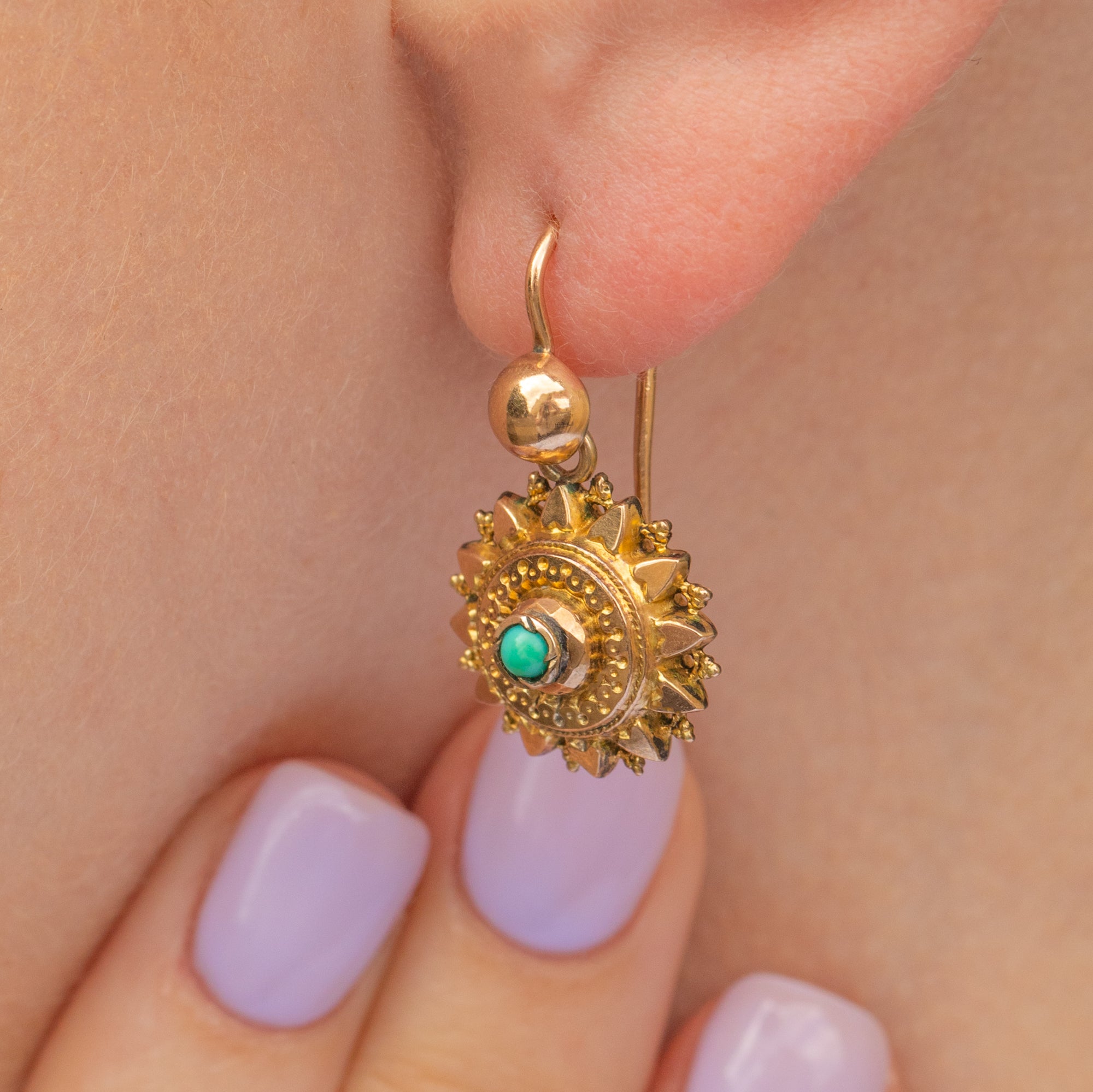 EXCELLENT. These Victorian 9ct Gold Turquoise star earrings are in excellent condition. The Turquoise cabochons are secure, and the earrings have kept their shape beautifully. The hooks slot comfortably into the ear so you can wear them with confidence!