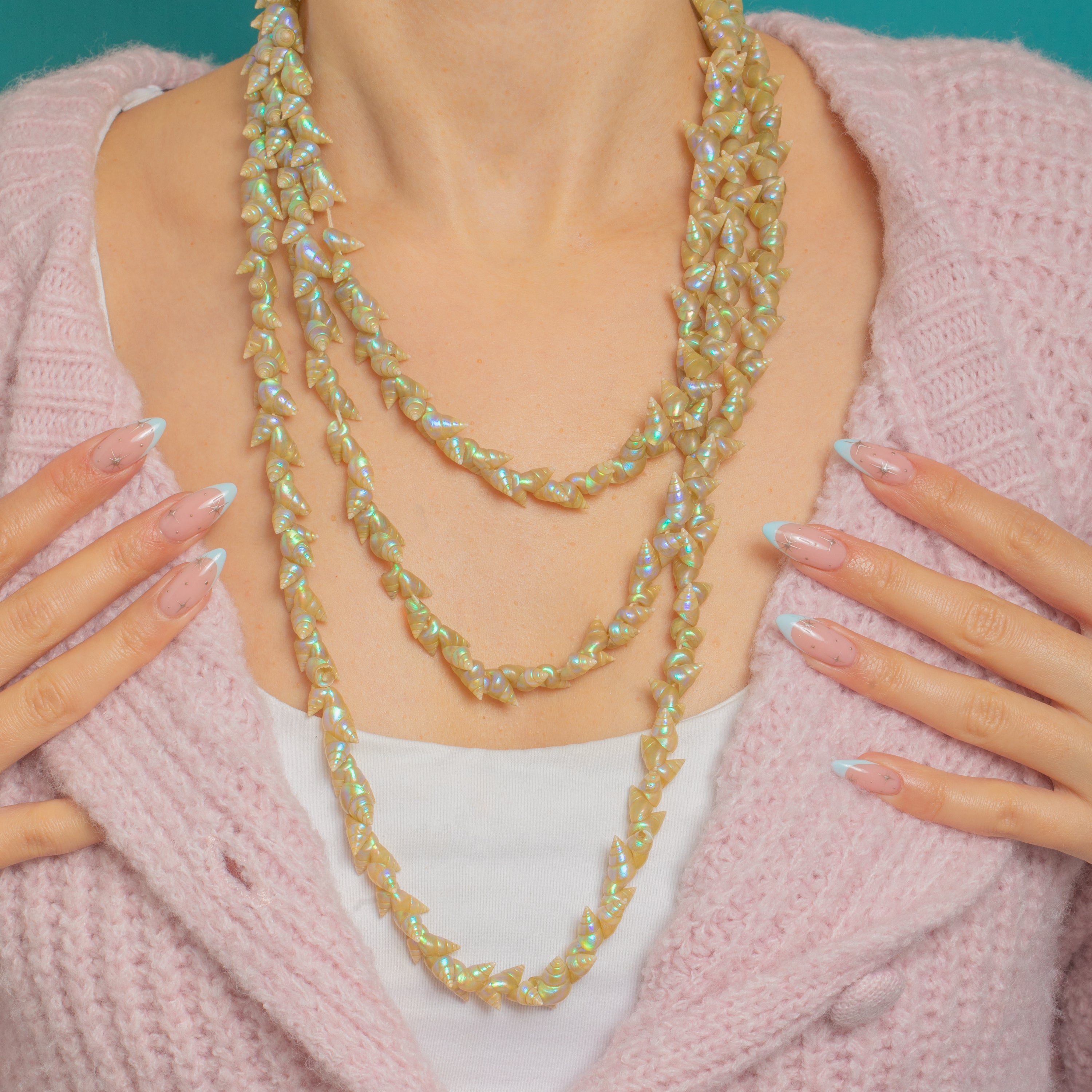 This elegant endless rope can be worn long, doubled or even tripled for a bold, textural look. Beautifully fluid, the strand shows the natural glossy lustre and subtle variation of the shells, offering a captivating play of colour with every movement.