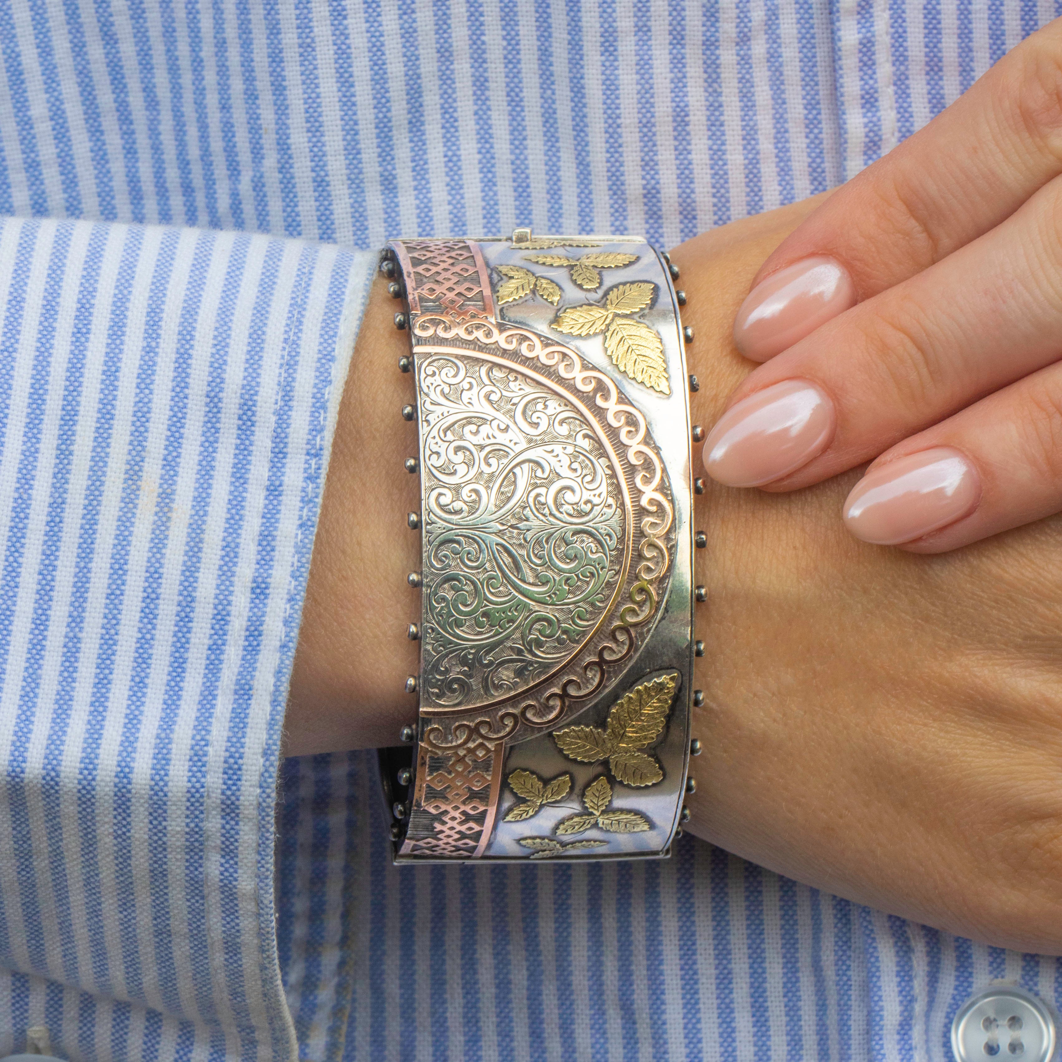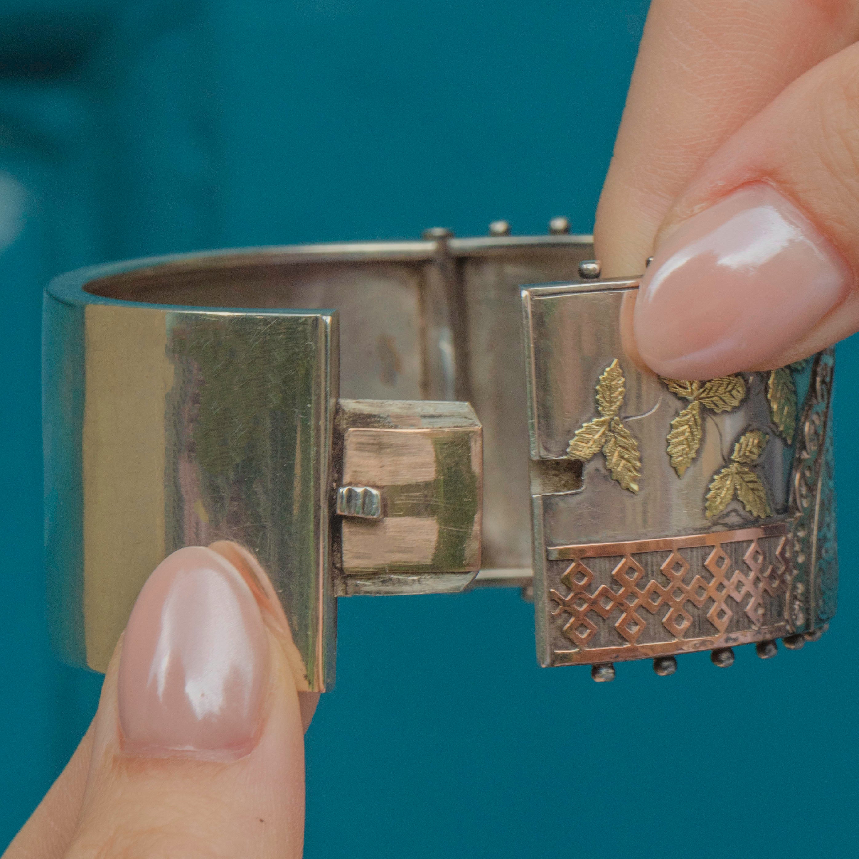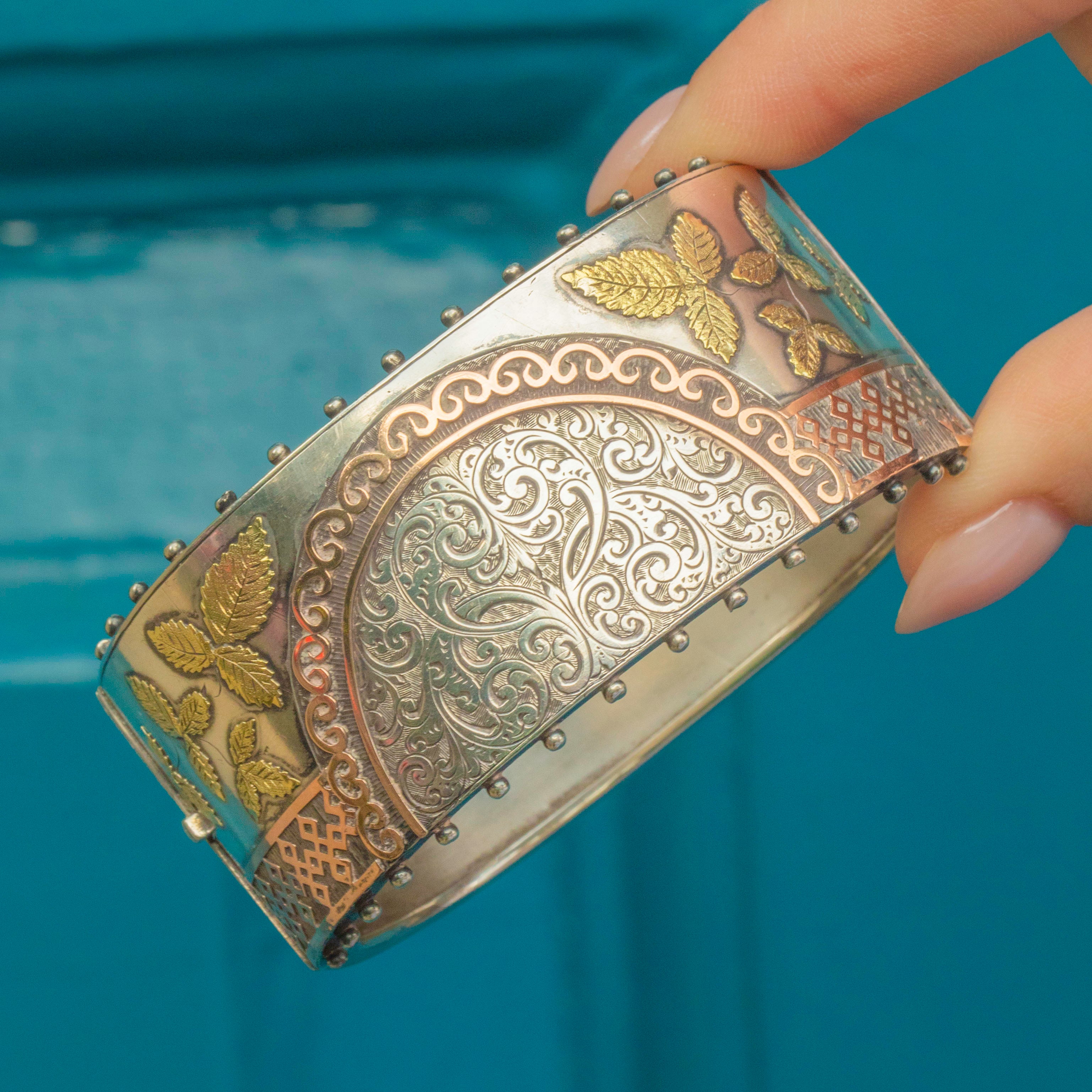 VERY GOOD. This Victorian Aesthetic engraved bangle is in wonderful condition and has clearly been well cared for over the years, closing tightly and symmetrically around the wrist. The Sterling Silver is bright and the bangle has kept its form well with only a few minor dings, commensurate with age. Her 9ct Rose Gold and Green Gold decoration has also aged very well over the years, with only a small section of Rose Gold missing, which is reflected in the price. The engraved details have remained crisp and each bead along the edge is present. She is a beauty!