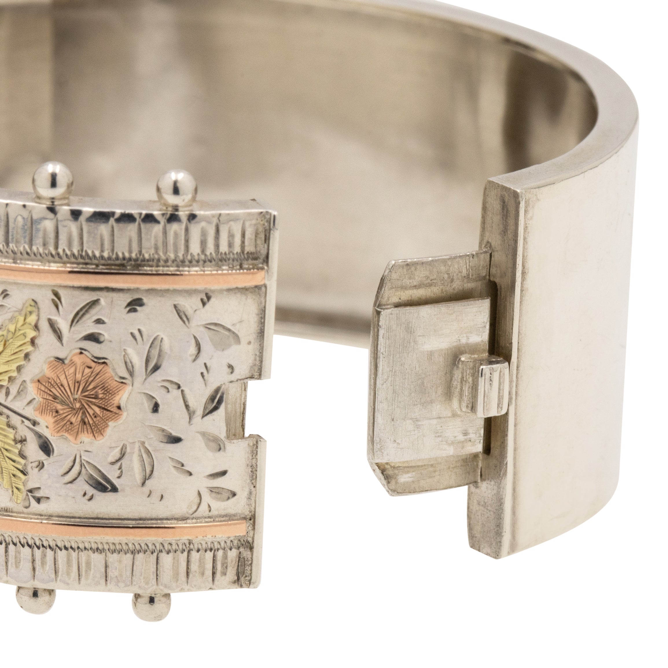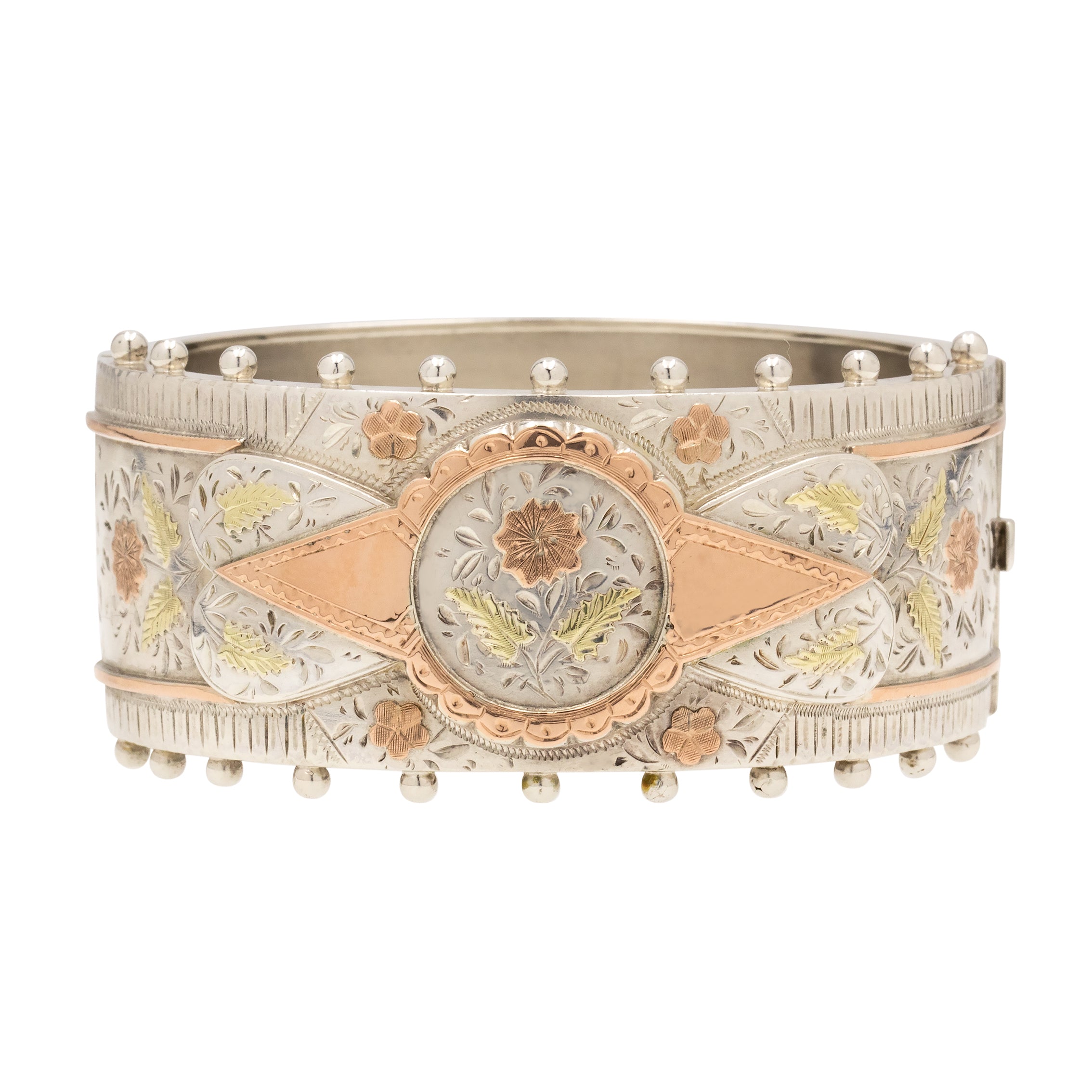 Bracelet gravé floral esthétique victorien avec bord perlée, vers 1884.