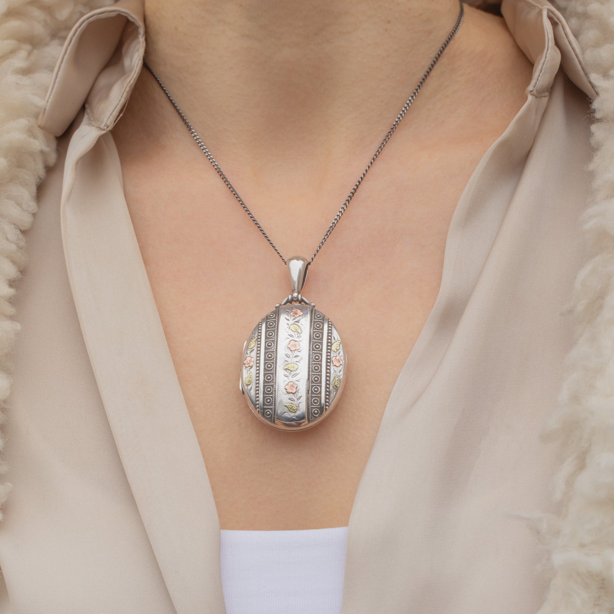 EXCELLENT. This Victorian Aesthetic Silver & 9ct Gold floral locket is in excellent condition. The Silver is bright and has accrued a lovely patina within the details making them pop. The Gold florals have remained defined with all the engraved details crisp. There is some minor wear inside the locket, commensurate with age, but this does not affect the integrity of the piece. Closing securely, you can wear this eye-catching Victorian Silver locket with utmost confidence!