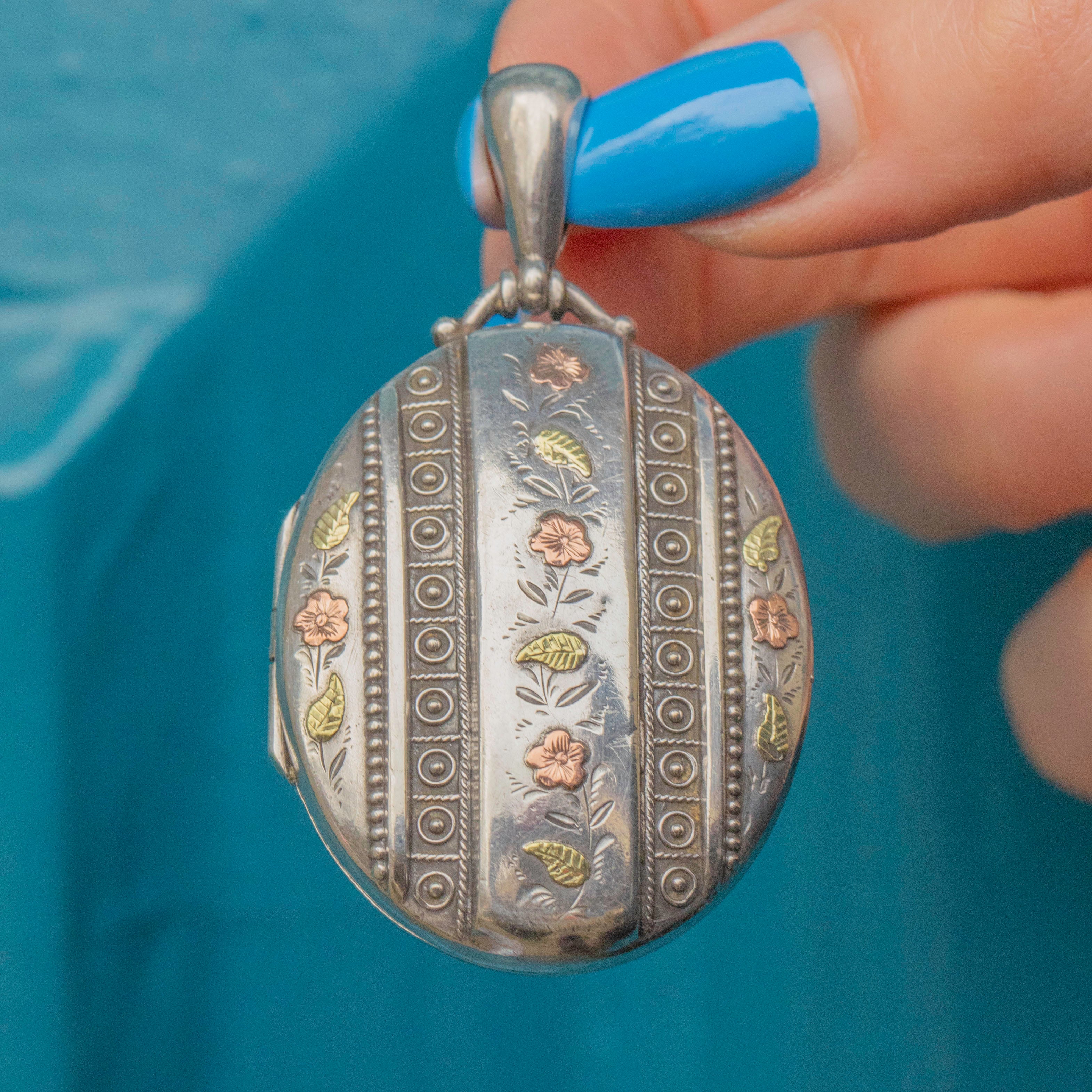 Victorian Aesthetic Silver & 9ct Gold Floral Locket, c.1881