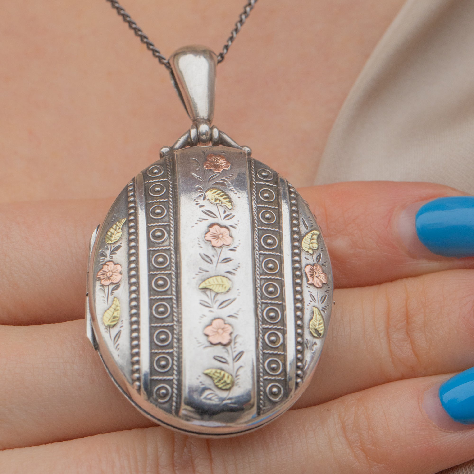 This striking Victorian Aesthetic Silver & 9ct Gold floral locket is bursting with antique charm! Exquisitely crafted, the front of the locket displays an abundance of finely embossed details and charming florals, perfectly capturing the stylistic bold designs of the Victorian Aesthetic movement.
