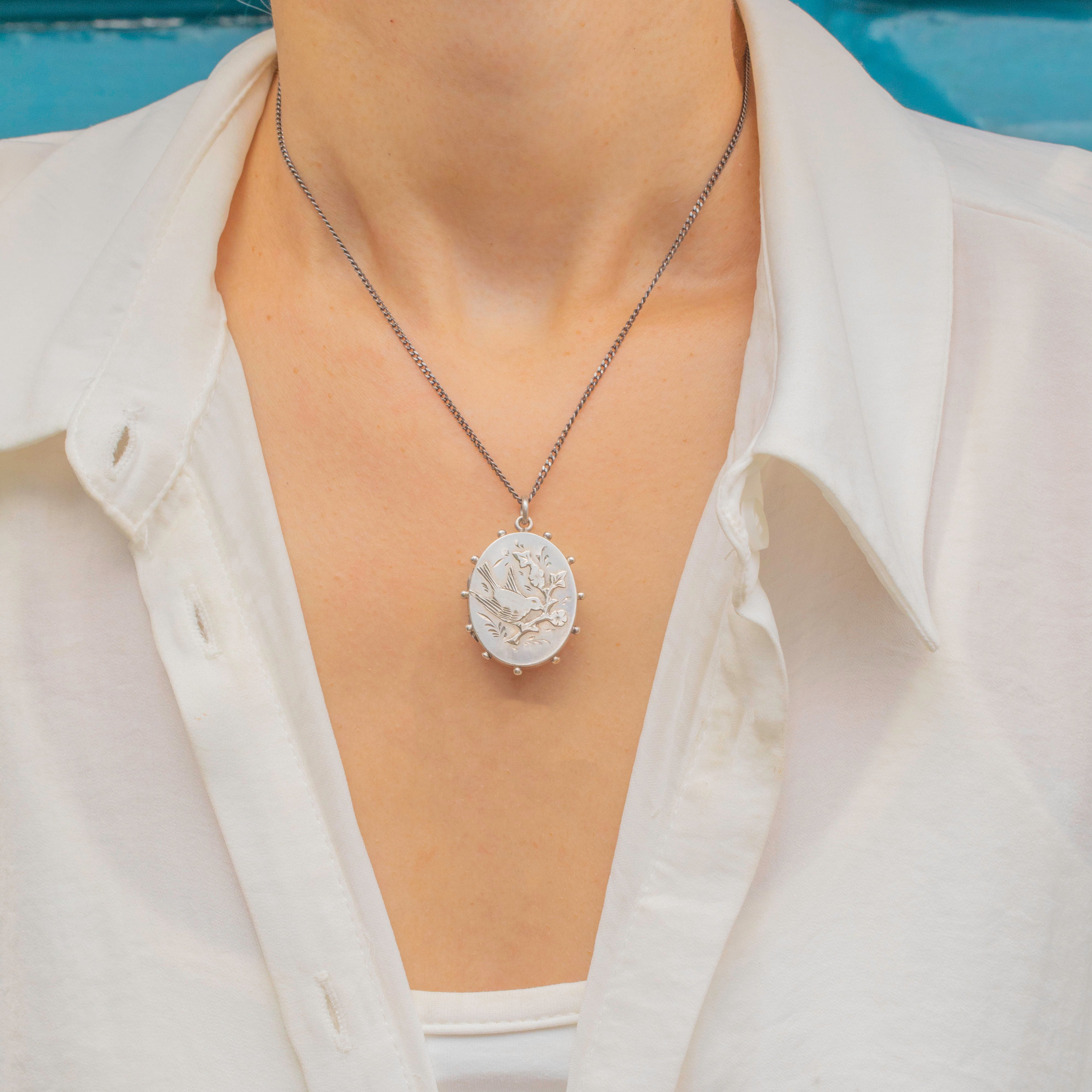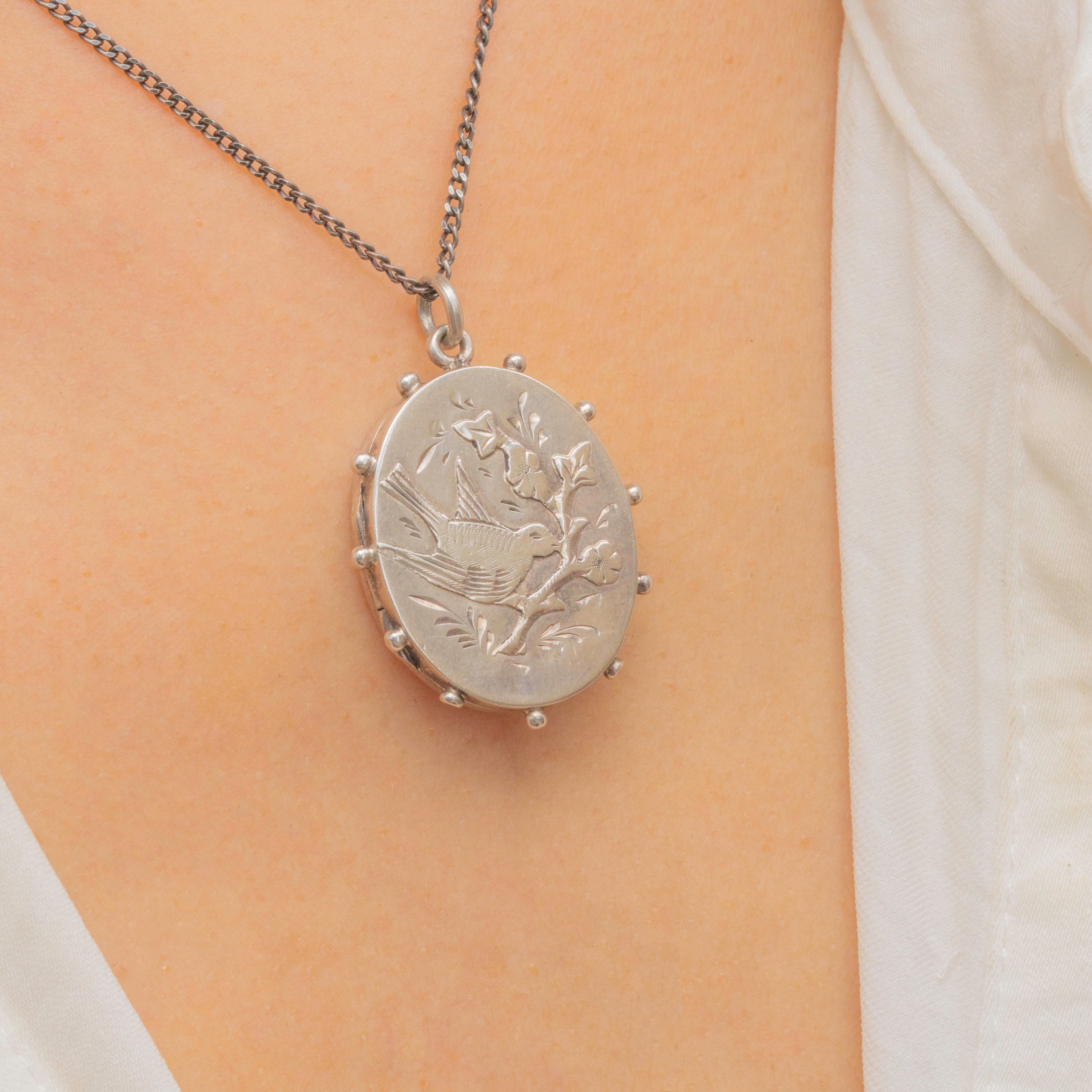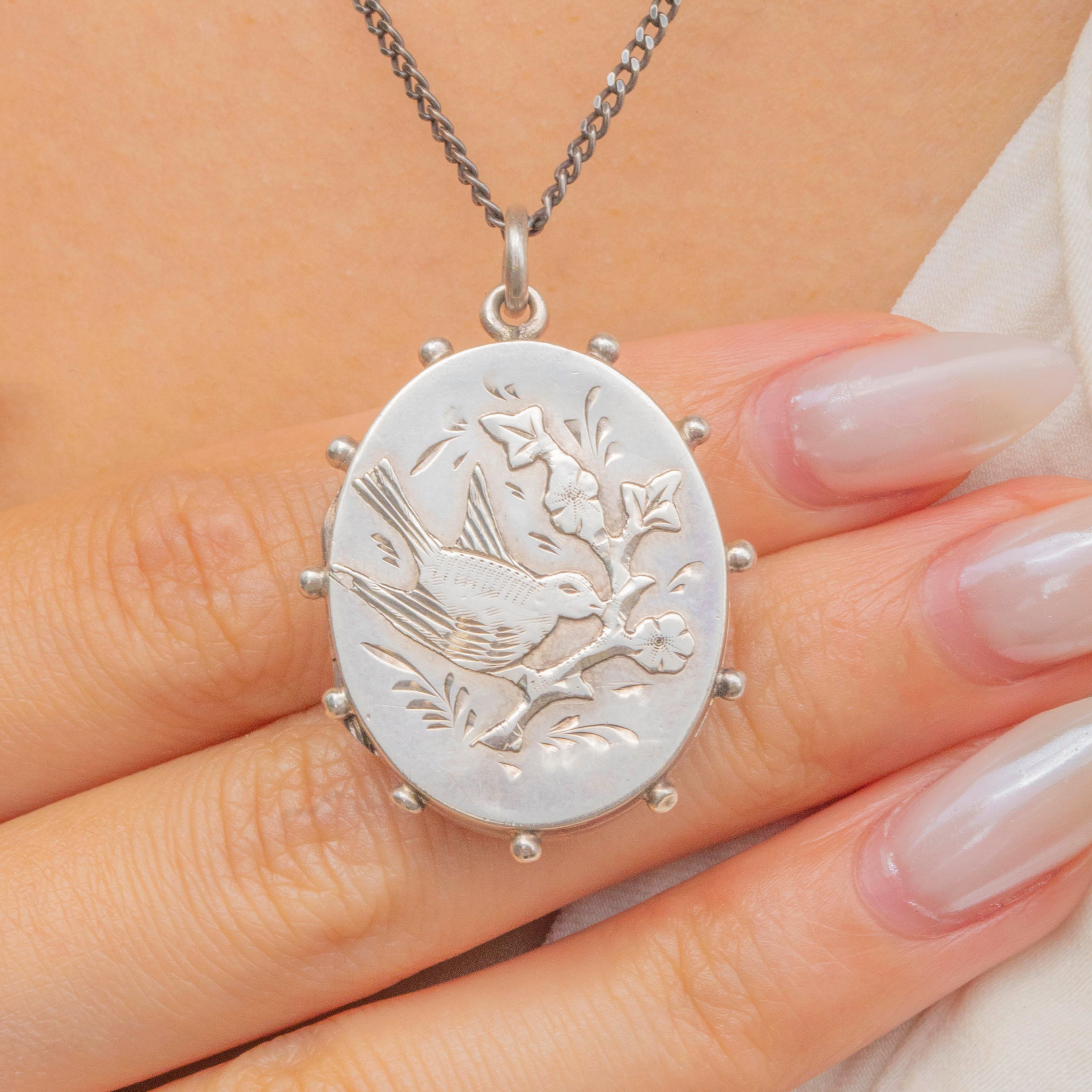 This Sterling Silver locket depicts a bird perched on a branch on its front, surrounded by floral details and a beaded edge!