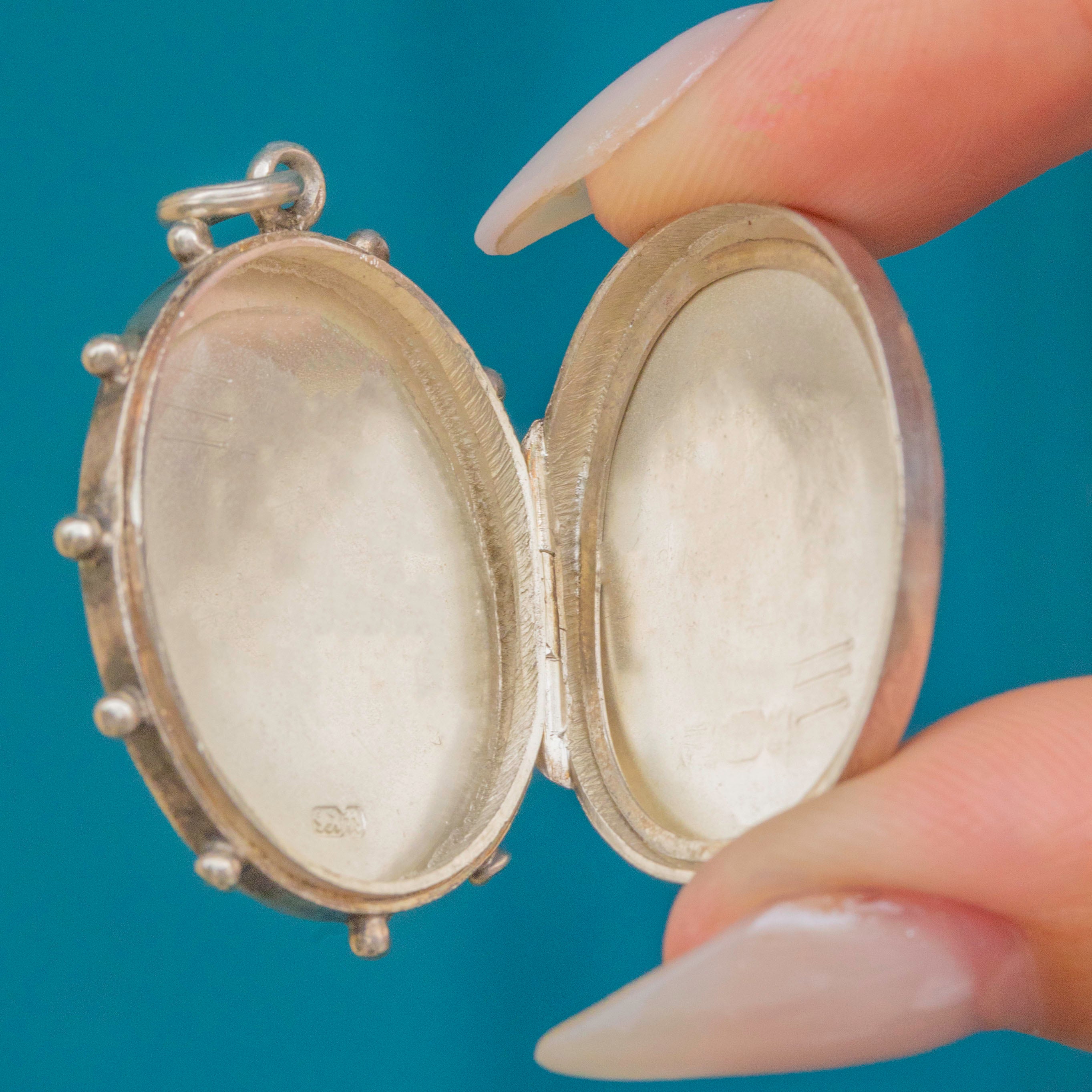 VERY GOOD. The locket closes securely, with a full set of hallmarks to the back. Inside there is a frame and a glass panel. Some of the beaded edge details has worn down and there are some dings to the back of the locket, but you can wear it comfortably and confidently.