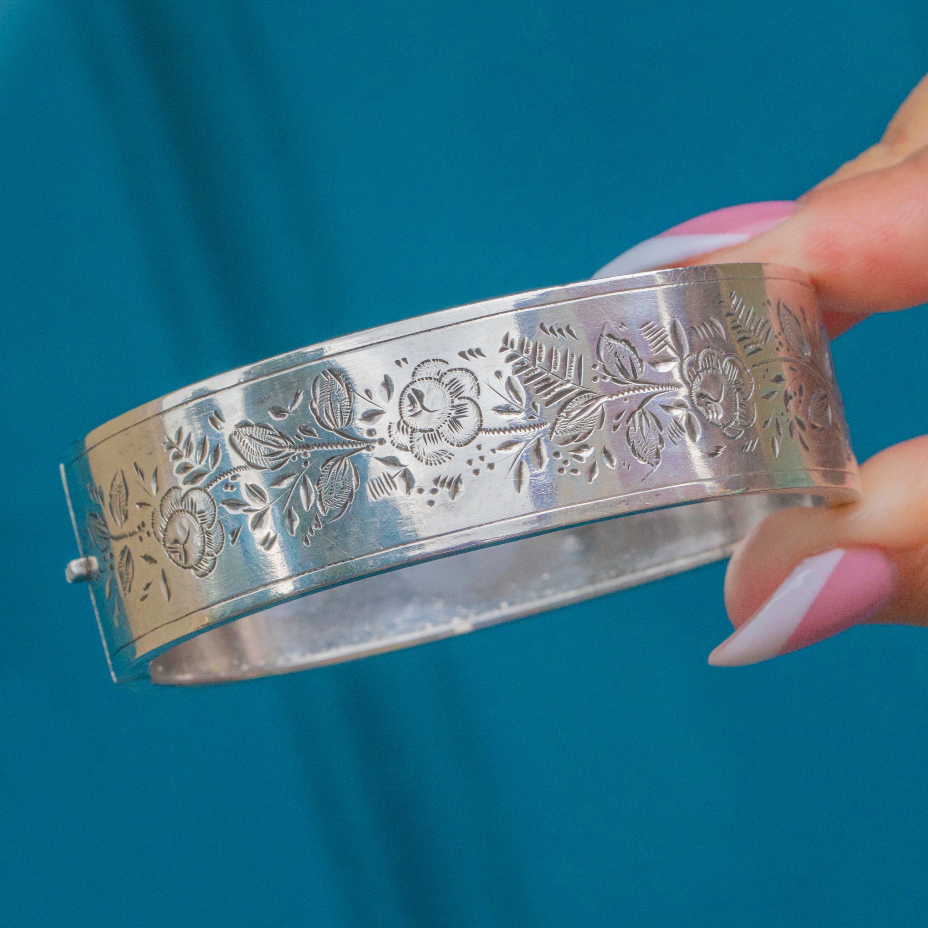Crafted from glossy Sterling Silver, this antique bangle is adorned with intricate floral motifs across its front in quintessential Victorian Aesthetic style.
