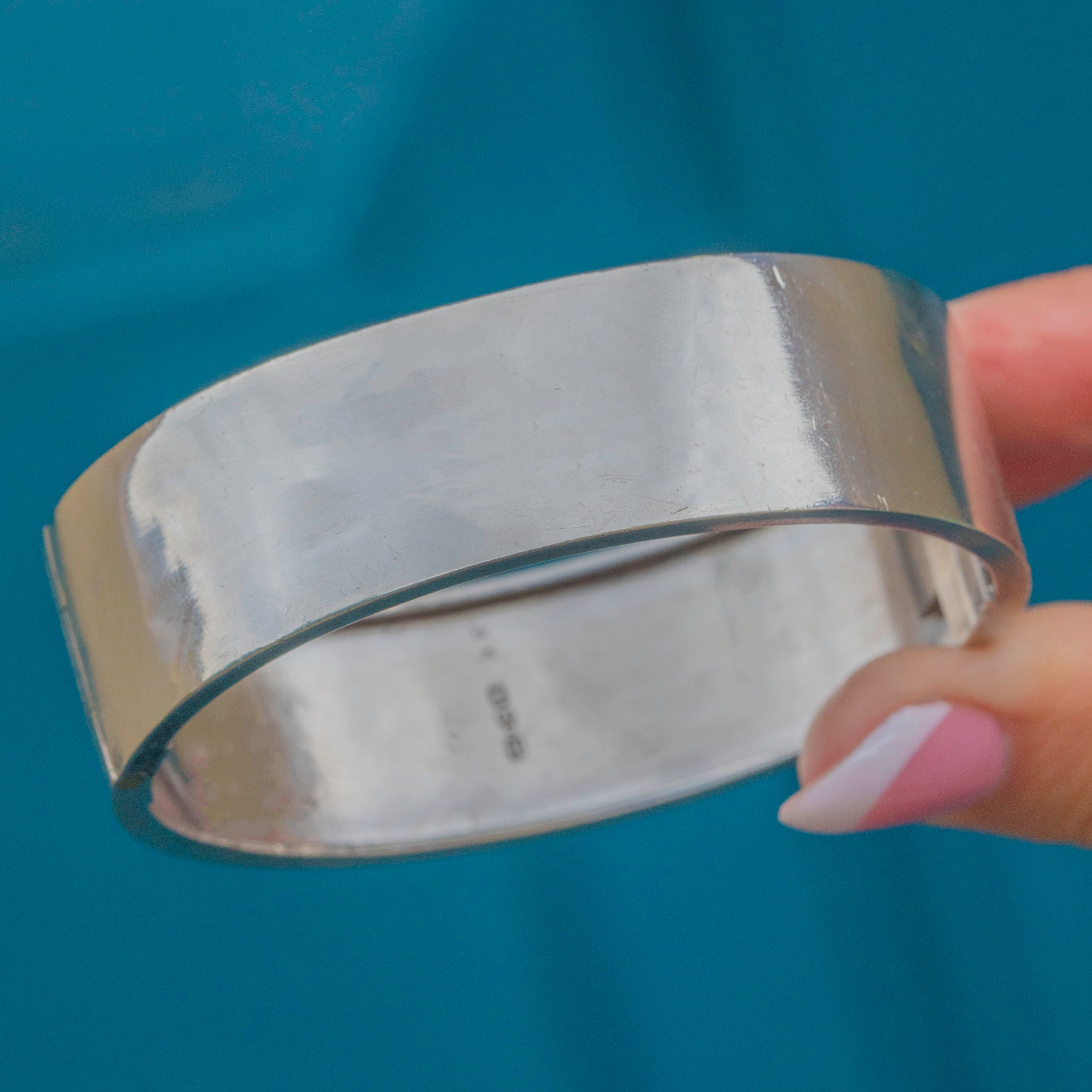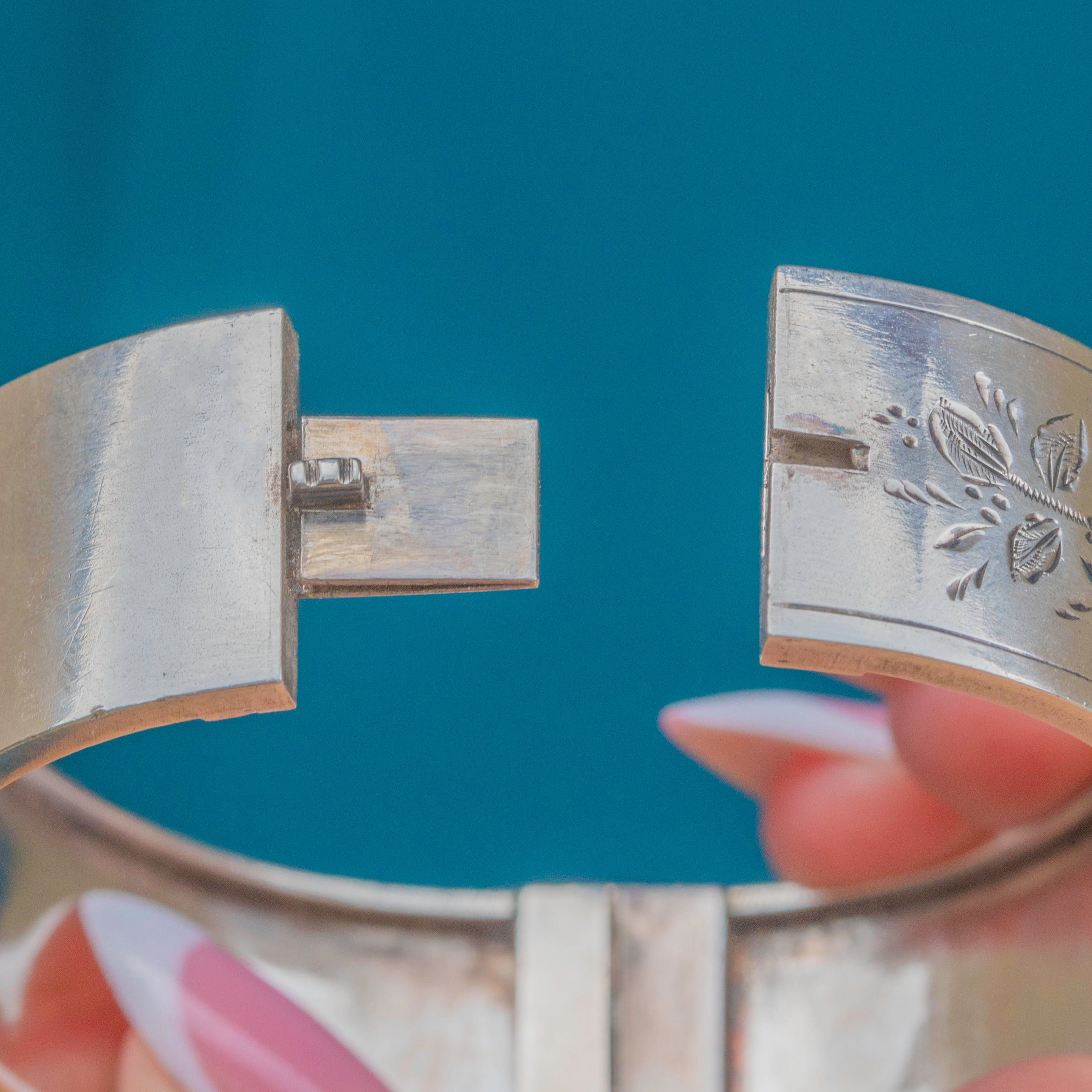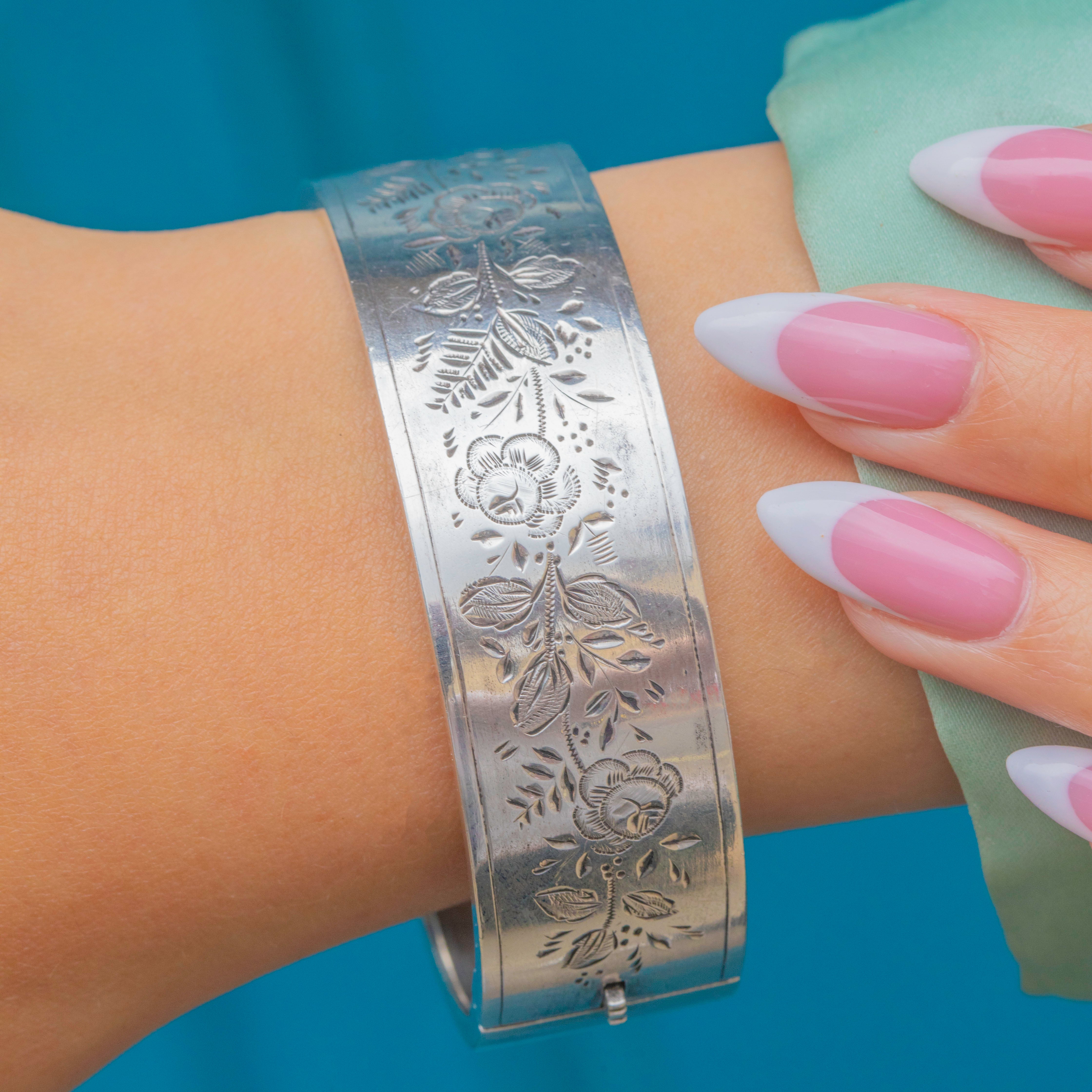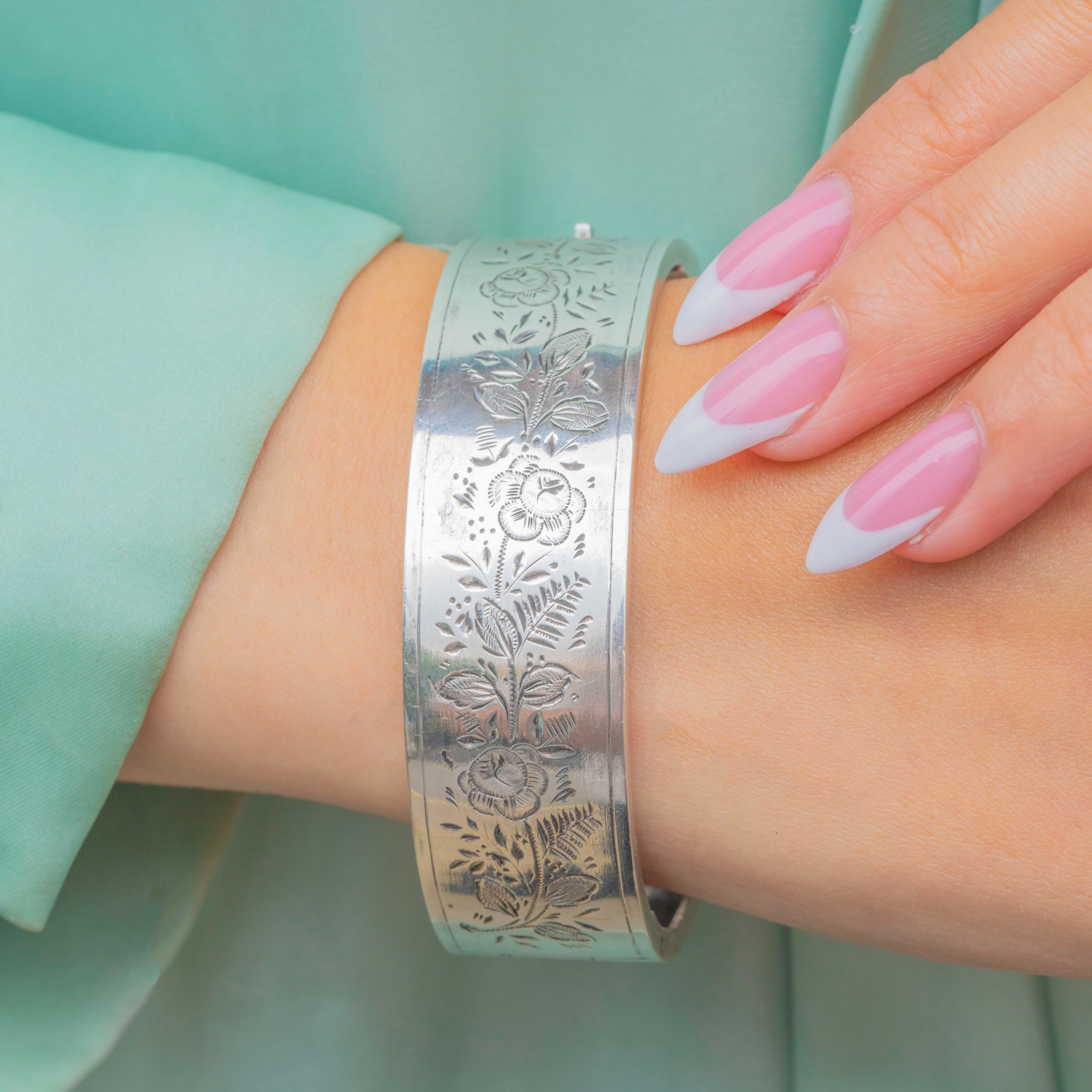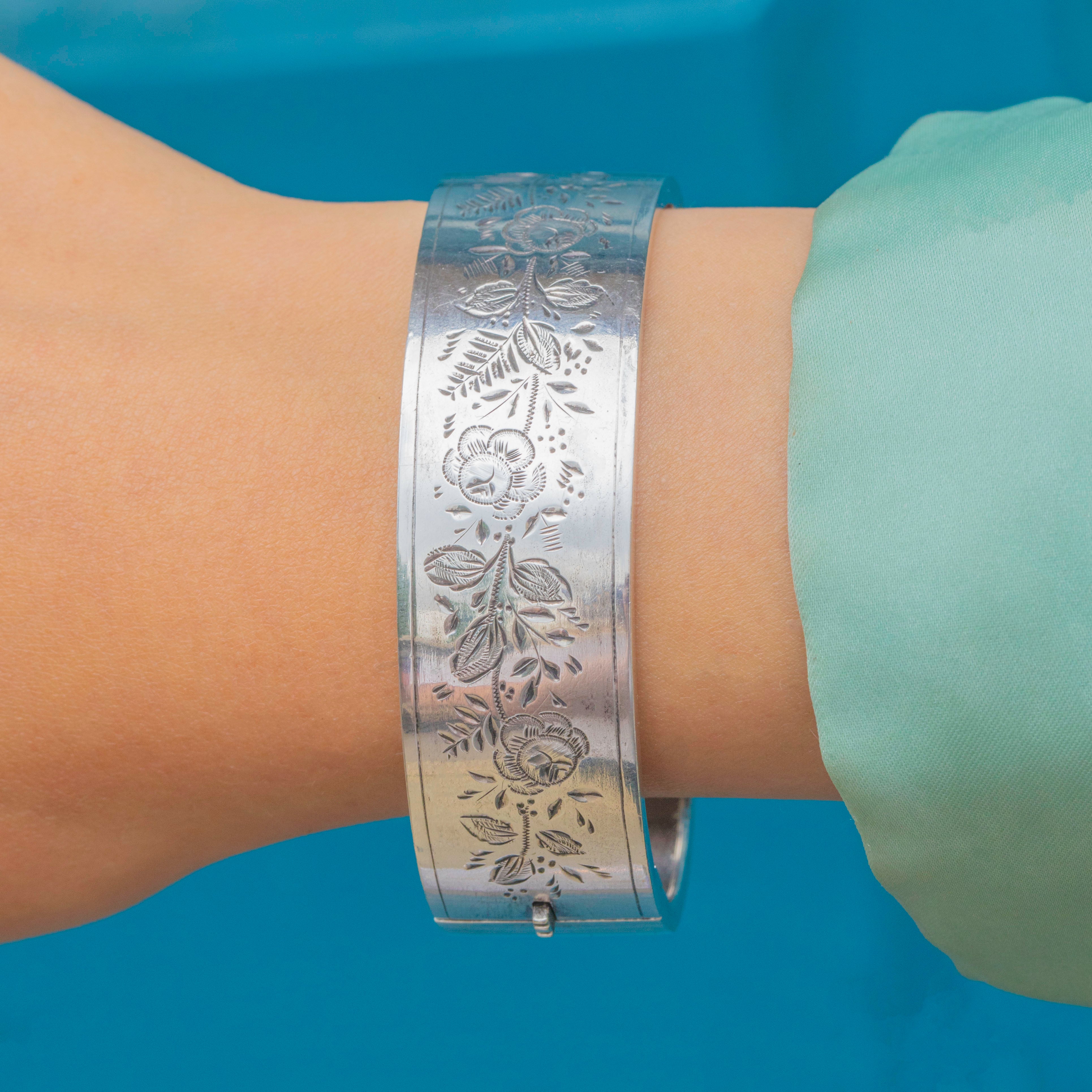 EXCELLENT: The Silver is bright and lustrous and has built a nice patina enhancing the engraved details. There are some minor signs of wear inside the bangle, though this is commensurate with age. Closing with a nice 'click', this Victorian bangle can be worn with confidence.