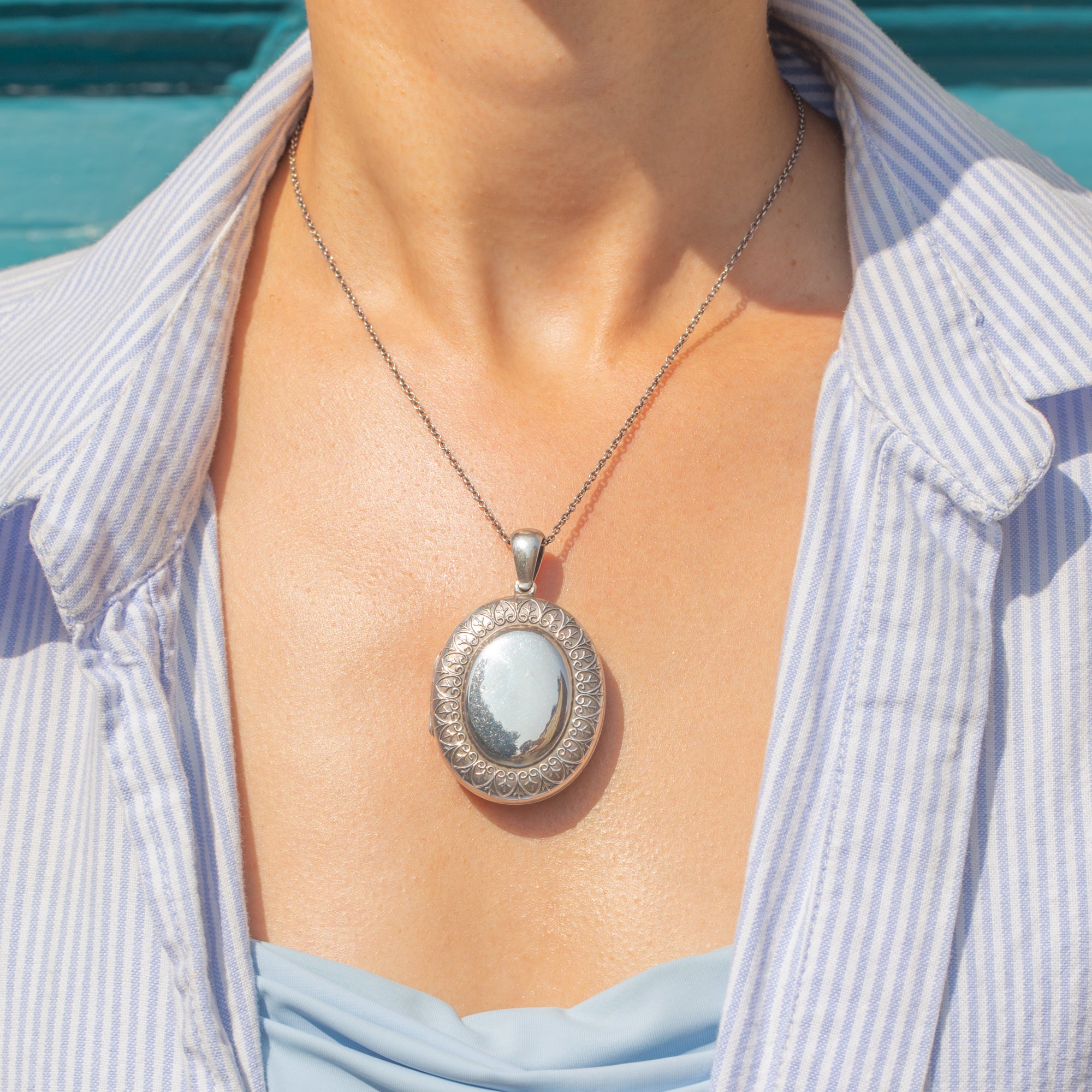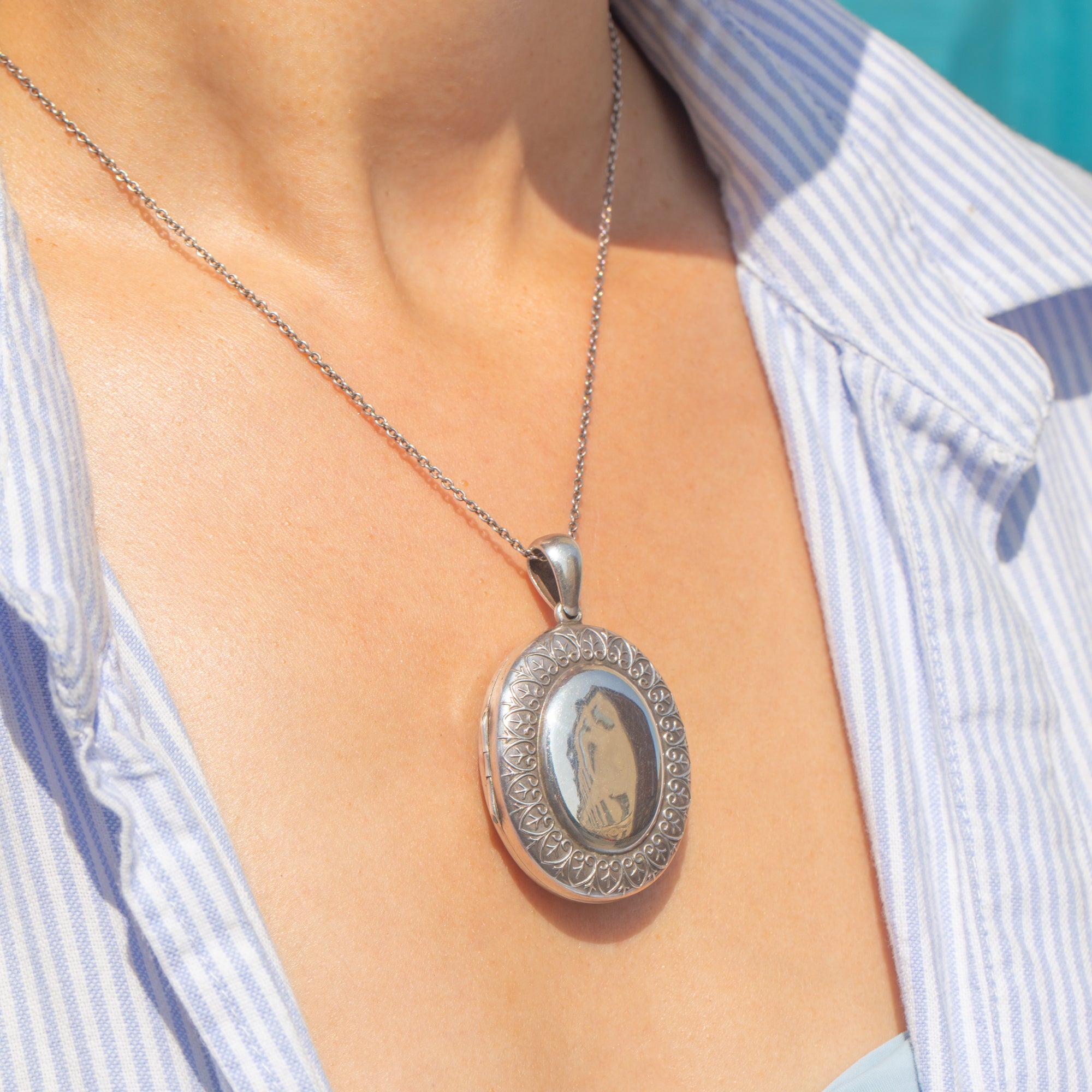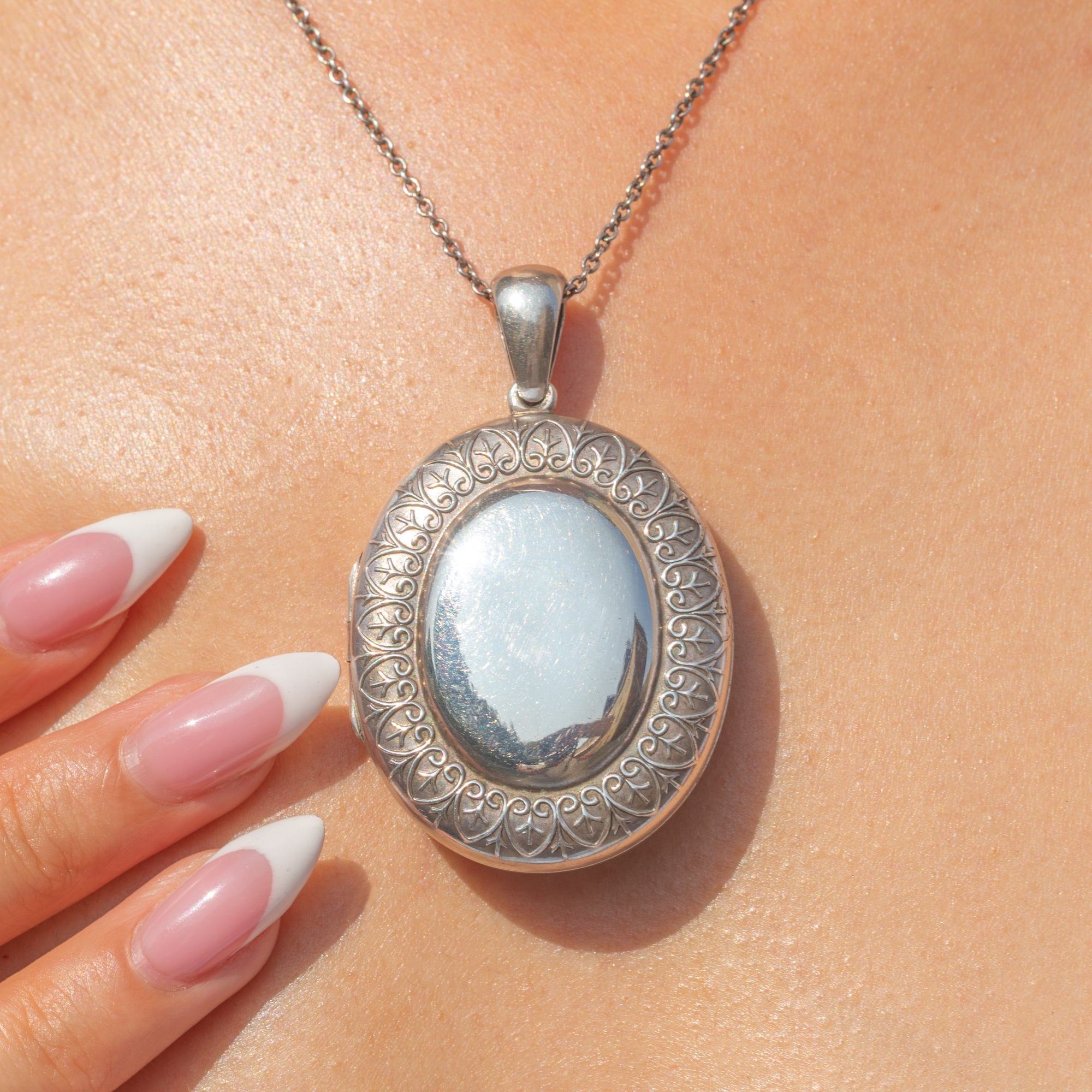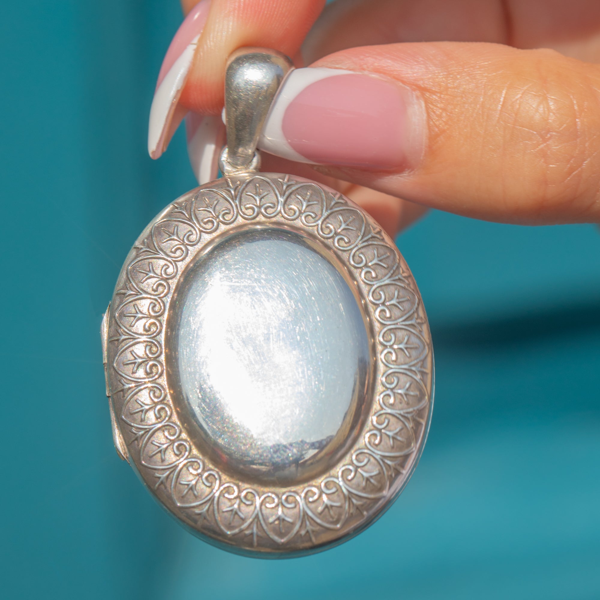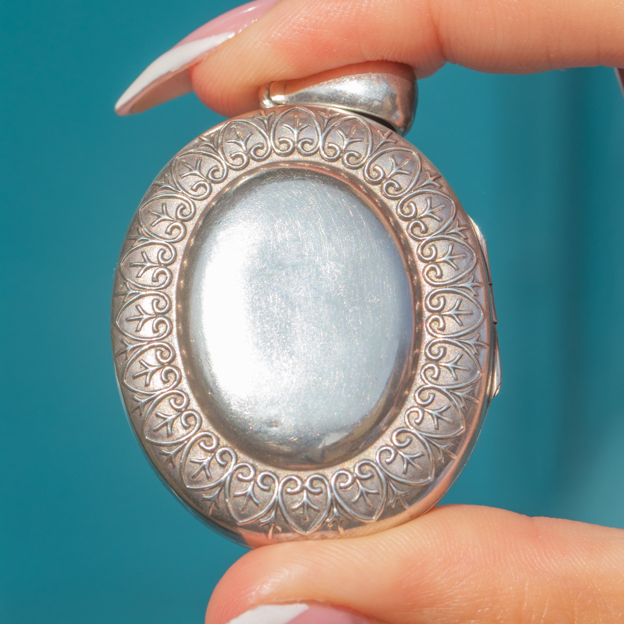 This Victorian Aesthetic locket is crafted from Sterling Silver and bordered by intricate engravings. A larger piece at 18.5 grams, the locket is designed in a generous oval form and is perfect for holding treasured photographs inside.