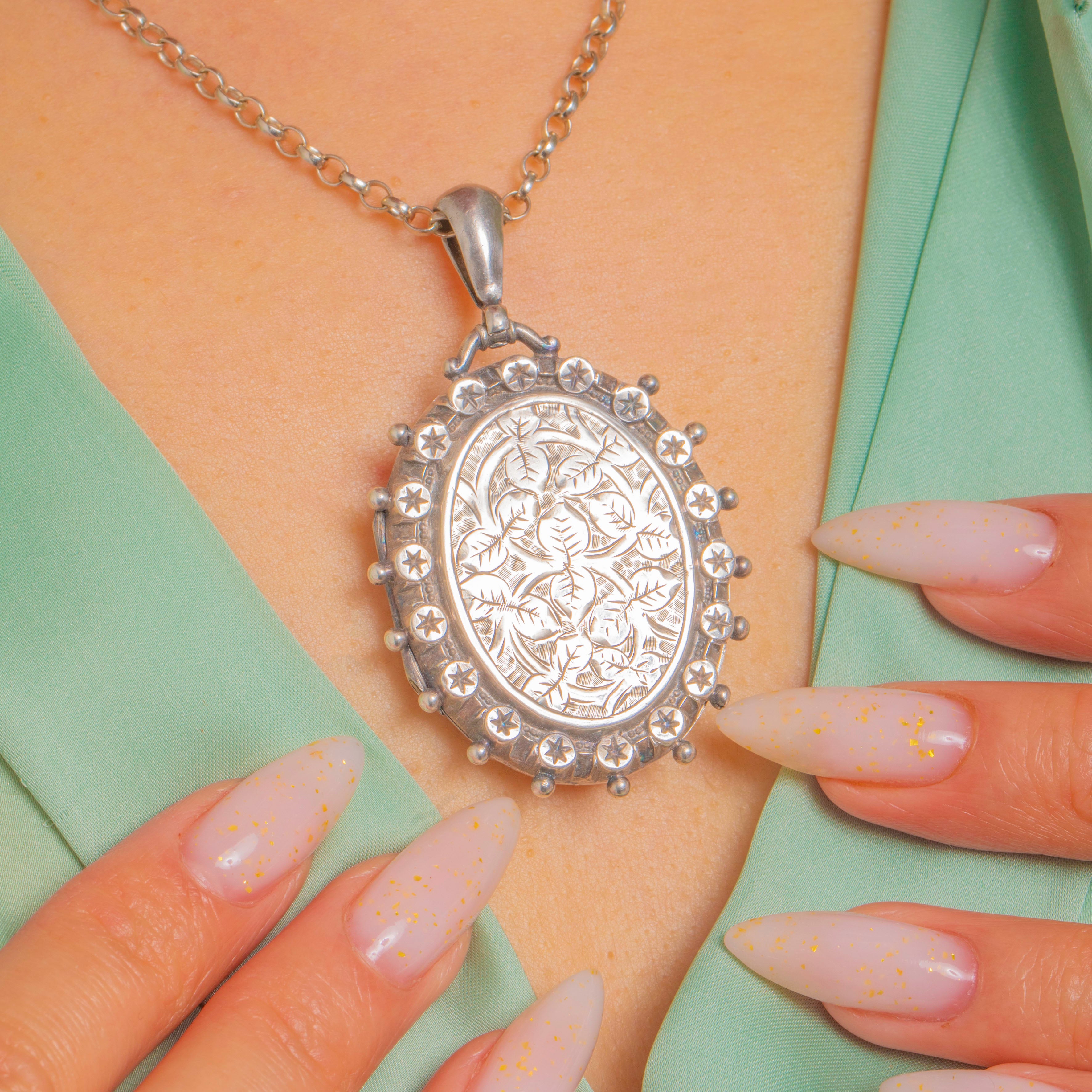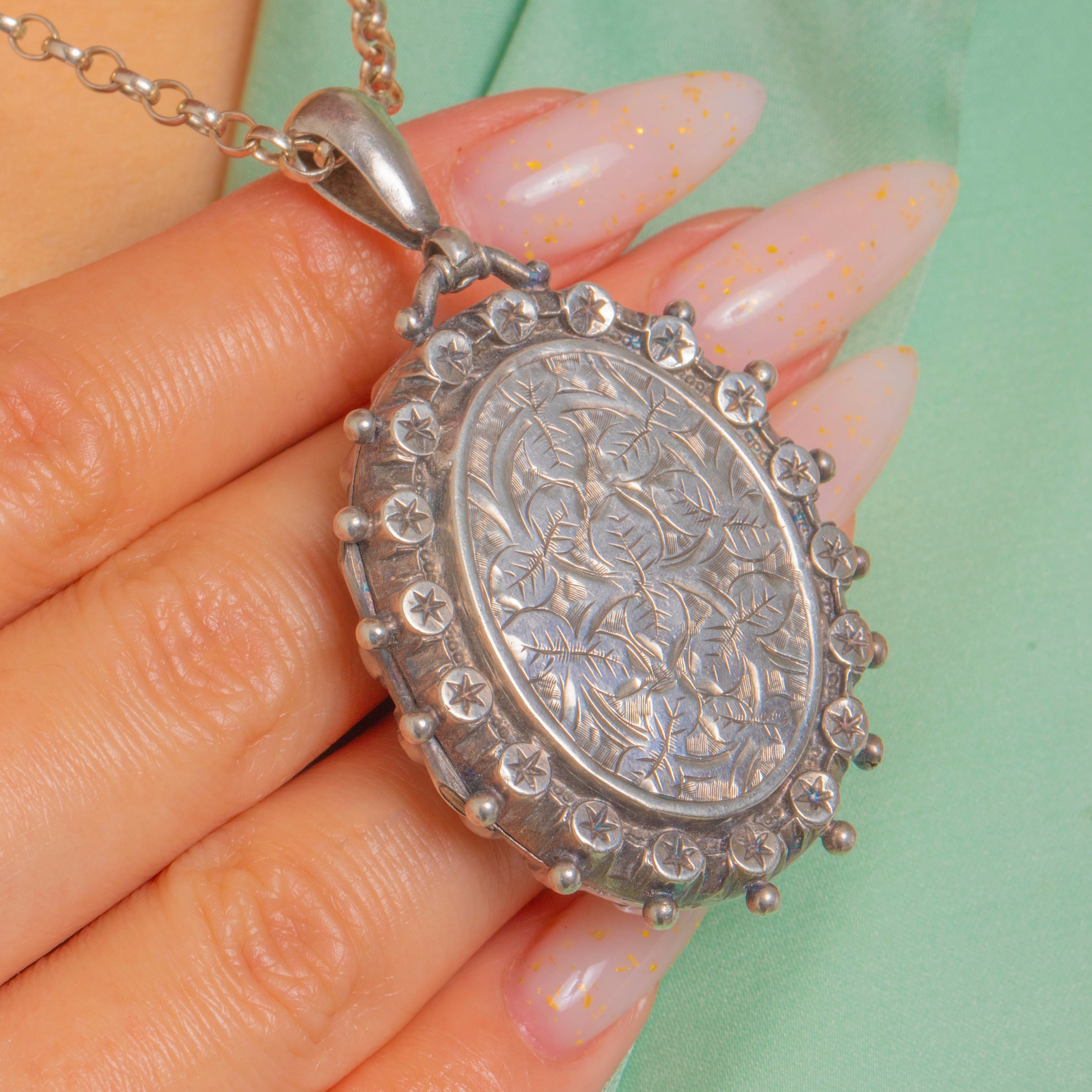 A beautifully characterful Victorian locket, crafted in Sterling Silver and finished with crisp Aesthetic-era star motifs, framed by a decorative beaded border. It’s the kind of piece that feels instantly collectible—ornate without being fussy, and perfect for everyday layering.