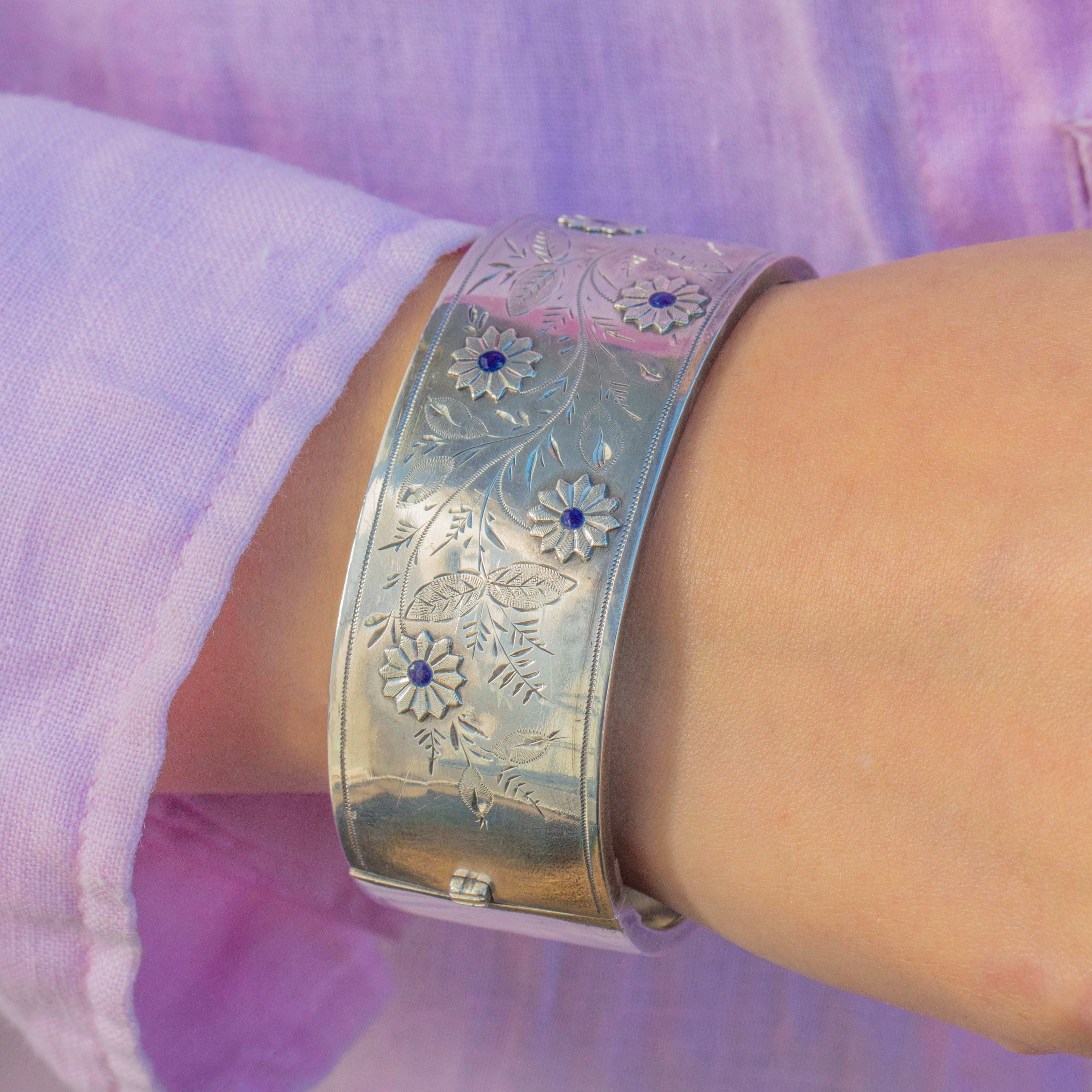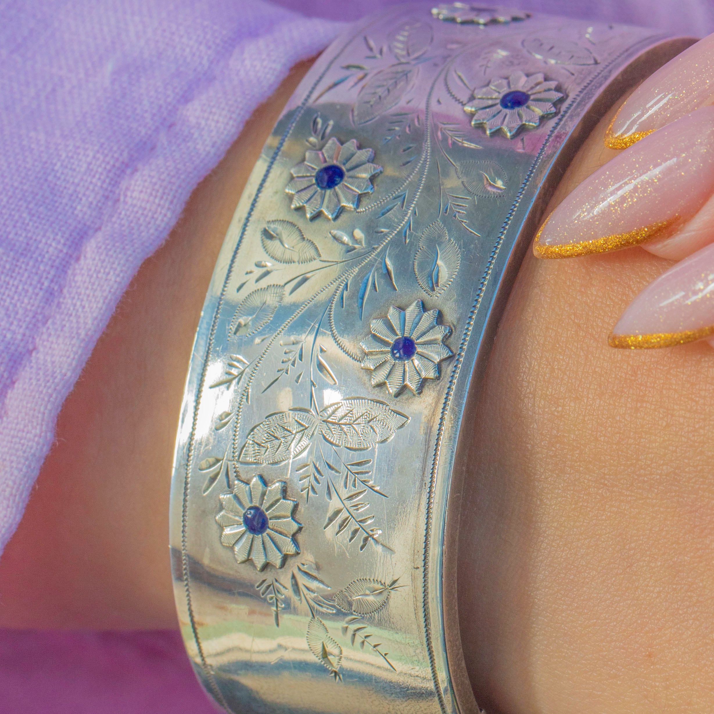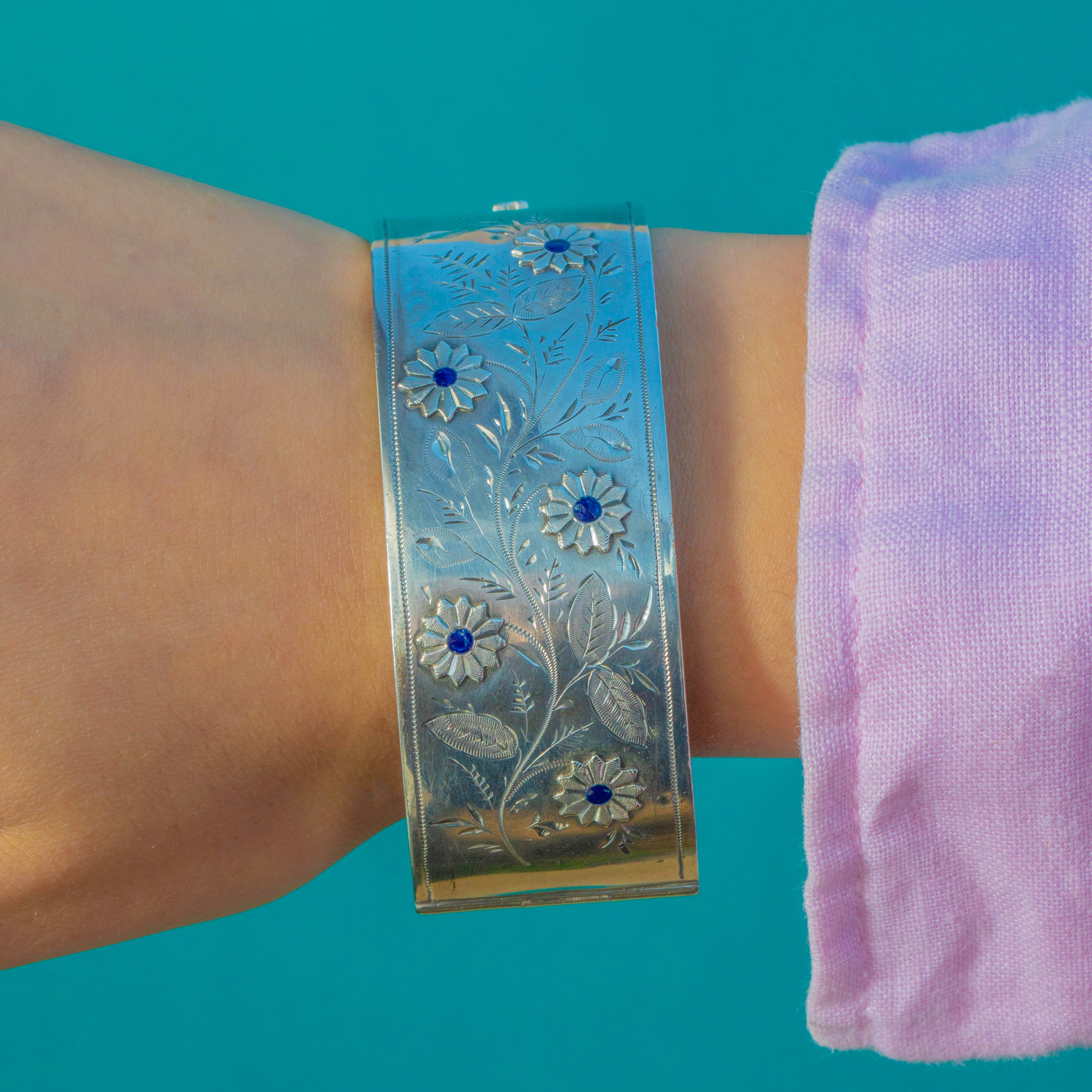 A beautiful Victorian Aesthetic-era bangle crafted in solid Sterling Silver and detailed with charming engraved daisies, each centred with a tiny pop of blue Enamel. Dating firmly to 1880, this piece captures the delicate botanical motifs so loved during the late 19th century, with scrolling leaves, soft curved edges and gentle hand-engraved texture throughout.