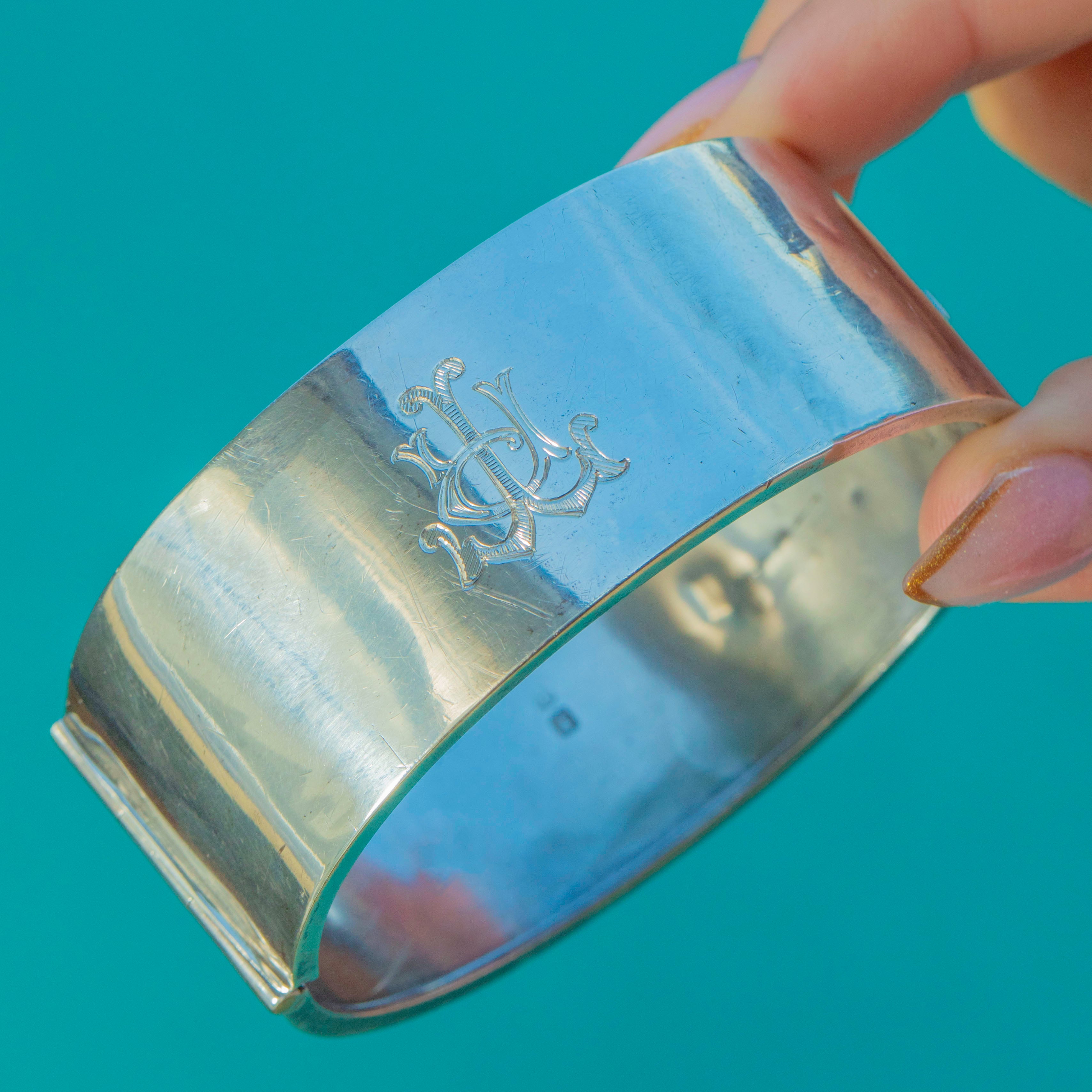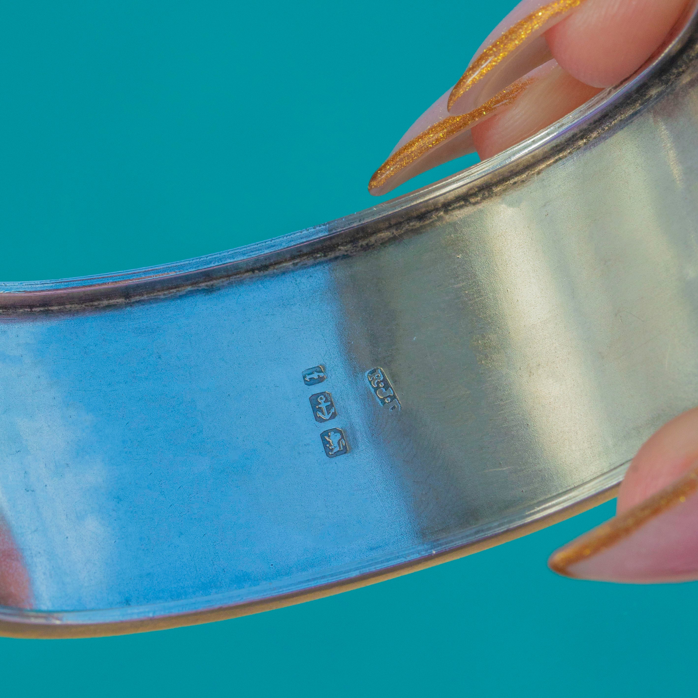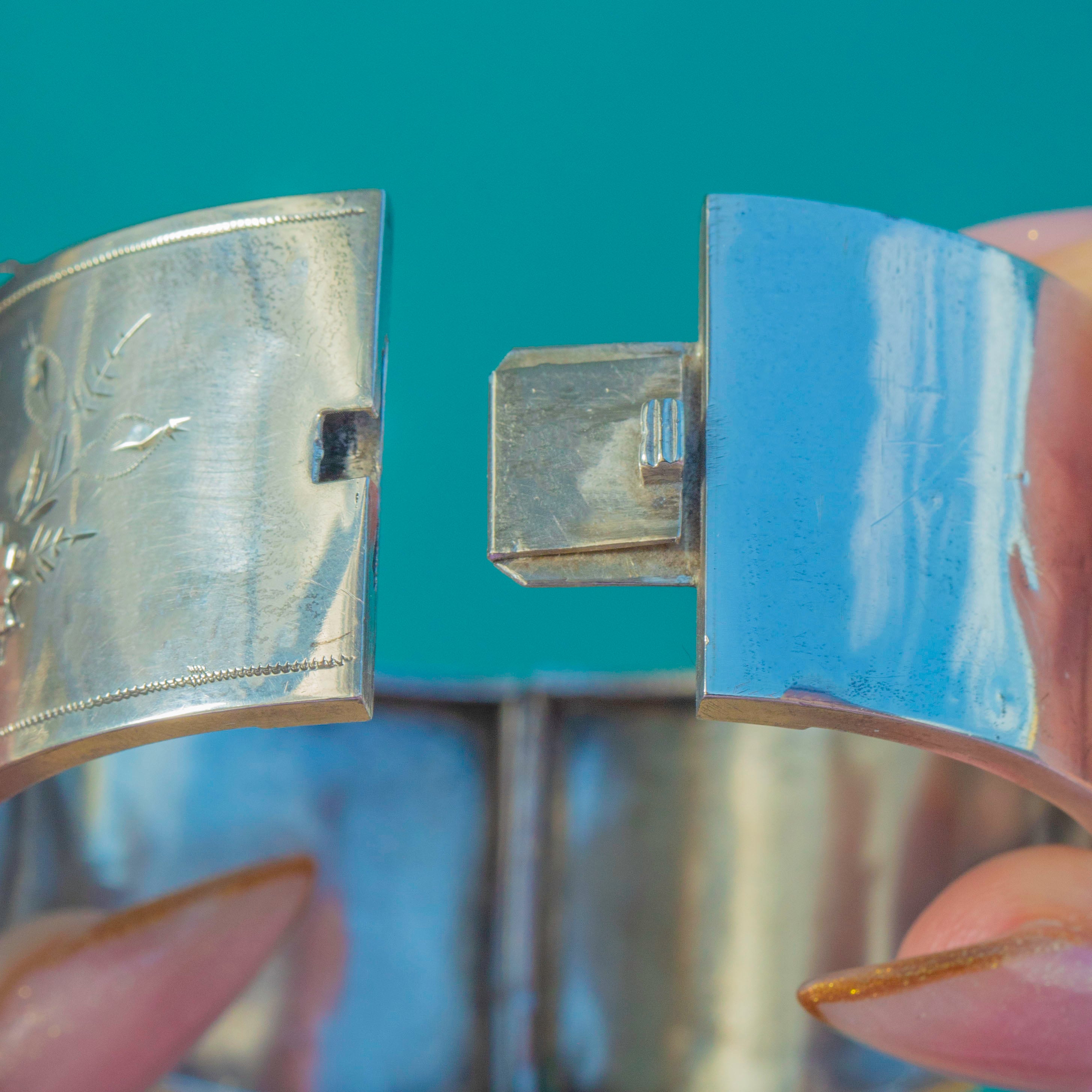 A beautiful Victorian Aesthetic-era bangle crafted in solid Sterling Silver and detailed with charming engraved daisies, each centred with a tiny pop of blue Enamel. Dating firmly to 1880, this piece captures the delicate botanical motifs so loved during the late 19th century, with scrolling leaves, soft curved edges and gentle hand-engraved texture throughout.