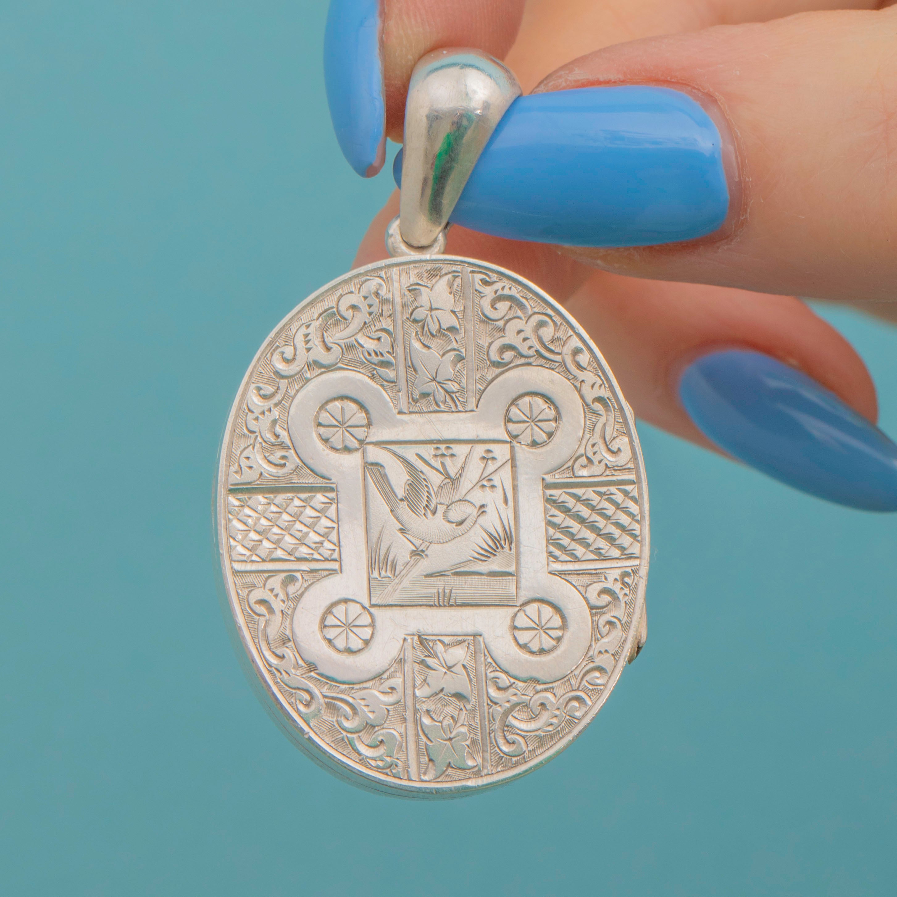 Victorian Aesthetic Silver Engraved Swallow Bird Locket c.1882