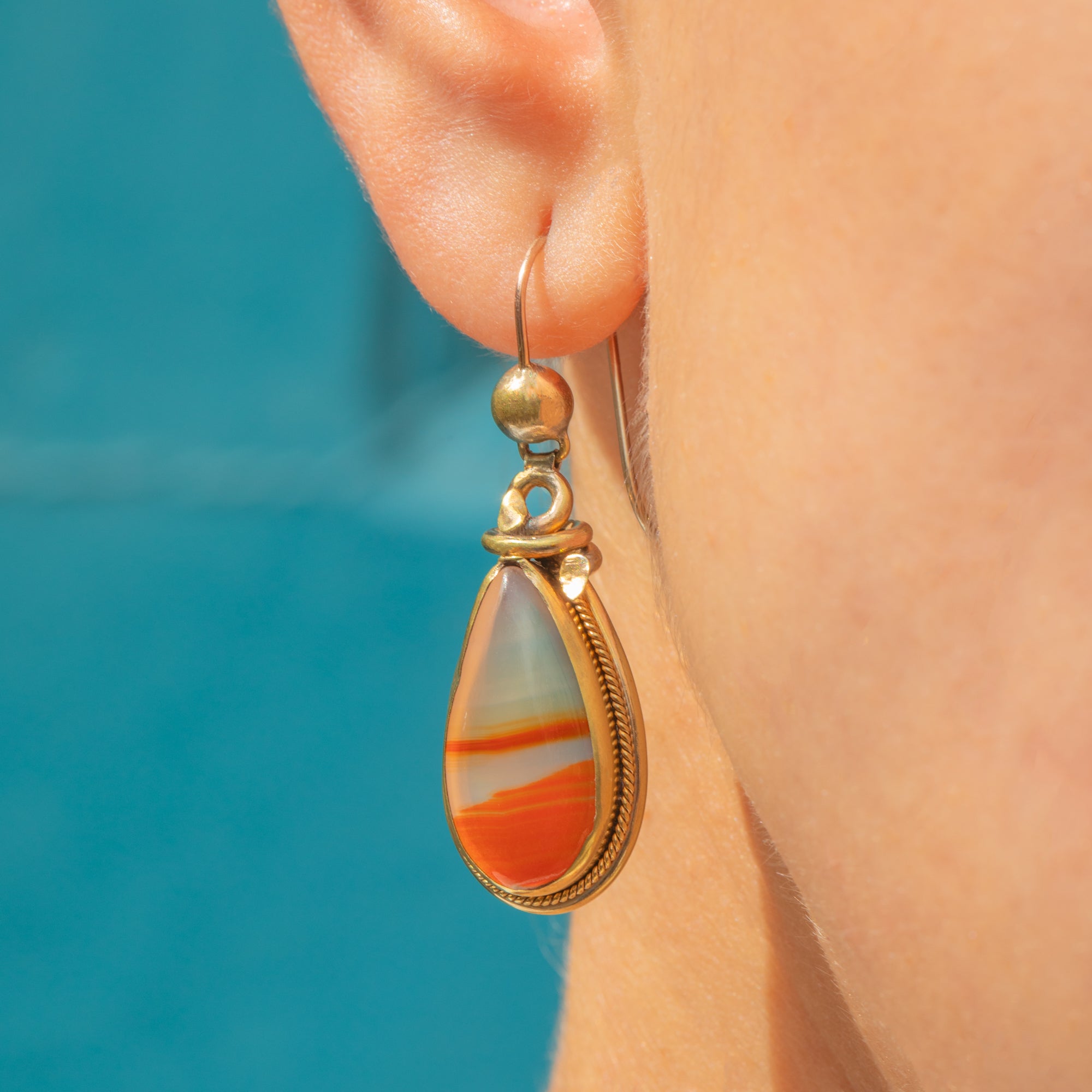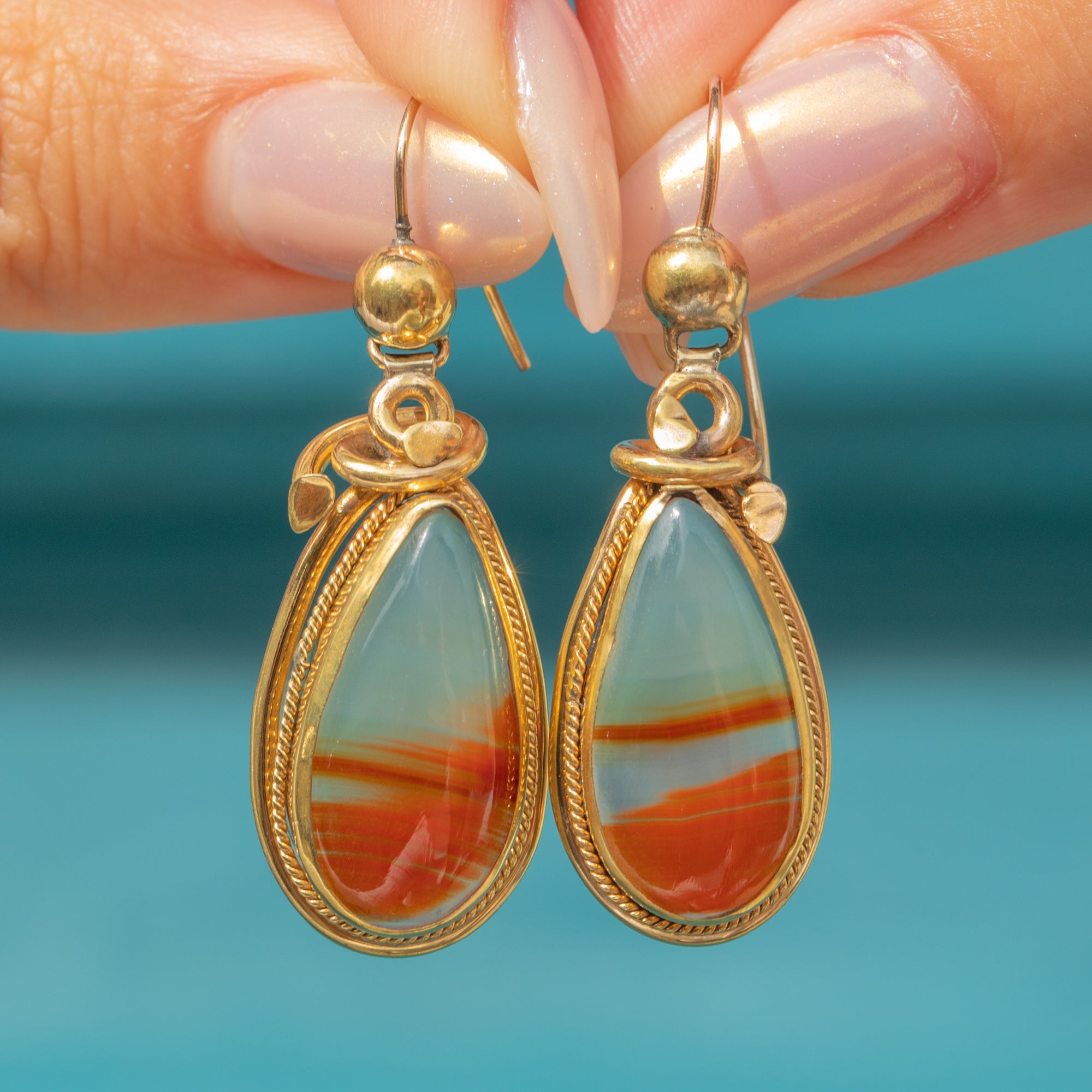 A striking pair of Antique Victorian teardrop earrings set with beautifully banded Agates in painterly tones of russet, orange, and milky white. Each natural cabochon is mounted in a rich Pinchbeck bezel with a rope border detail, enhanced by delicate foliate and bead motifs at the tops. The warm, earthy palette of the Agates gives these earrings a unique character and a timeless natural beauty.