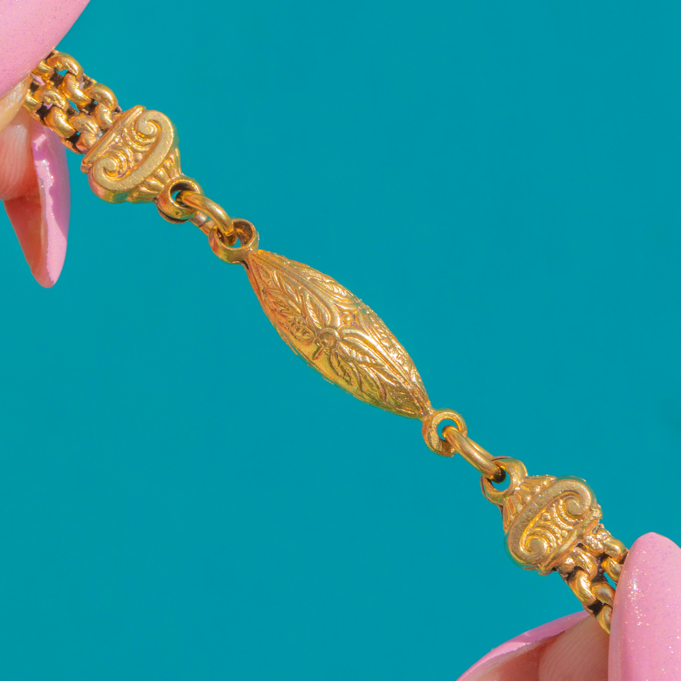 A richly detailed Victorian Albertina bracelet, this golden beauty brings together multiple ornate chain sections with classical engraving and a silken tassel for that quintessential 19th-century flourish. The warm Gold gilding highlights chased foliate scrollwork and fluted accents, while the sculpted terminals flow into a tactile urn-acorn finial topped with a delicate tassel.