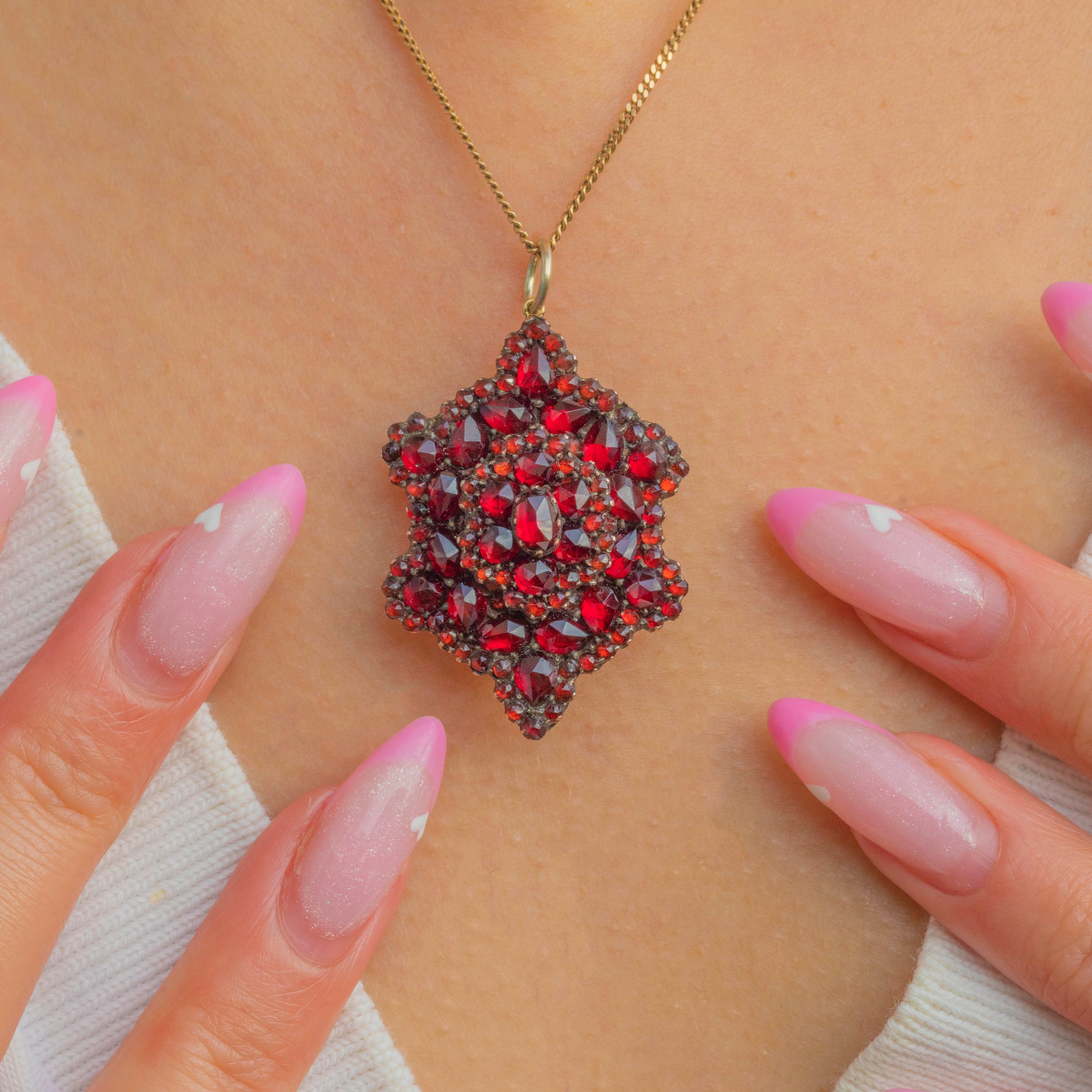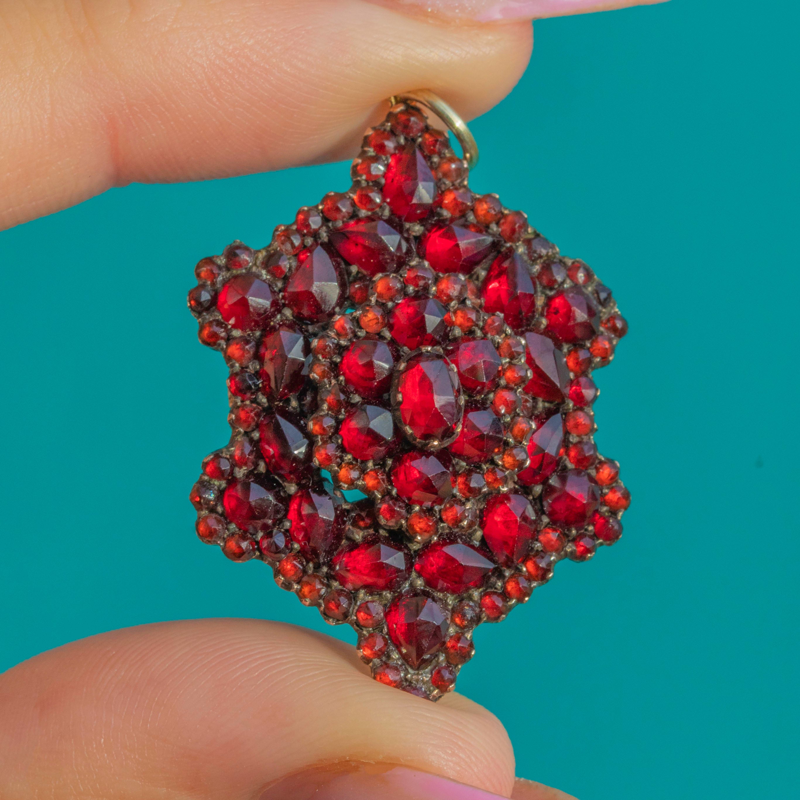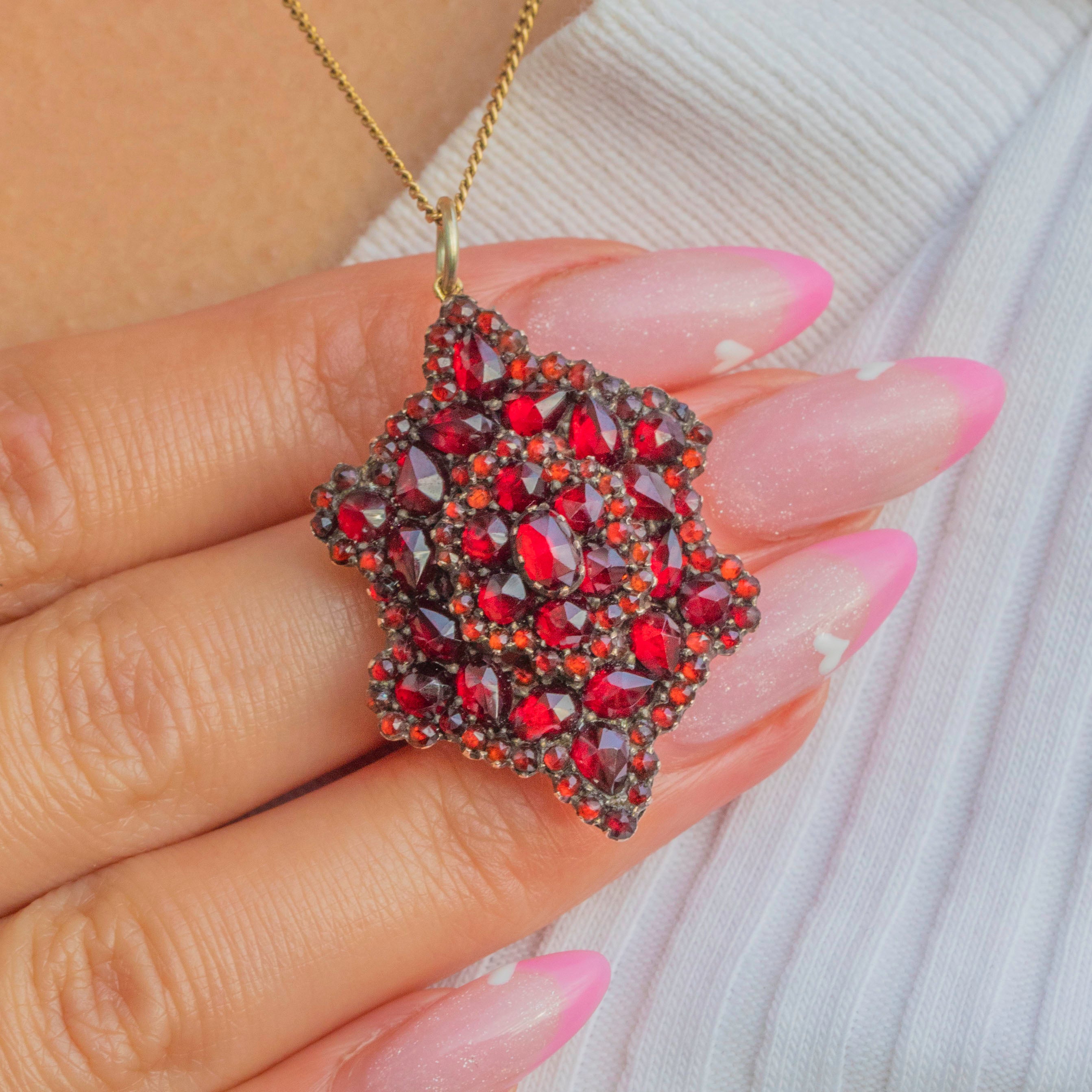 This sumptuous Victorian Bohemian Garnet pendant captures all the opulent beauty of the mid-19th century. A cluster of deep red Garnets forms a radiant bloom, each gem hand-set in richly toned “Garnet Gold” metal with a locket back for a sentimental photograph or token.