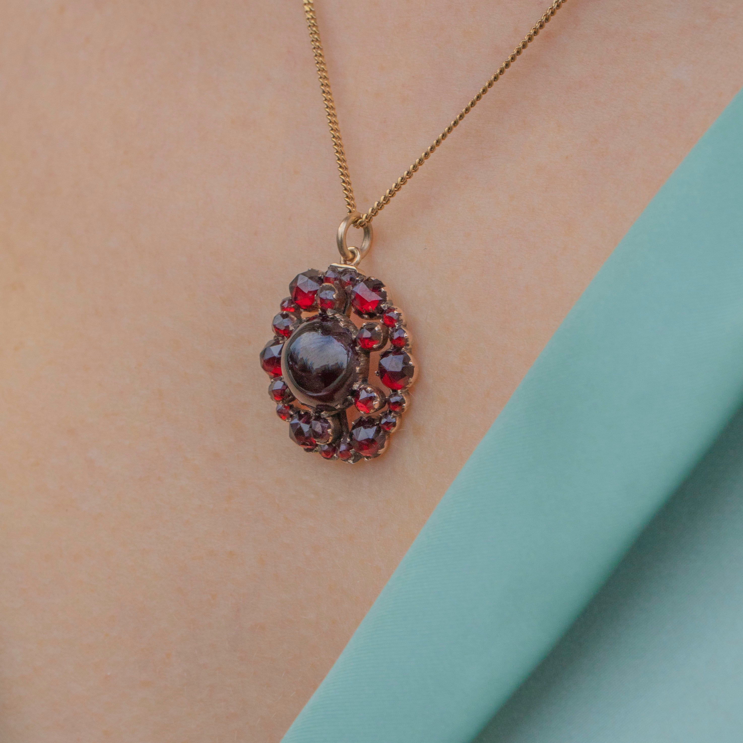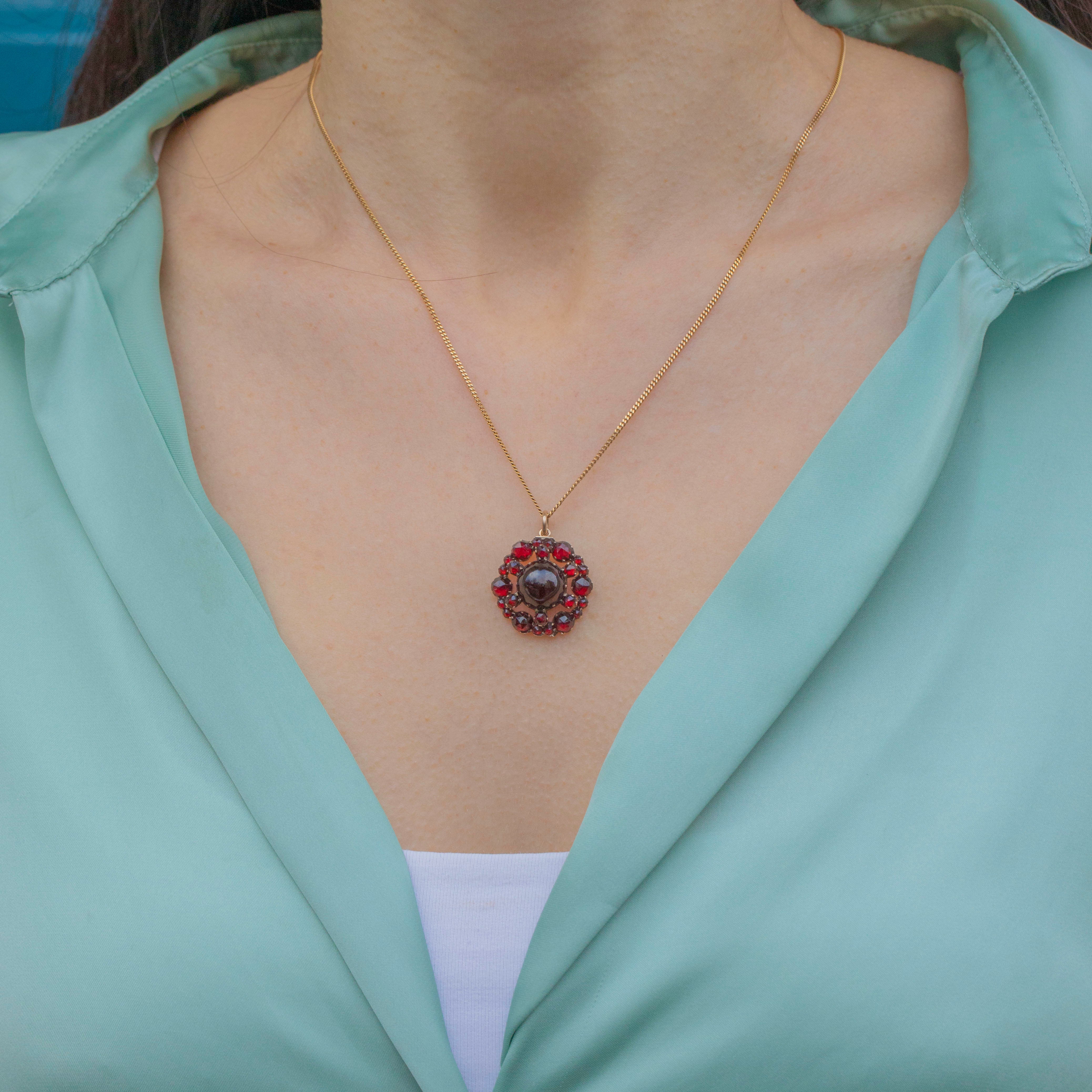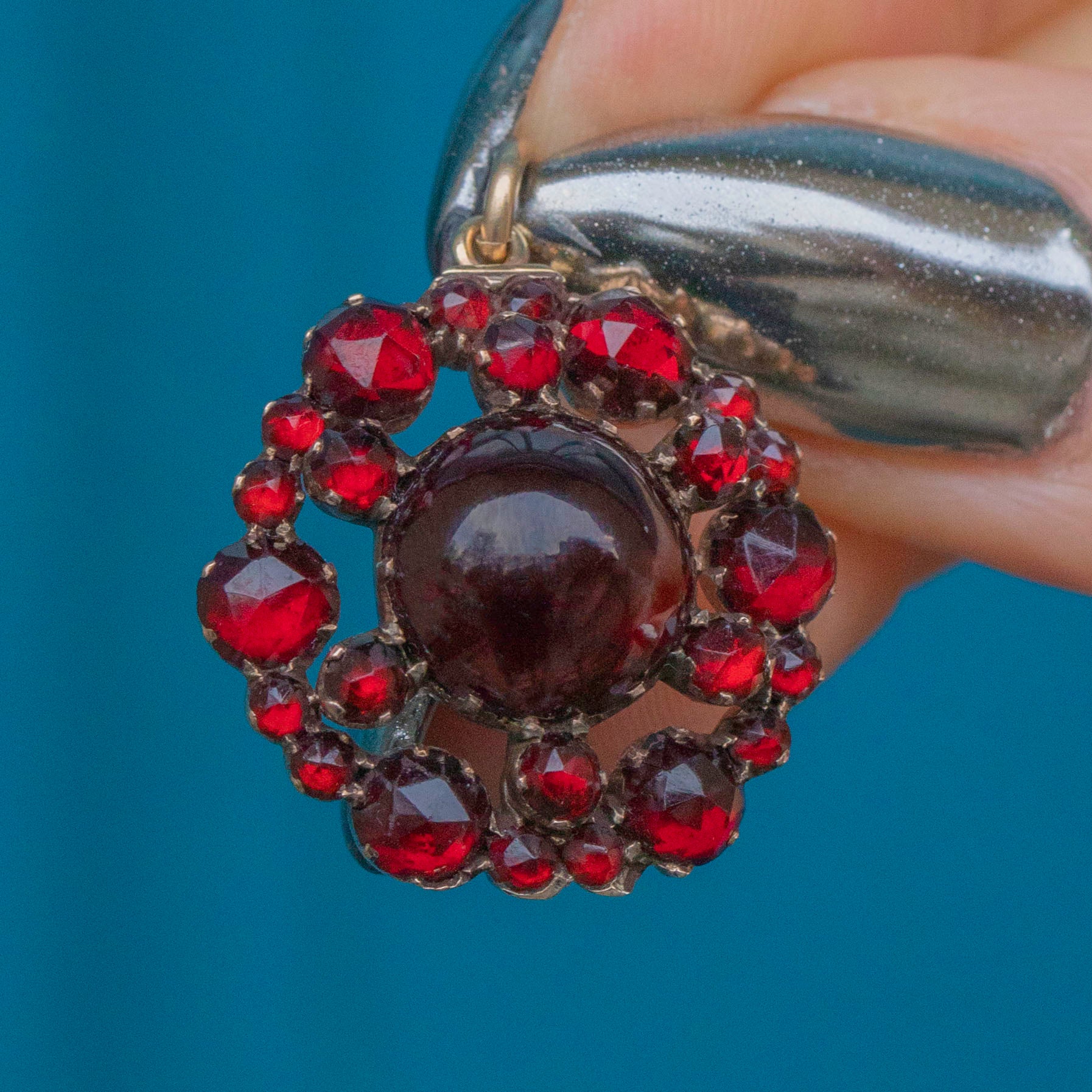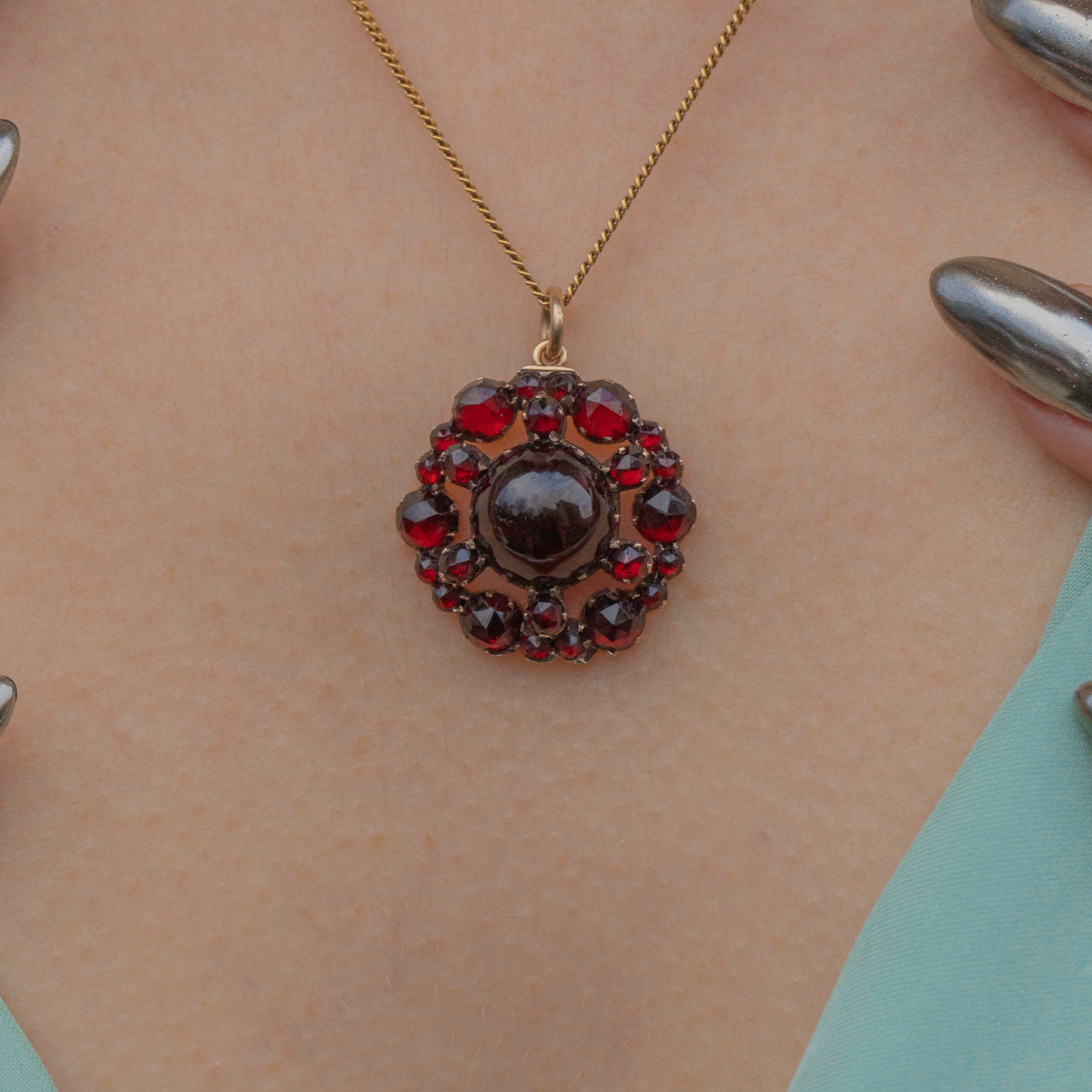A stunning Victorian Bohemian Garnet flower pendant! This pendant is bursting with rich cranberry hues, with a central cabochon-cut Garnet surrounded by glistening rose-cuts.