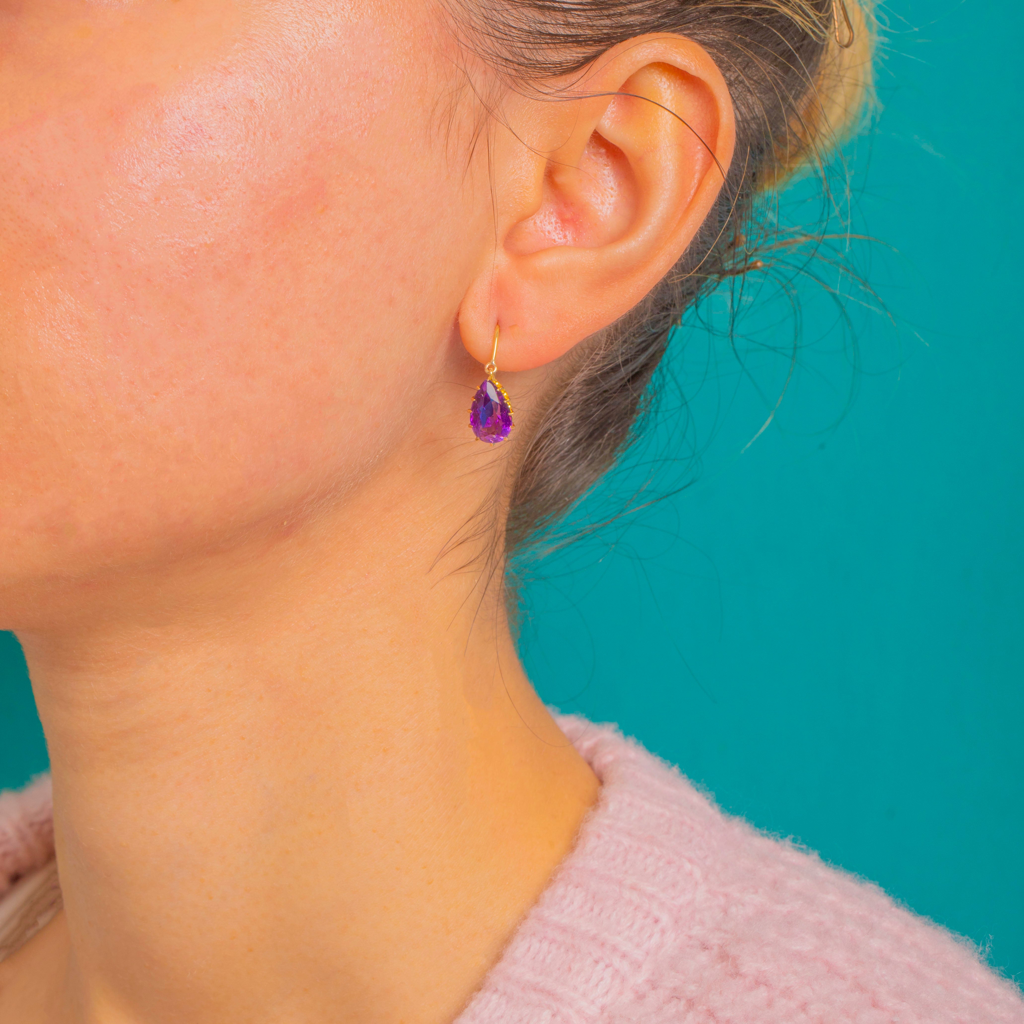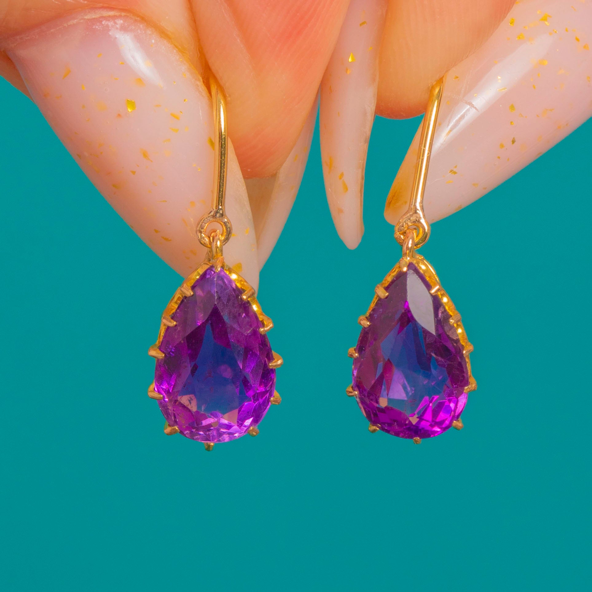 An elegant pair of 15ct Gold pear-drop Amethyst earrings, each set with a faceted pear Amethyst in a scalloped multi-prong collet and suspended from a simple shepherd-hook wire.