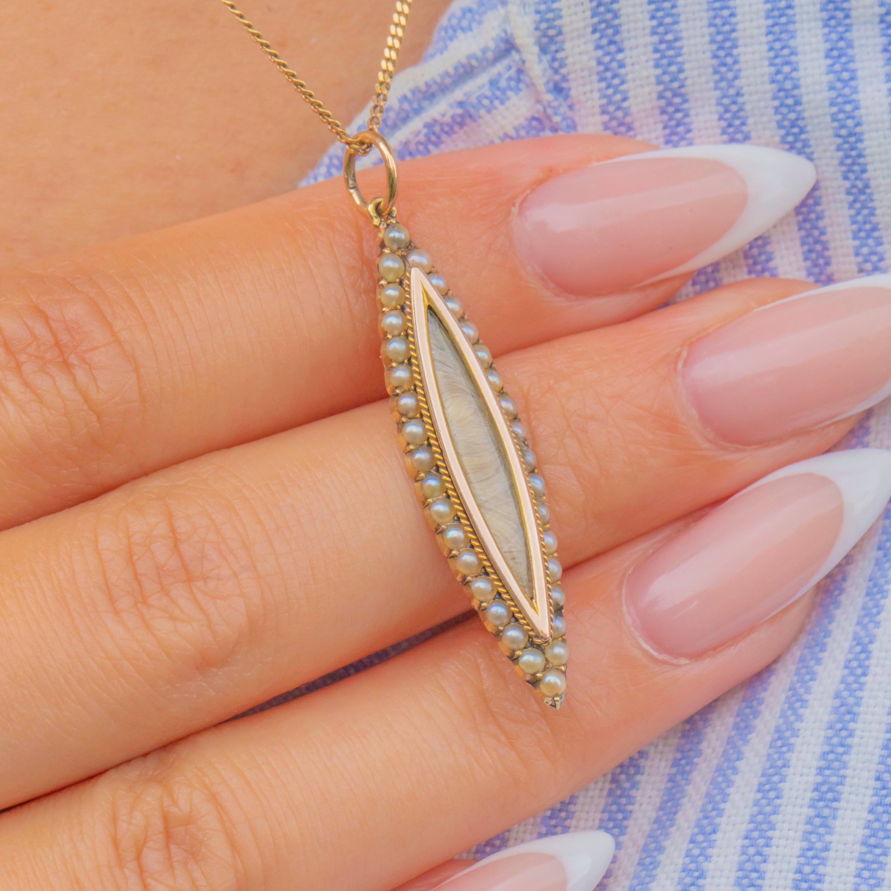 EXCELLENT: Light surface wear and fine scratches consistent with age; no dents or splits noted. The navette frame remains true with crisp edges and the 18ct jump ring is secure. Central hair compartment is intact and can be opened to remove the blonde hair if desired.