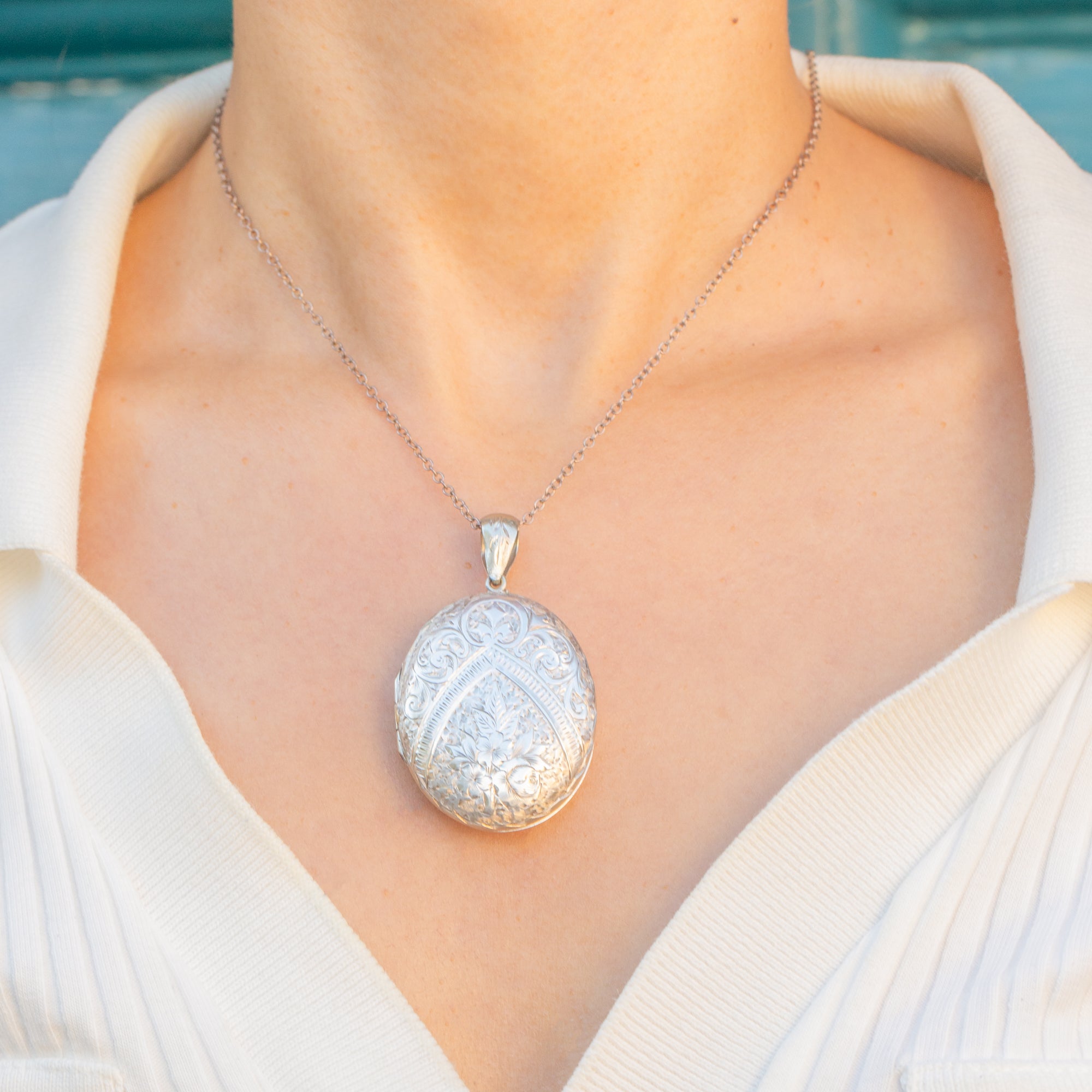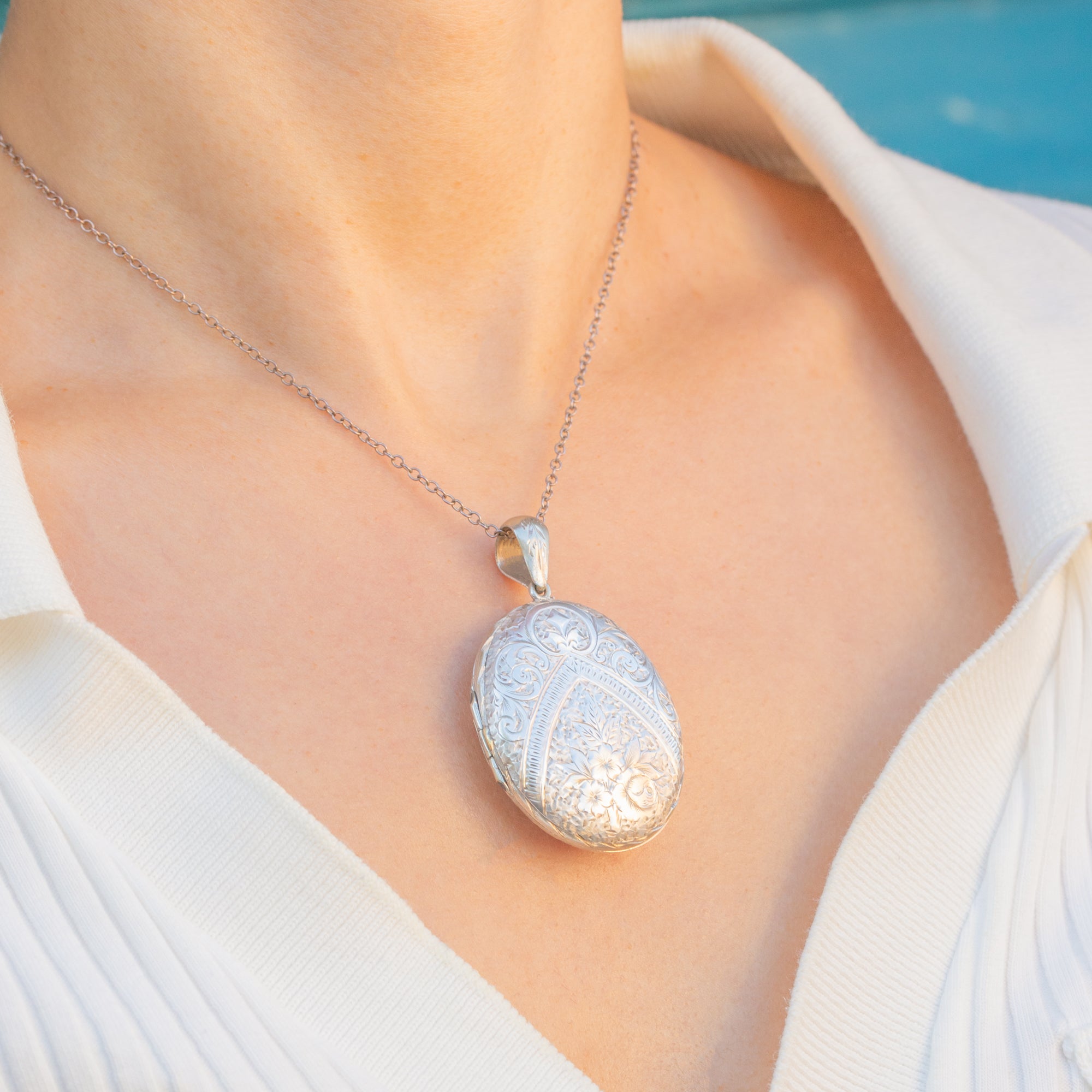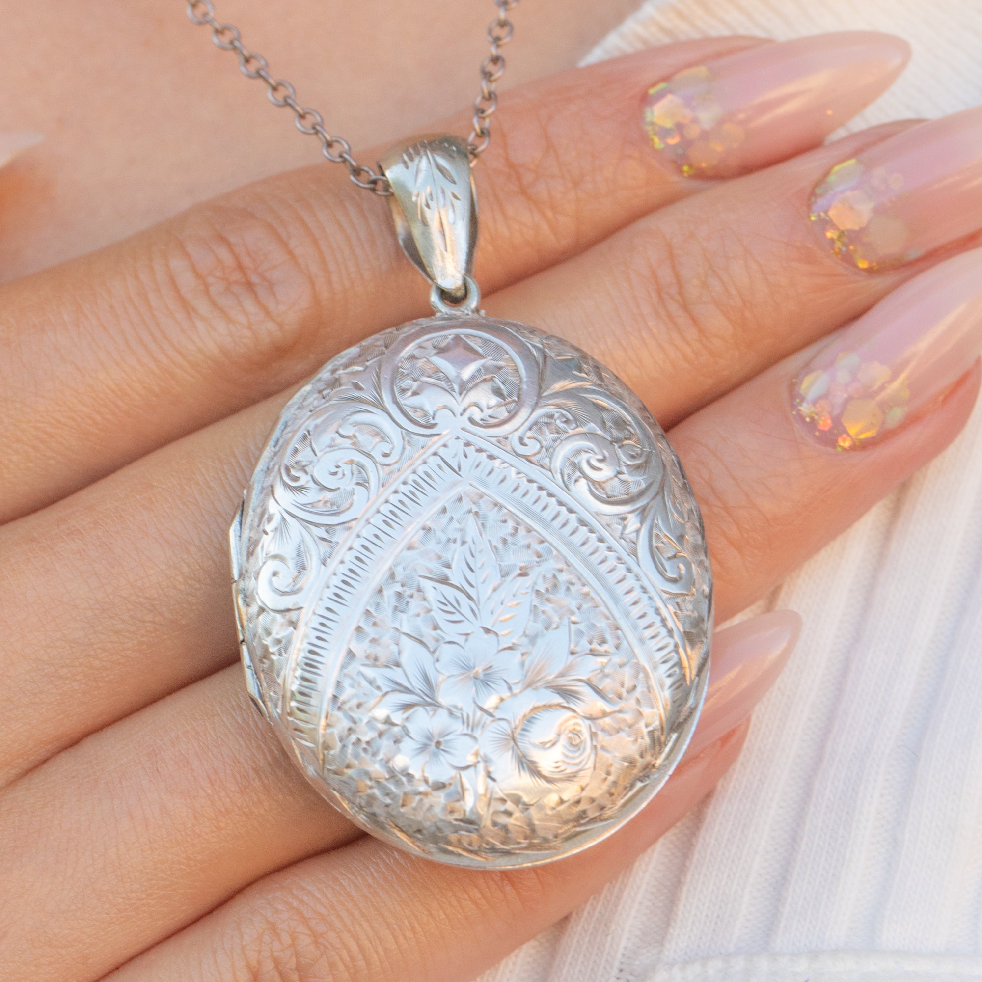 This impressive Victorian Silver locket is a true statement piece, brimming with character and charm. Crafted in the late 19th century, its generous oval body is decorated with ornate engraving, from scrolling flourishes at the top to a romantic bouquet of roses and foliage below. The design is wonderfully crisp, with fine detailing that catches the light beautifully.