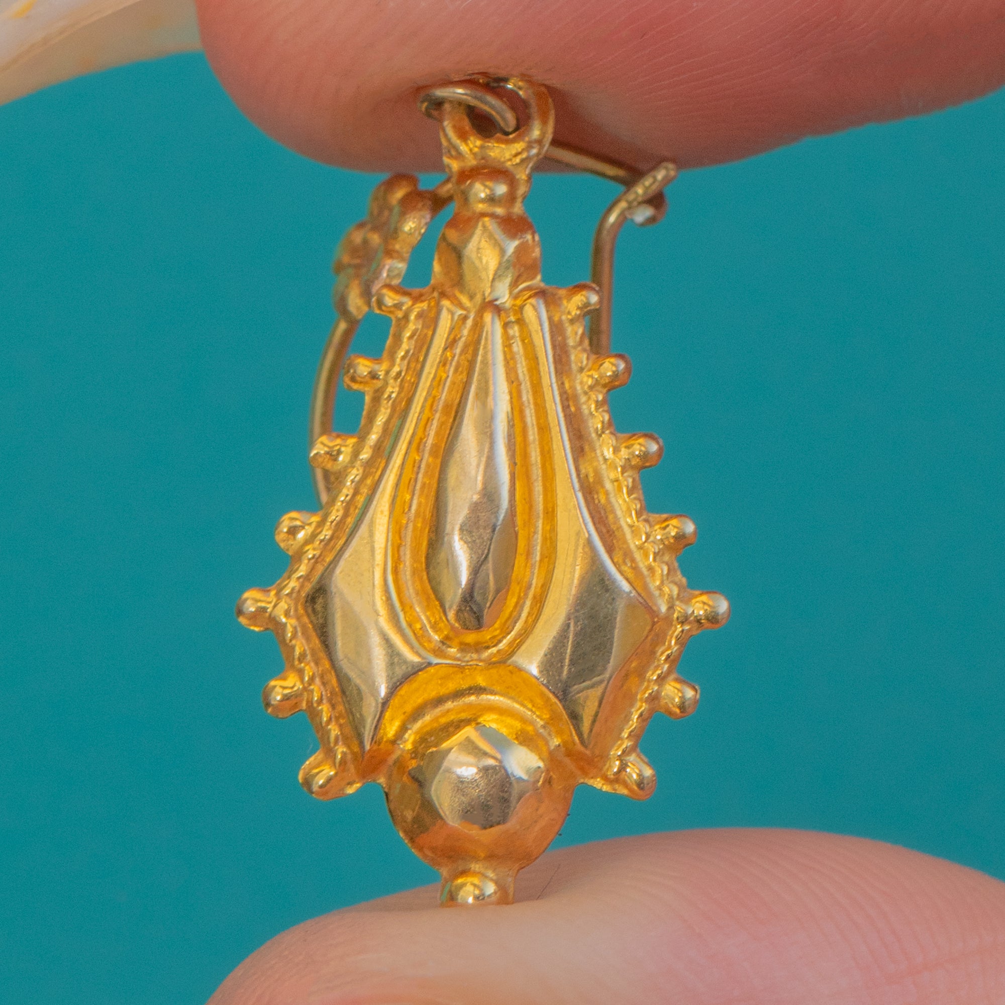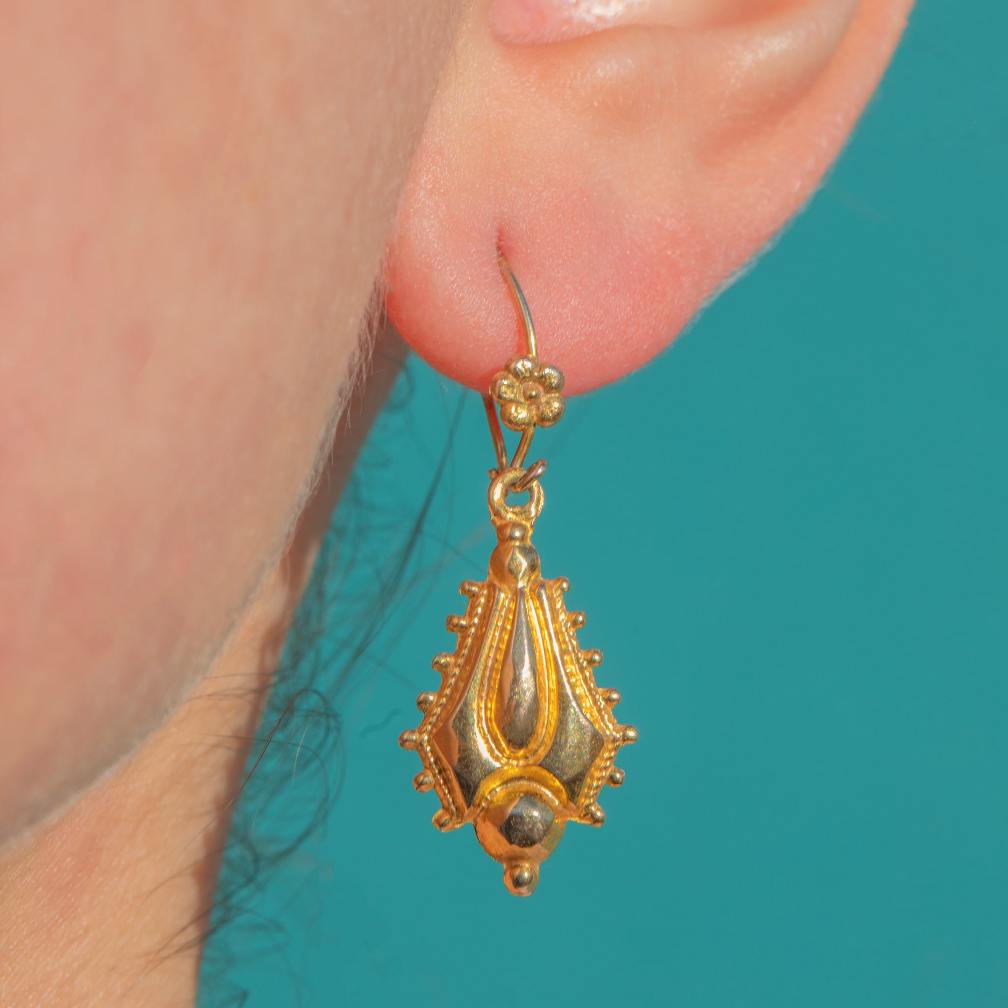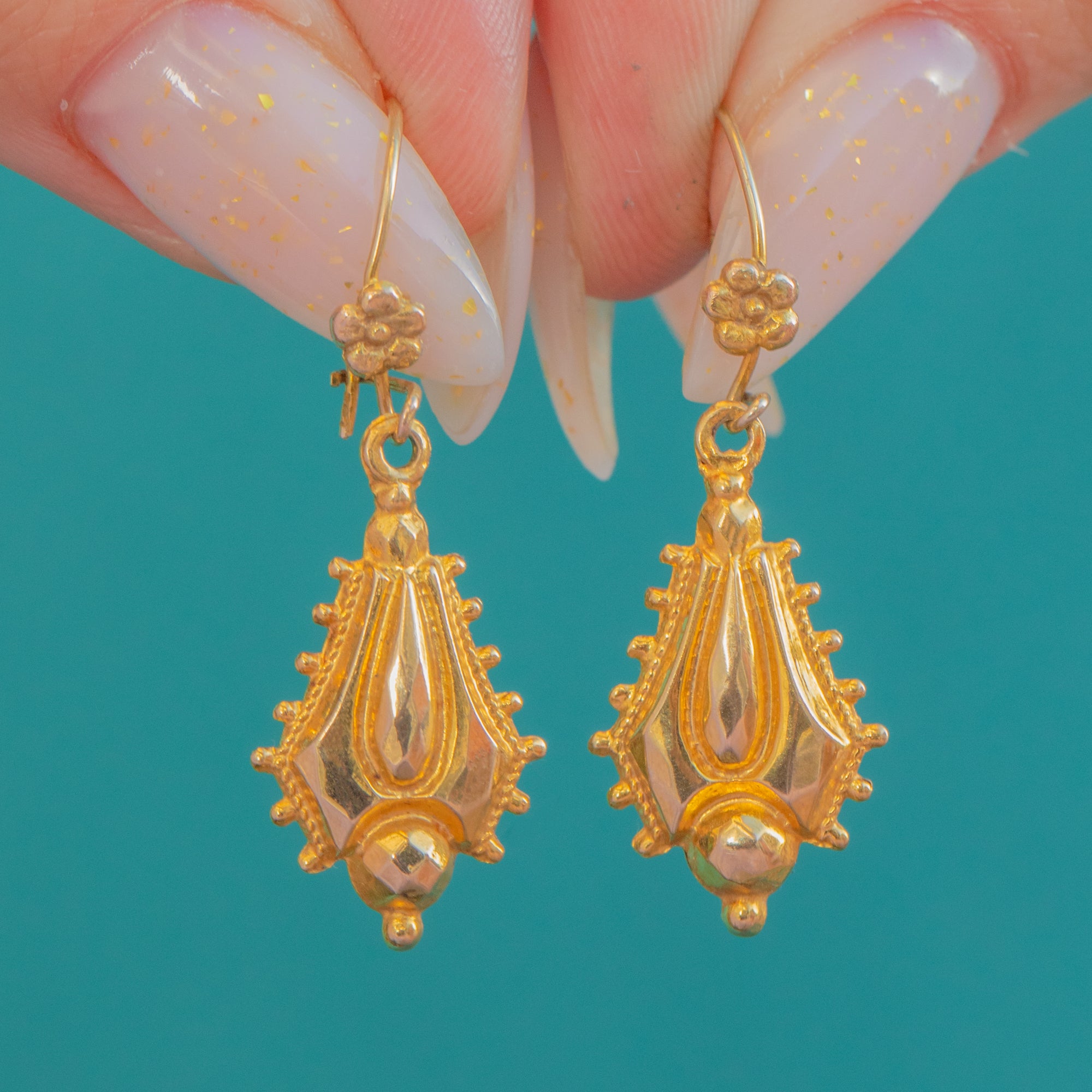 Quintessential Victorian Etruscan Revival elegance in 9ct Gold, these articulated drops pair floral rosette surmounts with sculptural navette-shaped shields richly embellished with granulation-style beading and fine wirework. A charming domed knop finial completes the silhouette, while the relief and detailing catch the light beautifully with every movement.
