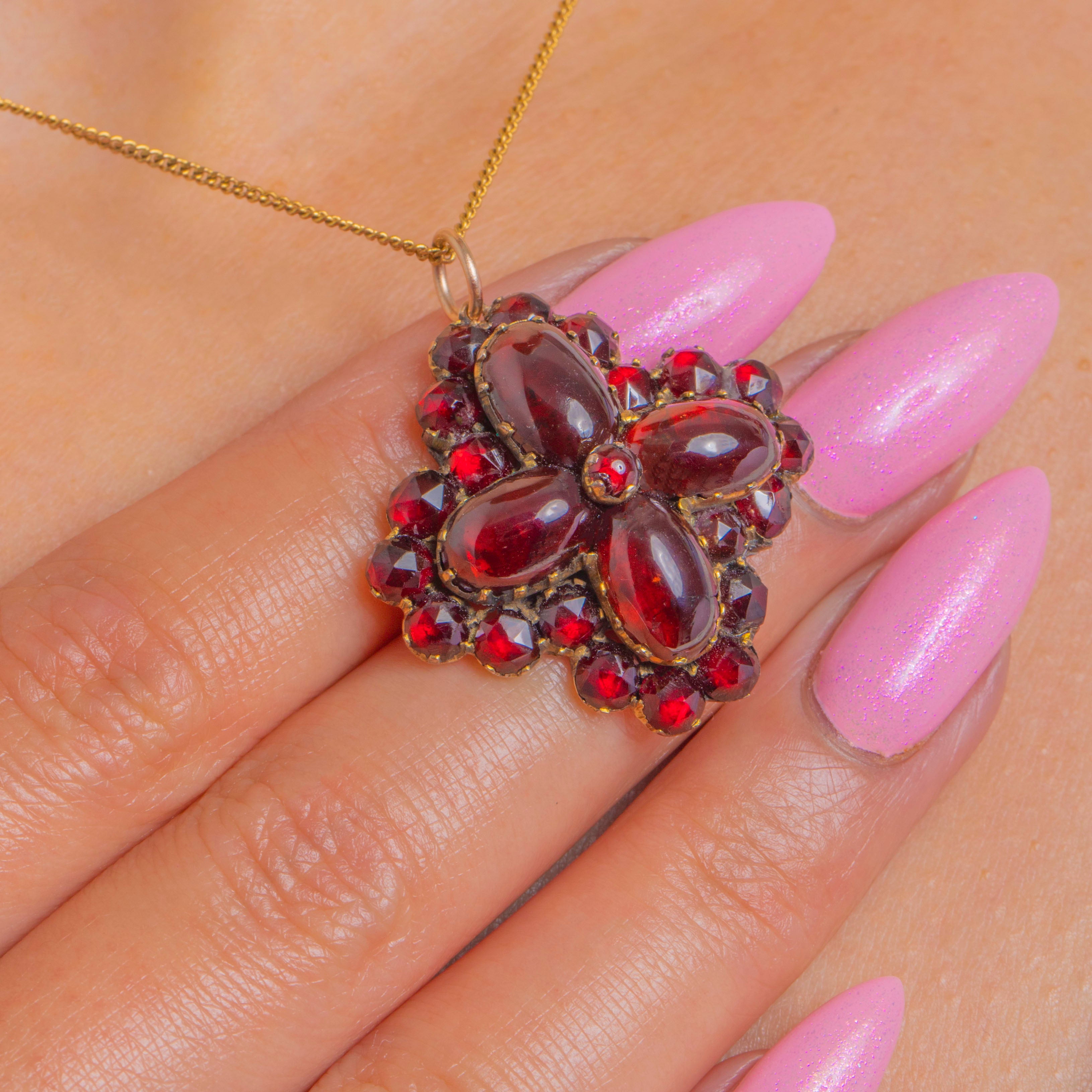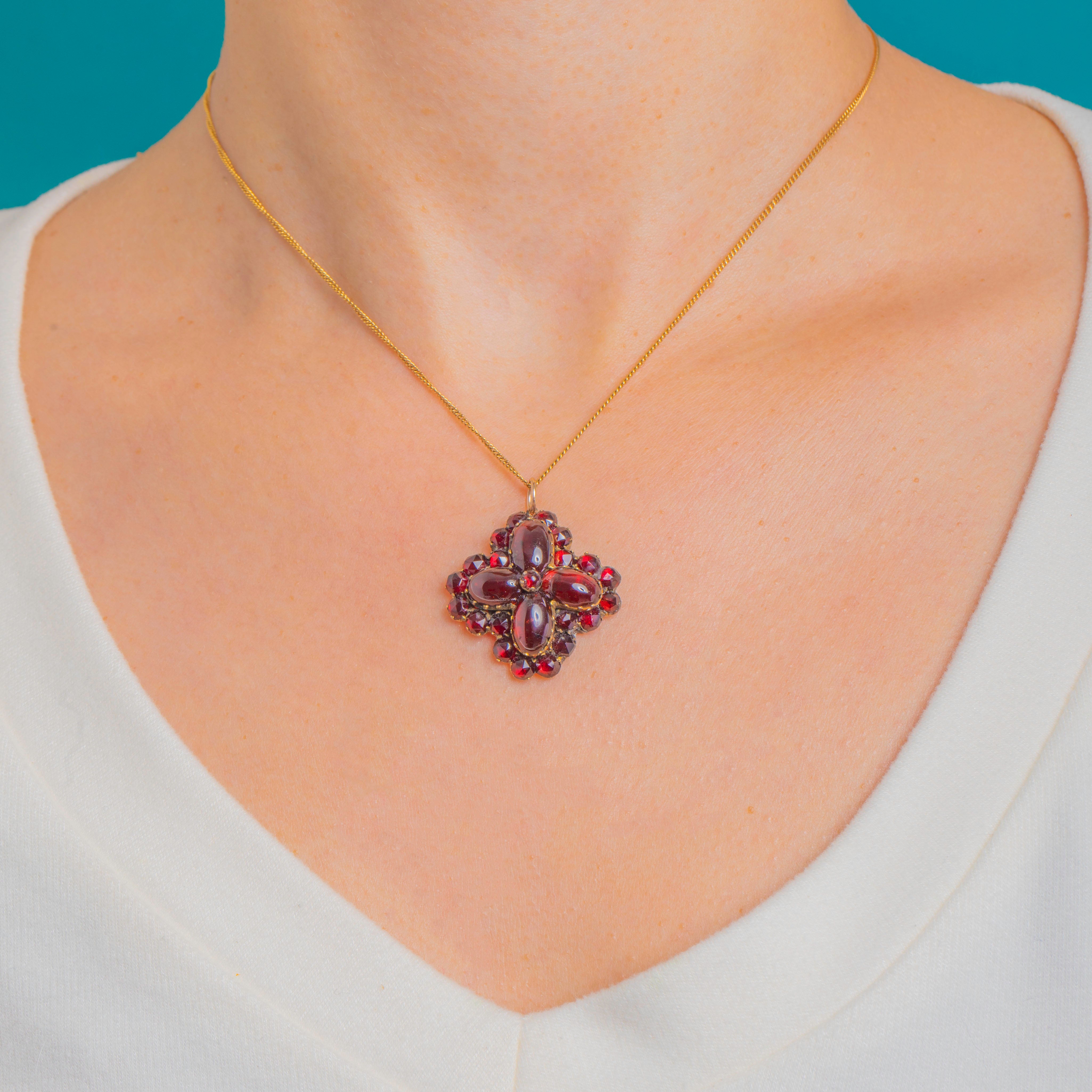 Rich, romantic and unmistakably Victorian in spirit, this Garnet cluster pendant delights with a sumptuous quatrefoil of domed cabochons, haloed by a tight row of petite rose-cut Garnets for a vivid, ruby-red glow.