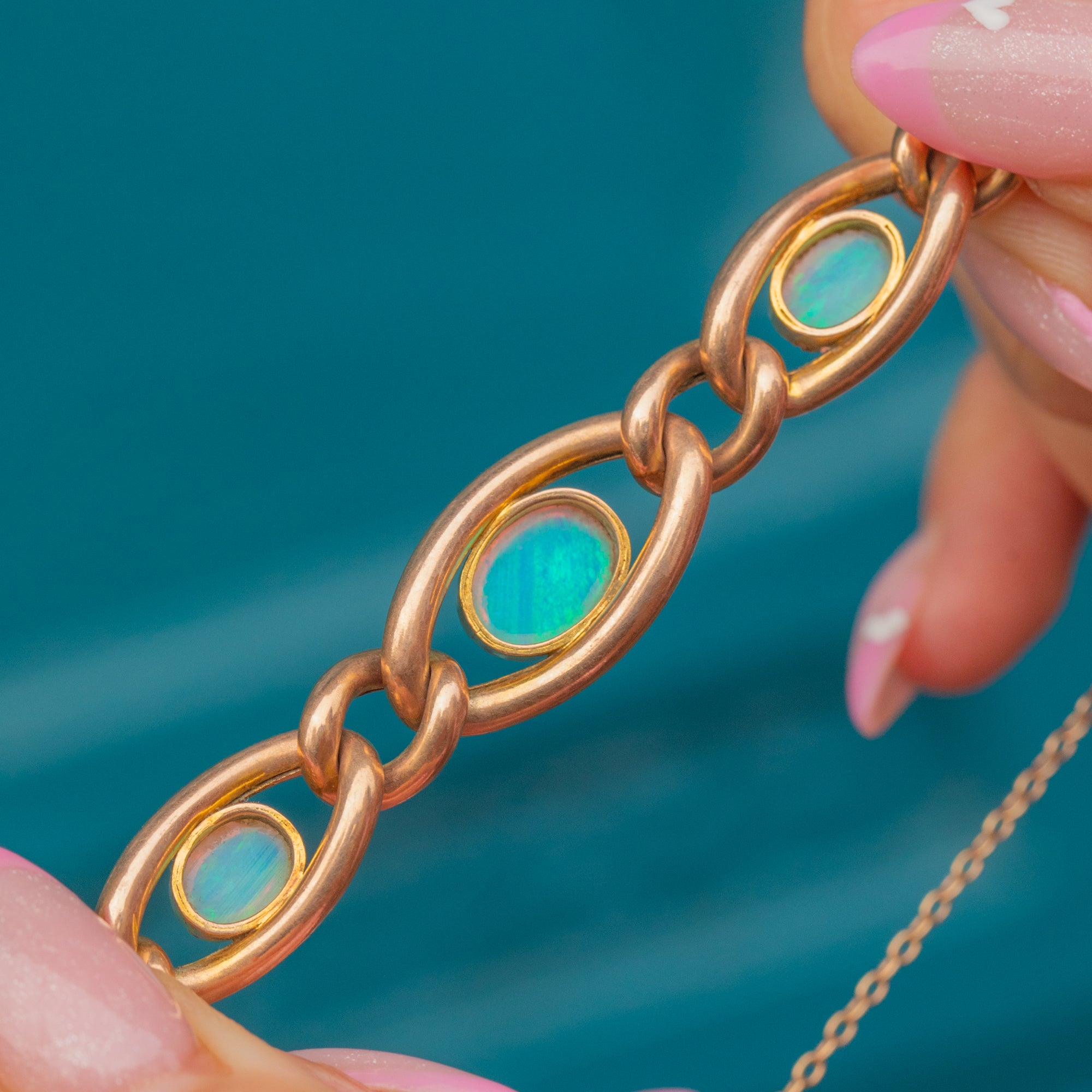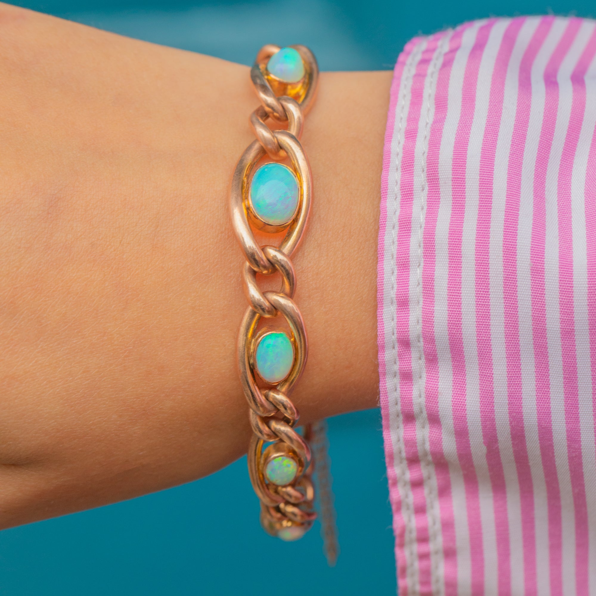This stunning Victorian bracelet is crafted in warm 9ct Gold and set with glowing natural Opals displaying vivid flashes of blue, green, orange and pink. The graduated curb links are beautifully proportioned, perfectly framing each Opal cabochon in smooth bezels.