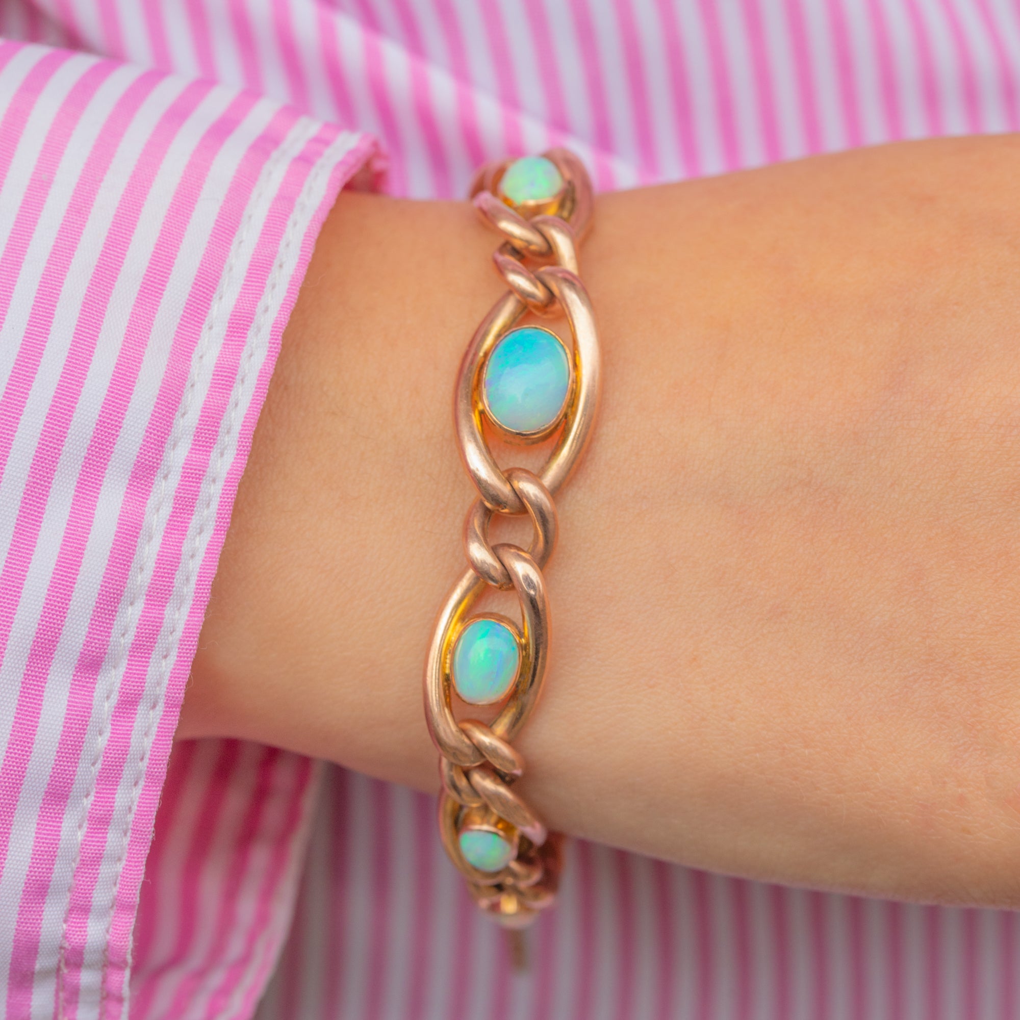 VERY GOOD: The Gold has a luscious, rosy hue and the links are robust and secure. There is one minor chip to the side of an Opal, obscured by the setting and not visible when worn. Otherwise the Opals are perfect with strong play of colour and secure settings.