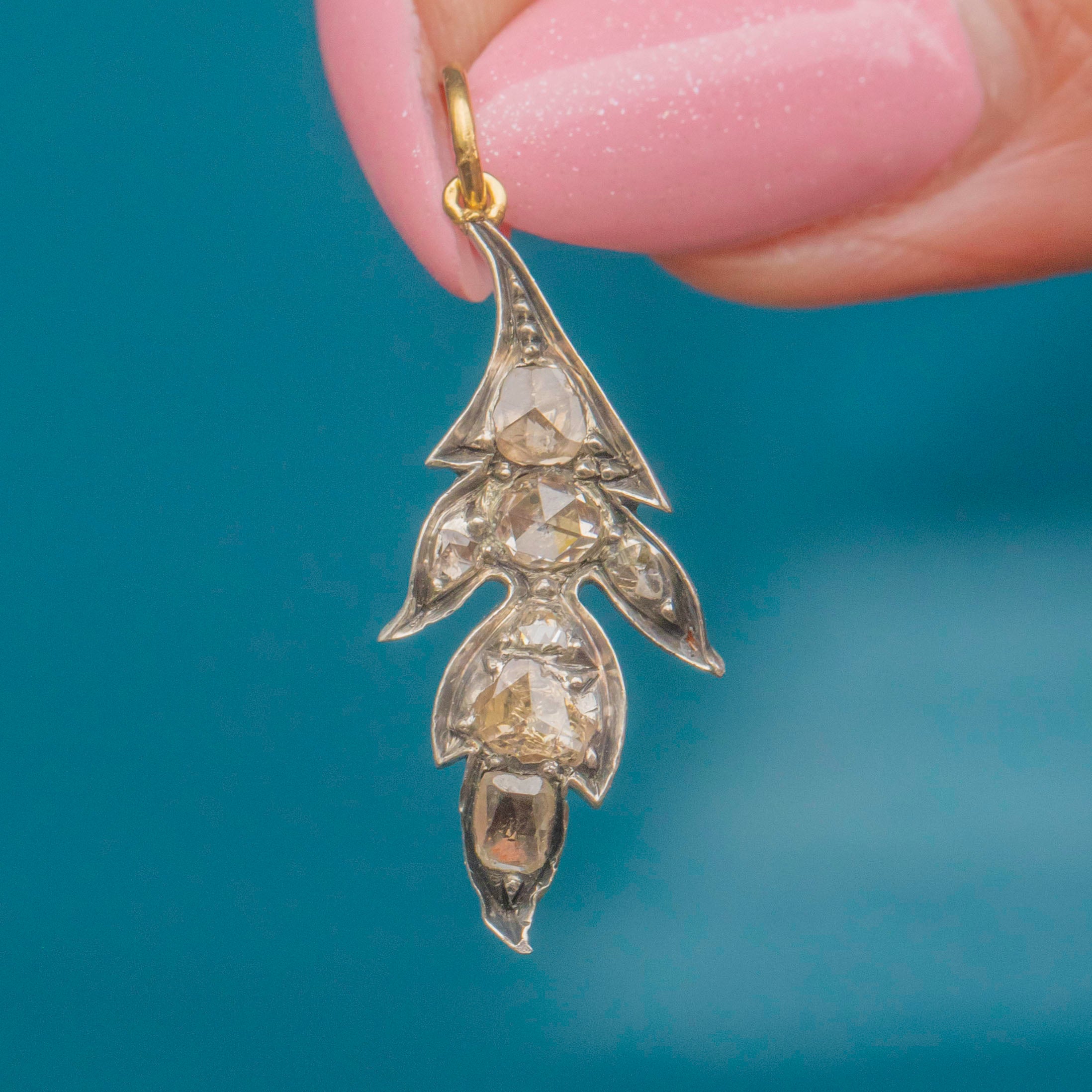 You will never tire of admiring this sensational 0.60ct Victorian rose-cut Diamond leaf pendant, crafted from 18ct Gold and Silver. Every millimetre of this antique pendant is embellished with a generous helping of crisp rose-cut Diamonds, each with a unique shape and sparkle.