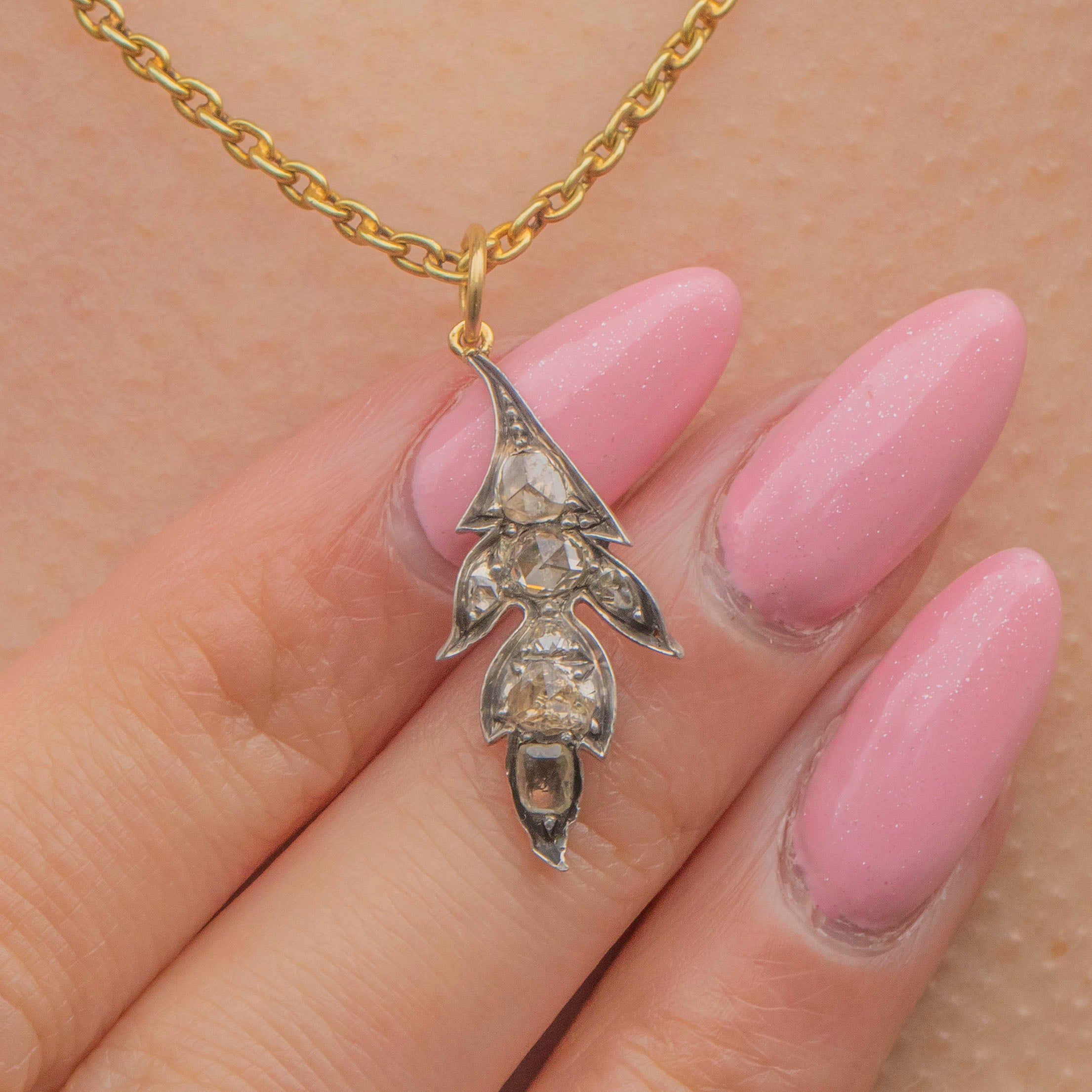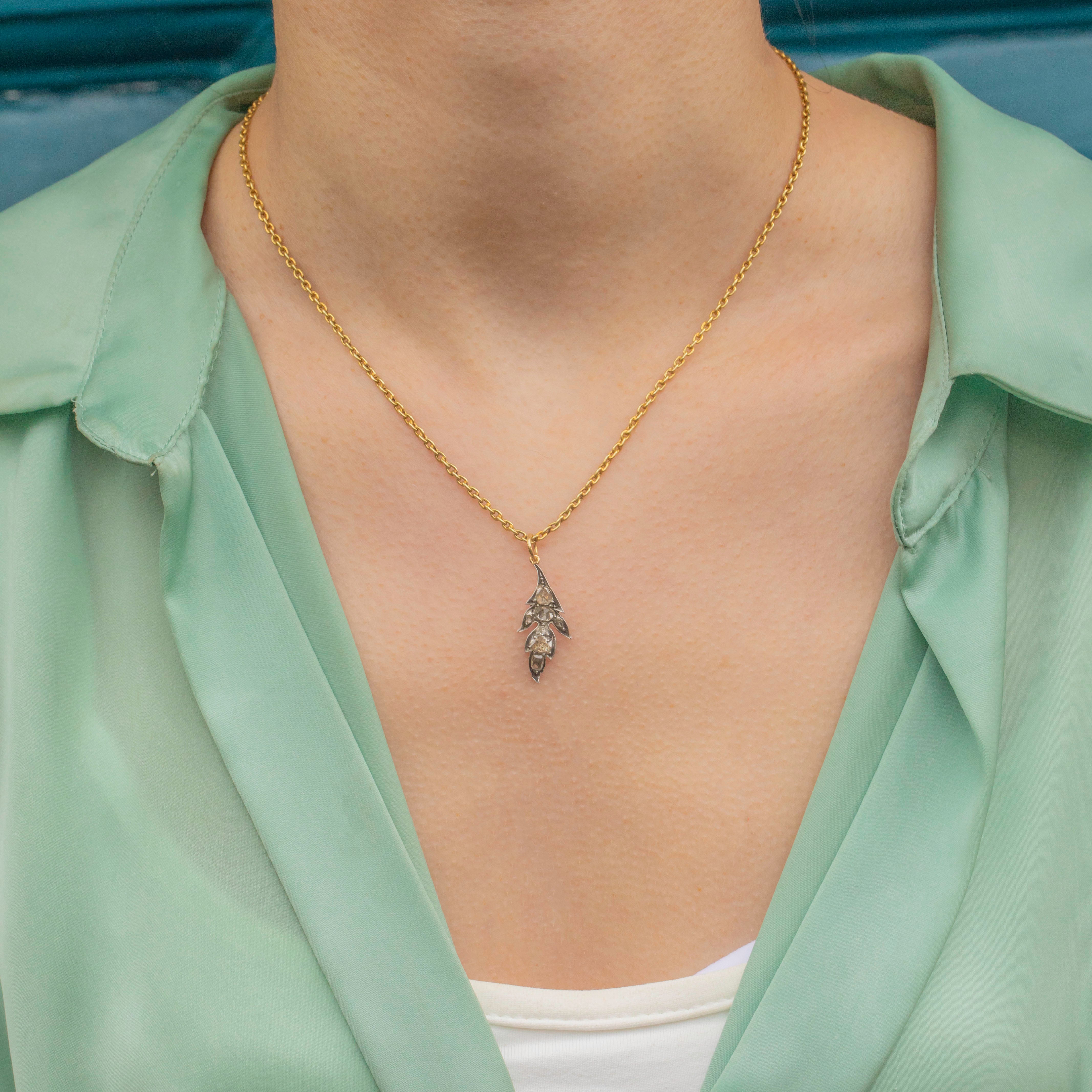 VERY GOOD: This Victorian rose-cut Diamond leaf pendant is in very good condition overall. The rose-cut Diamonds are all present, secure in their settings and have a brilliant sparkle. The Gold and Silver complement one another perfectly, and allow you to suspend this beauty from a fine Silver or Gold chain depending on your style!