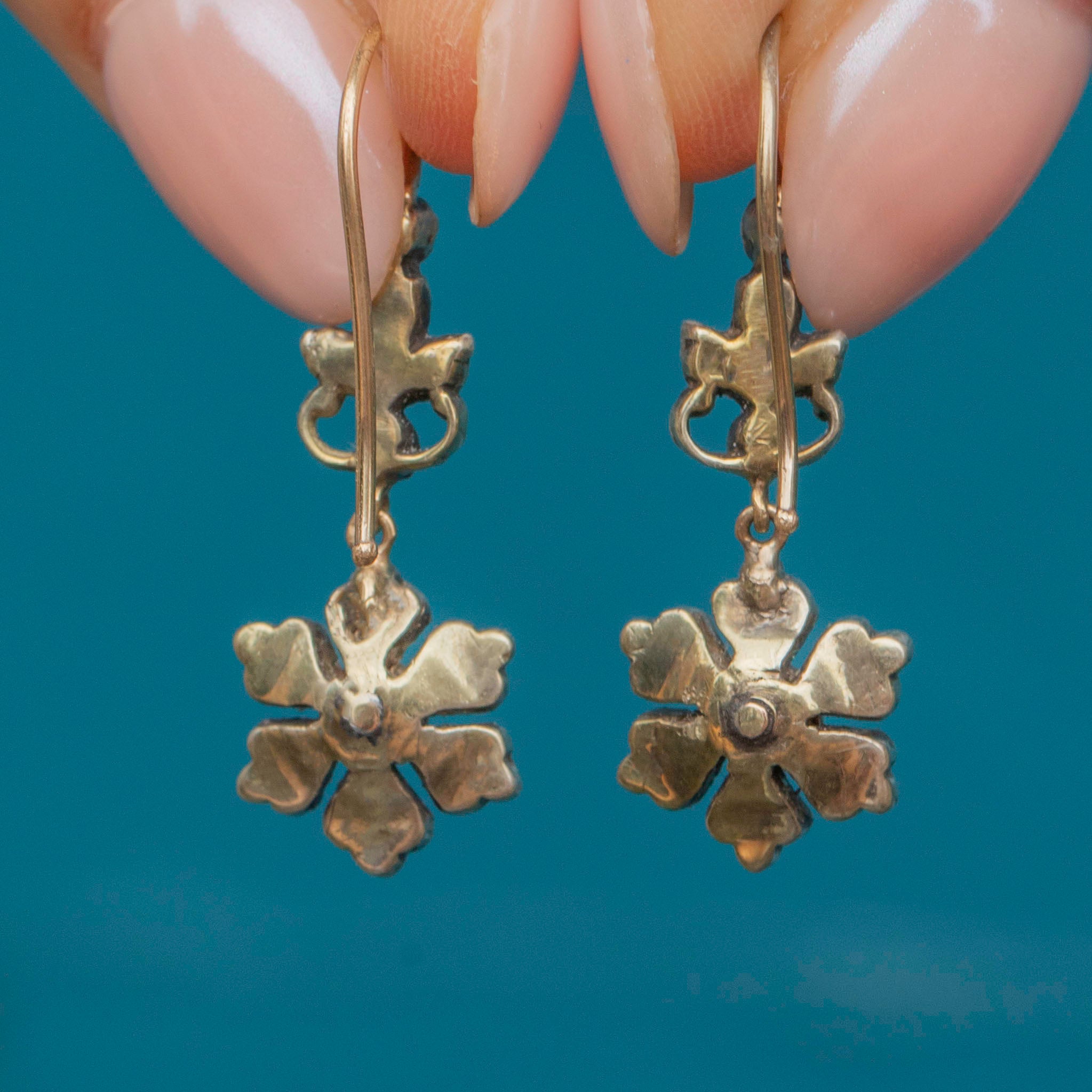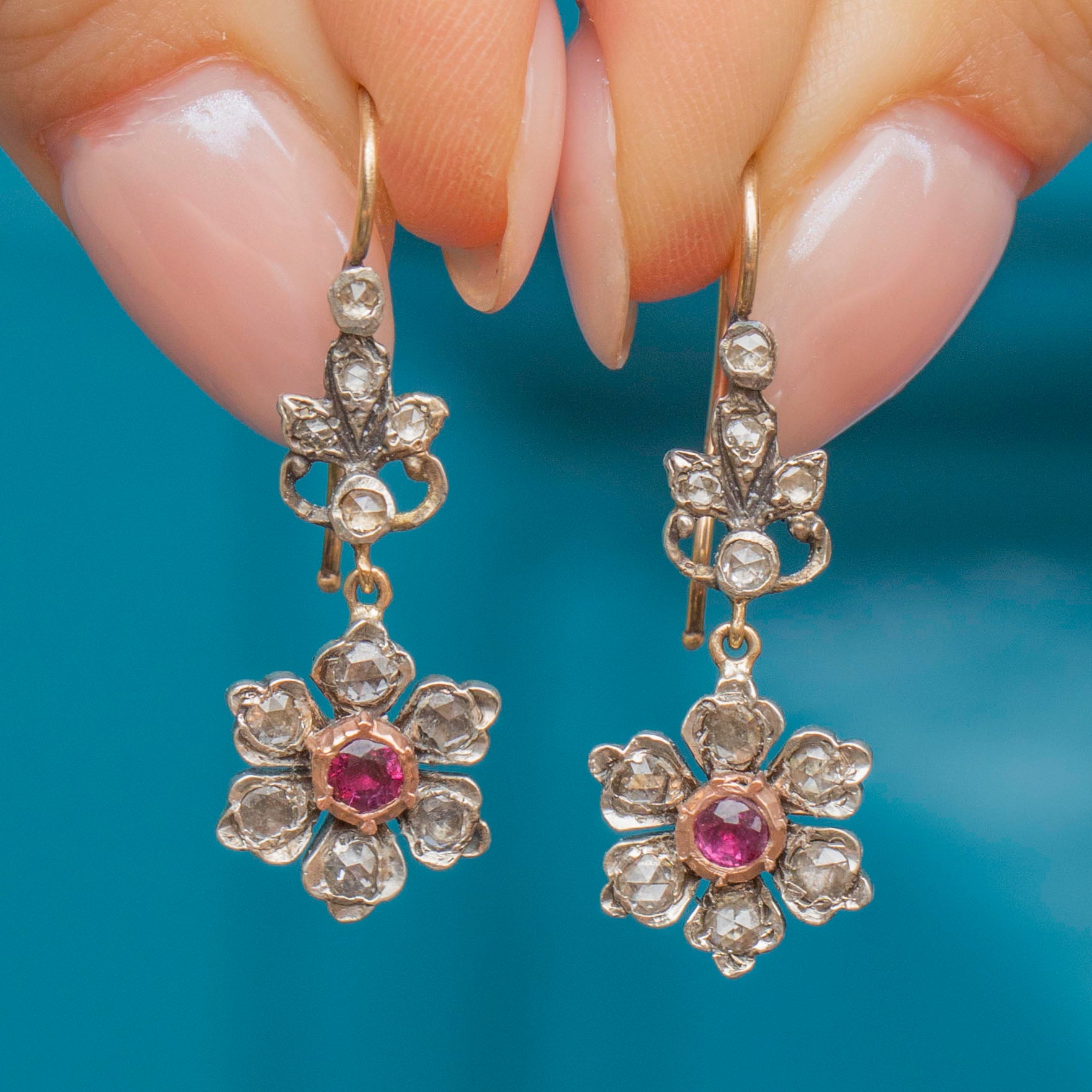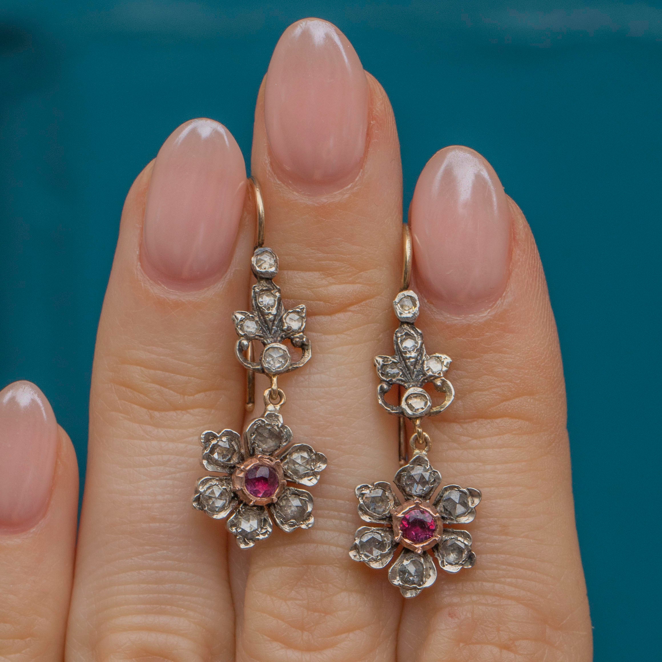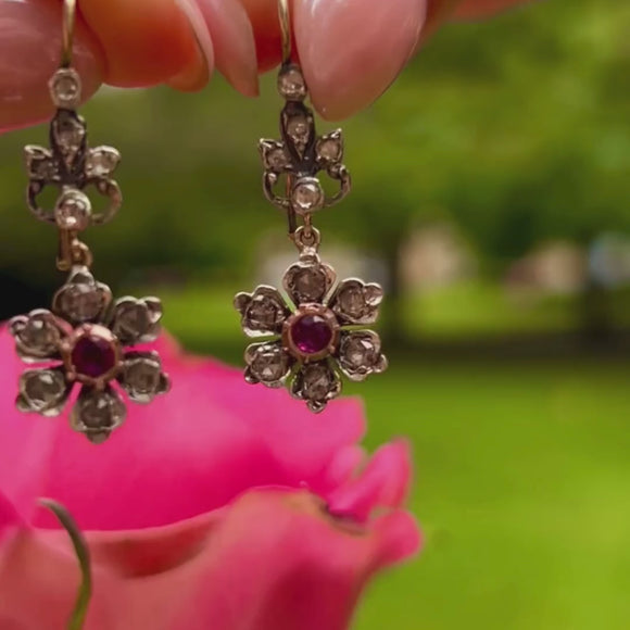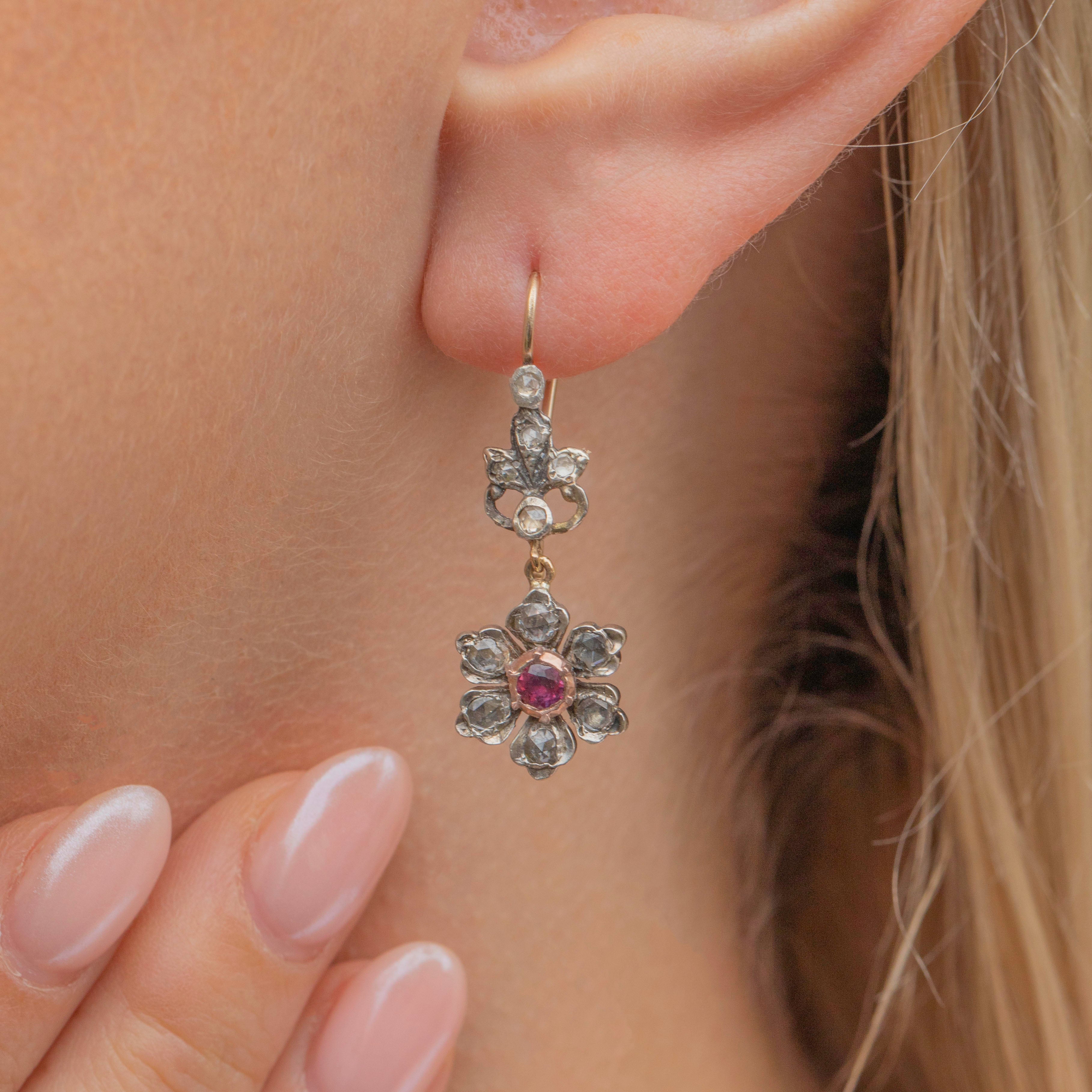 VERY GOOD-EXCELLENT These Victorian Rose-Cut Diamond and Ruby flower drop earrings are in excellent condition. Her Rose-cut Diamonds are securely set in their Silver setting, with no scuffs or dents to note. There is some subtle wear to the back of the flowers, however this cannot be seen when worn. Her Ruby is also in immaculate condition and strongly set, allowing for confident and safe wear.