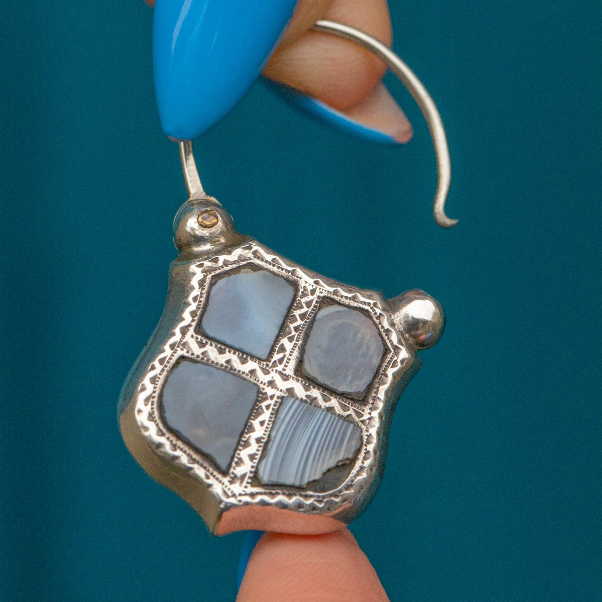 GOOD-VERY GOOD. This Victorian Silver Agate padlock pendant is in lovely antique condition. The Agate have all been hand-cut, and as such aren't a perfect fit for the settings, but they remain secure and we feel this gives the pendant a little extra antique character. The bottom right stone has a chip, but this is only visible under close inspection and the other three are free from signs of wear. The padlock has retained its form remarkably well over the years, with only some minor surface wear on the back, and the Silver is bright with a light patina emphasising the engraved details. The padlock arm works perfectly allowing you to style this piece however you choose and wear it with the utmost confidence!