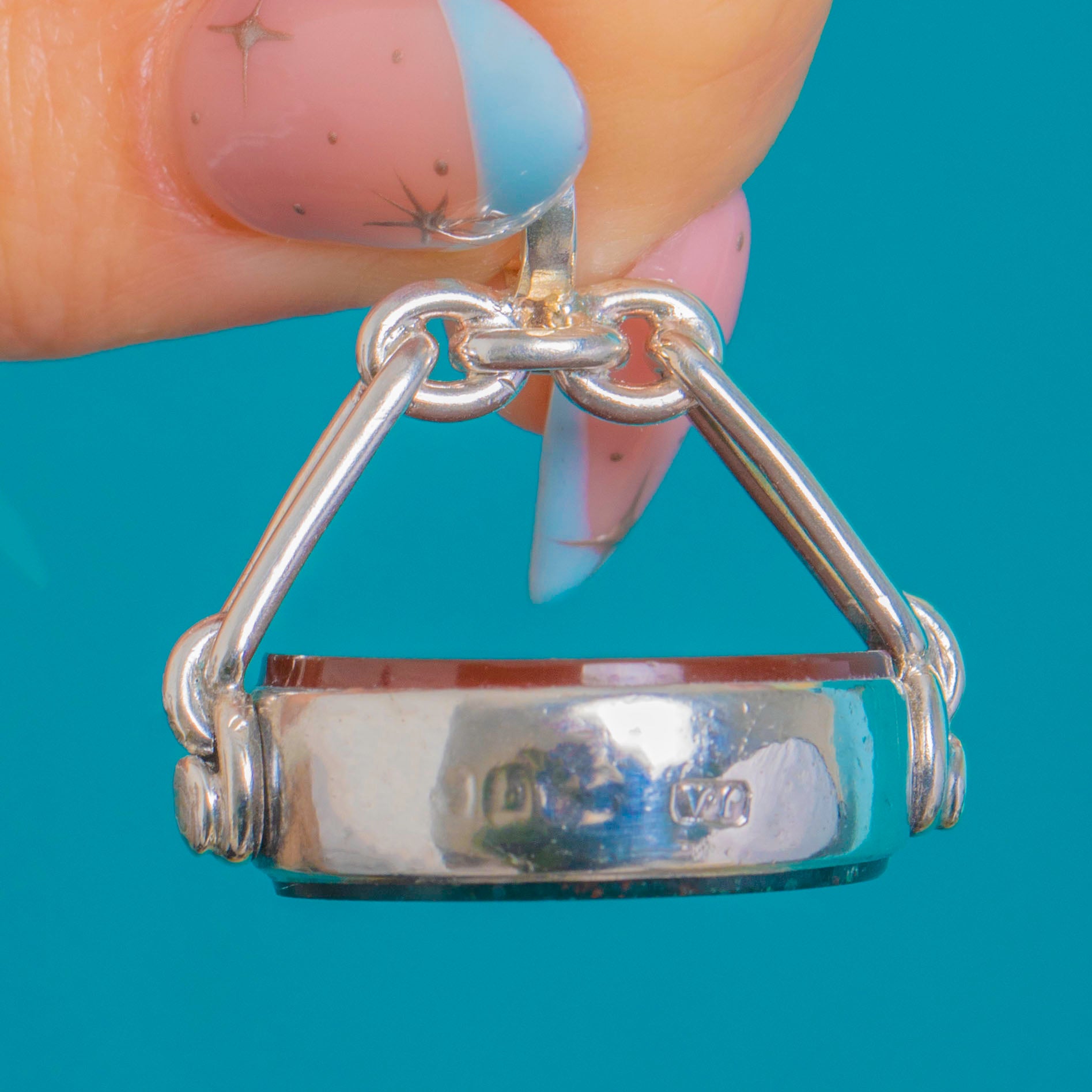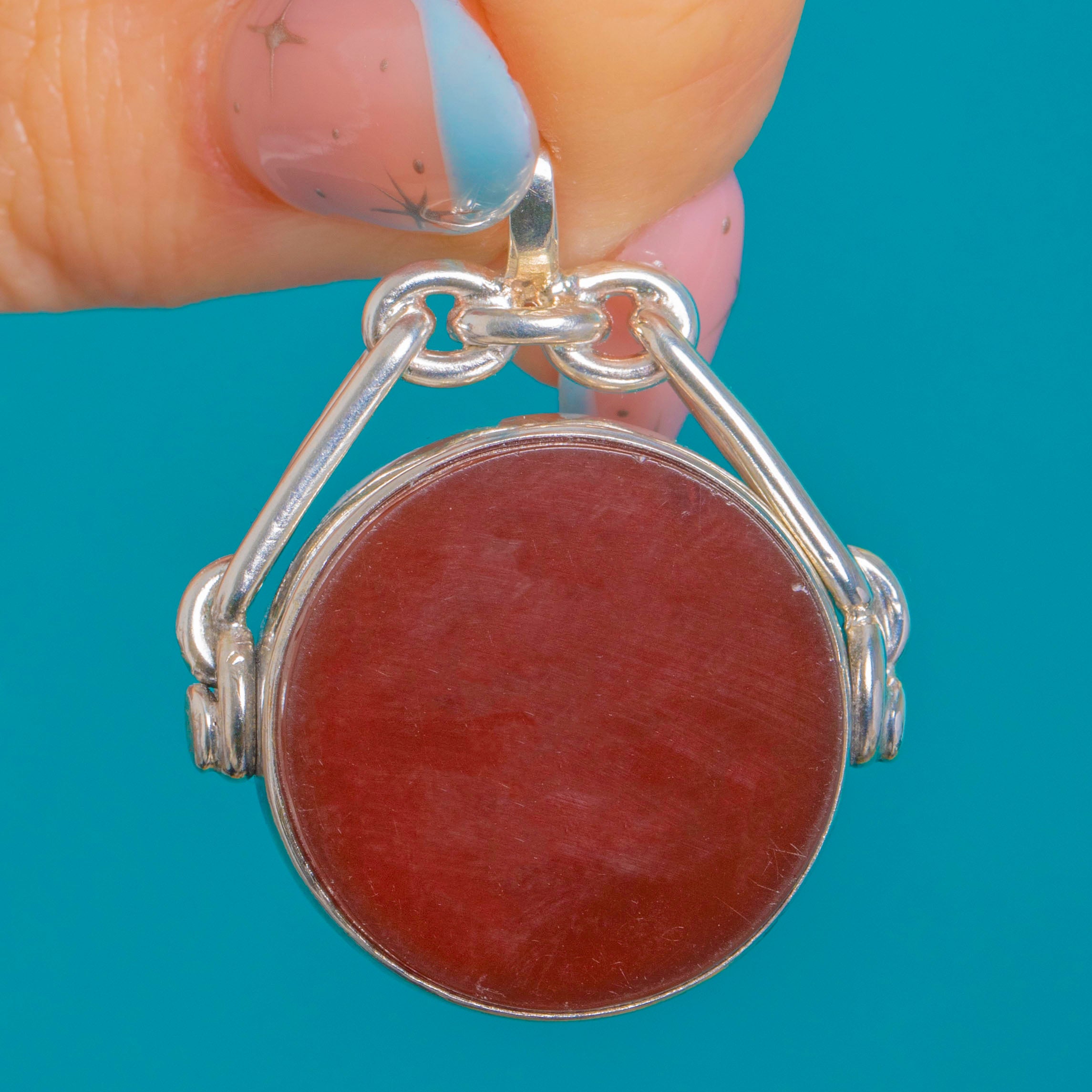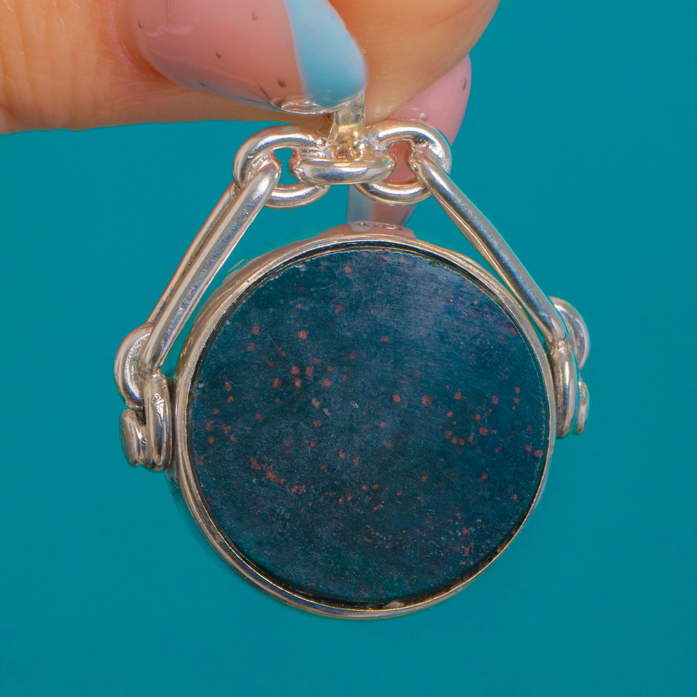 VERY GOOD: The Carnelian and Bloodstone present a bright polish with light surface abrasions and a tiny edge nibble visible on close inspection. The Sterling Silver frame and swivel are secure and well-preserved with minor marks and worn hallmarks, consistent with age. The mechanism rotates smoothly and the piece has clearly been well cared for.