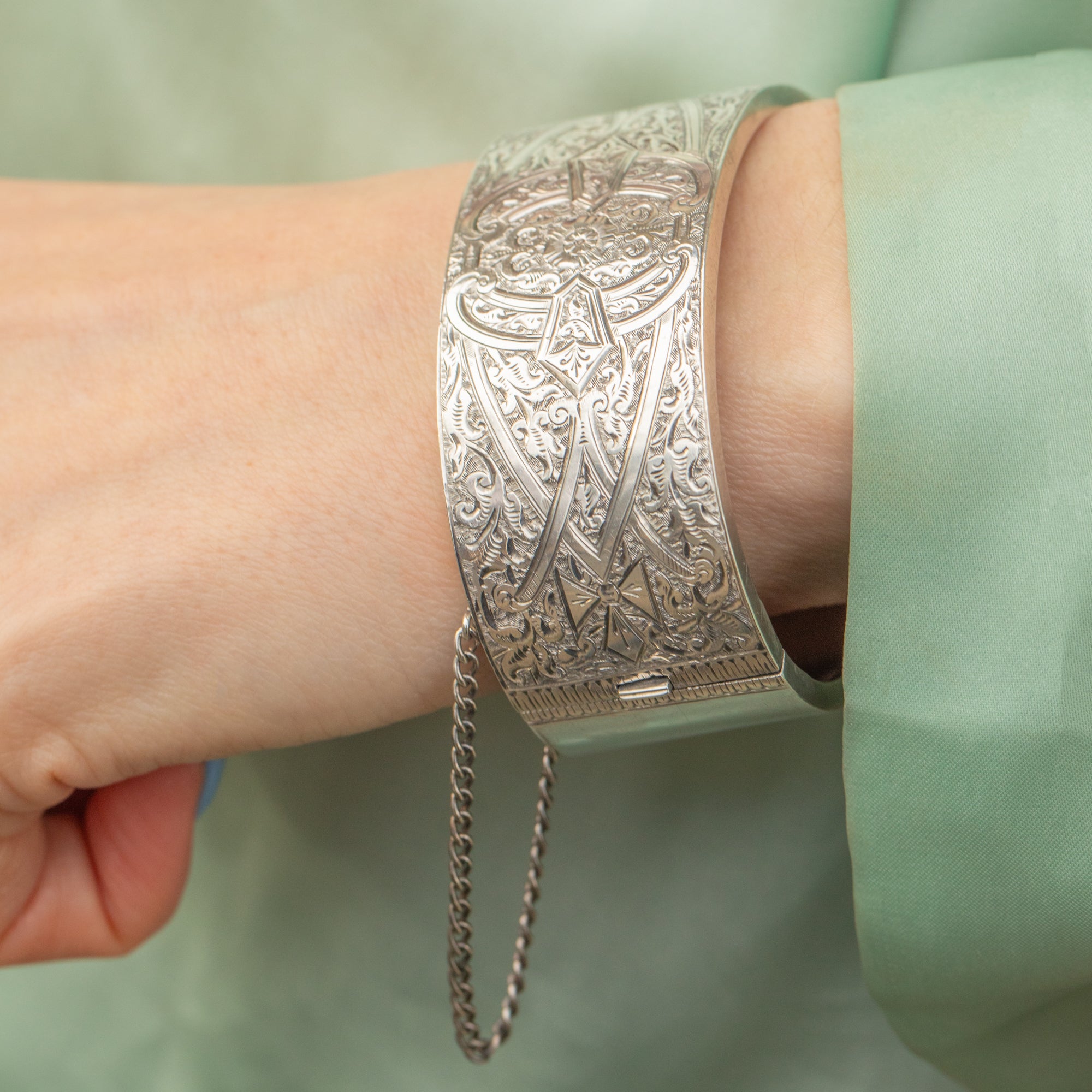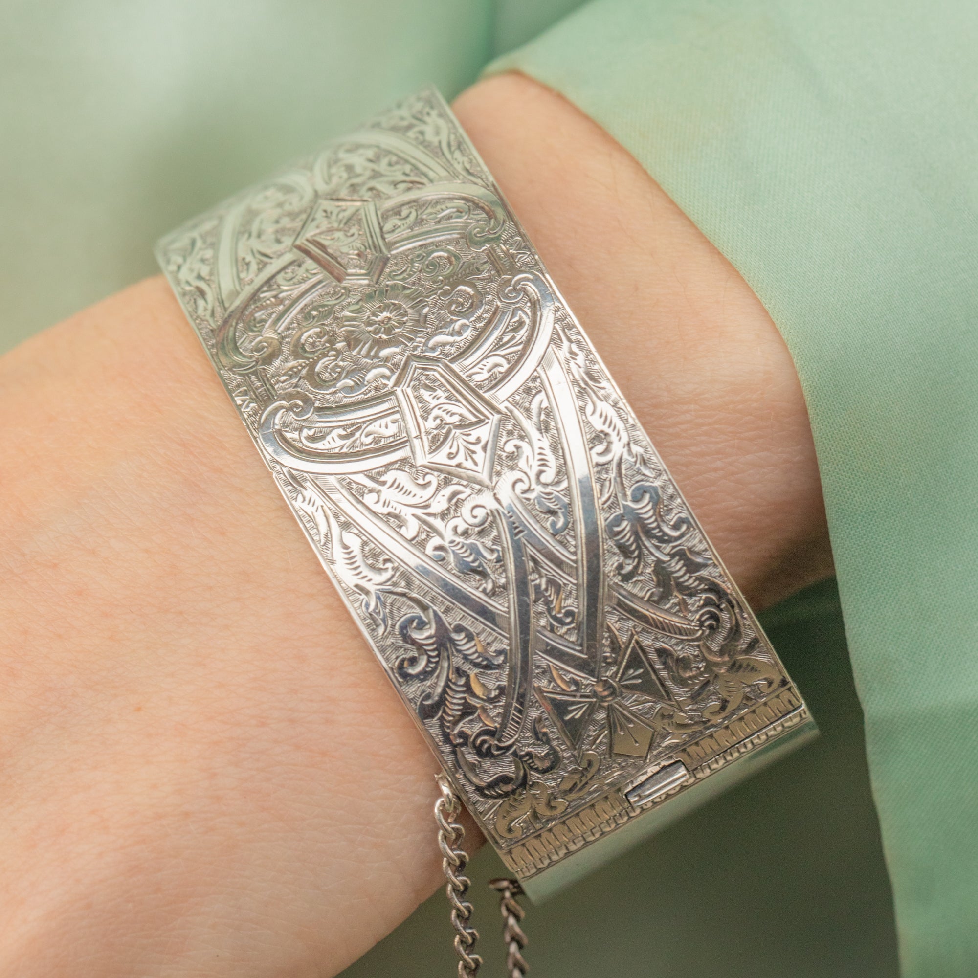 EXCELLENT. This Victorian Silver engraved cuff bangle is in superb condition throughout. The front of the bangle has kept beautifully and the antique stamps inside are crisp. The bangle tongue slides out and closes with ease, so you can wear this piece with the utmost pride. What a wonderful Victorian bangle!