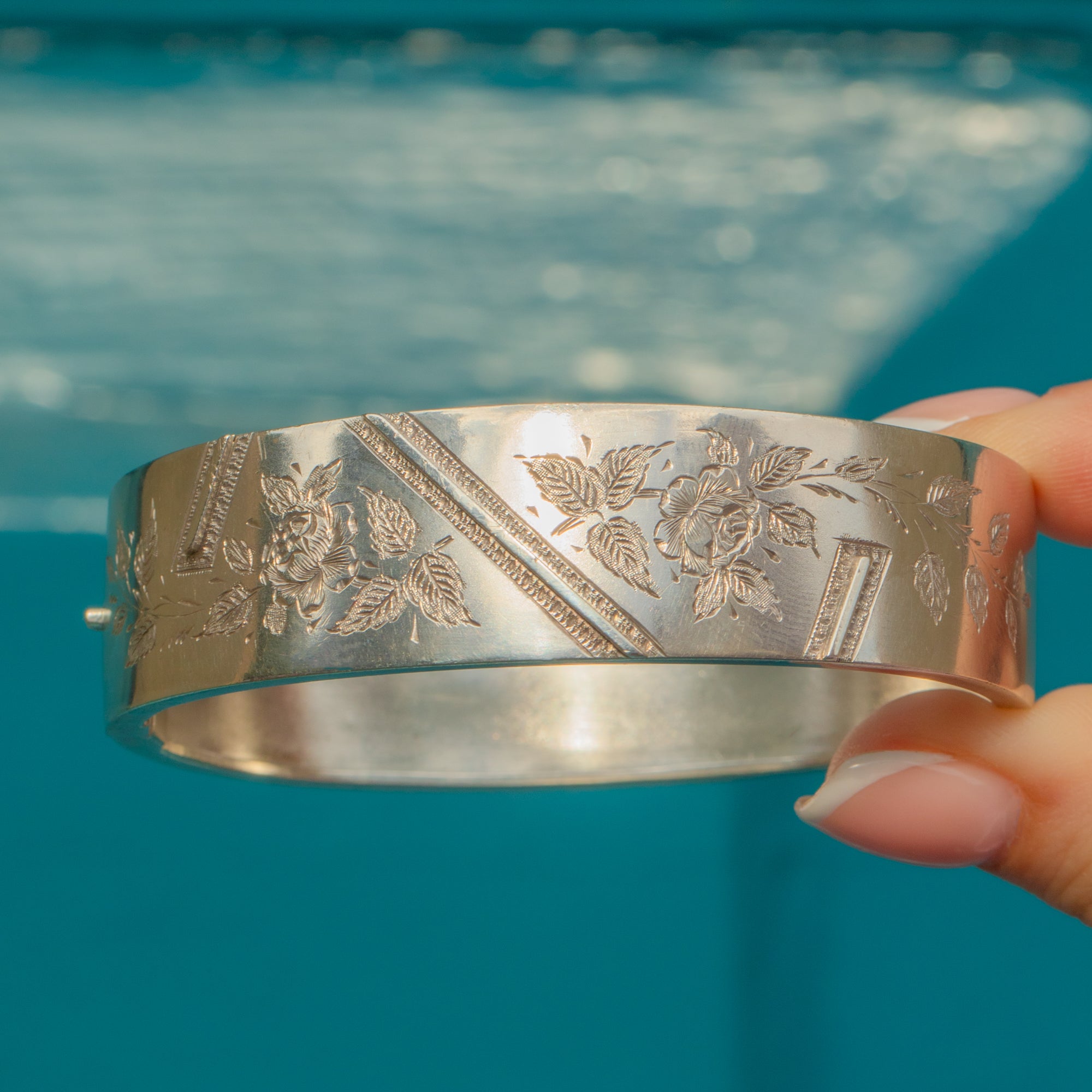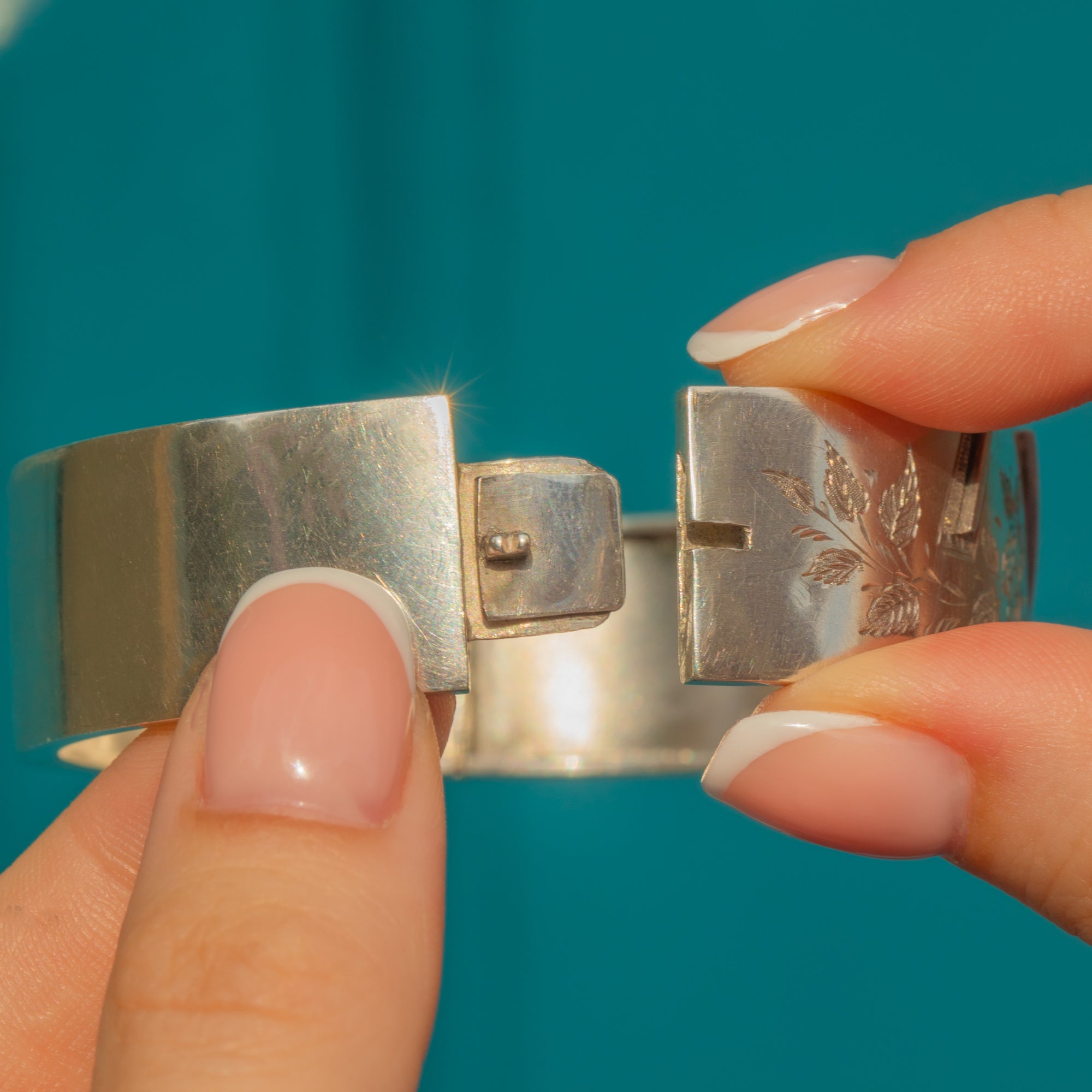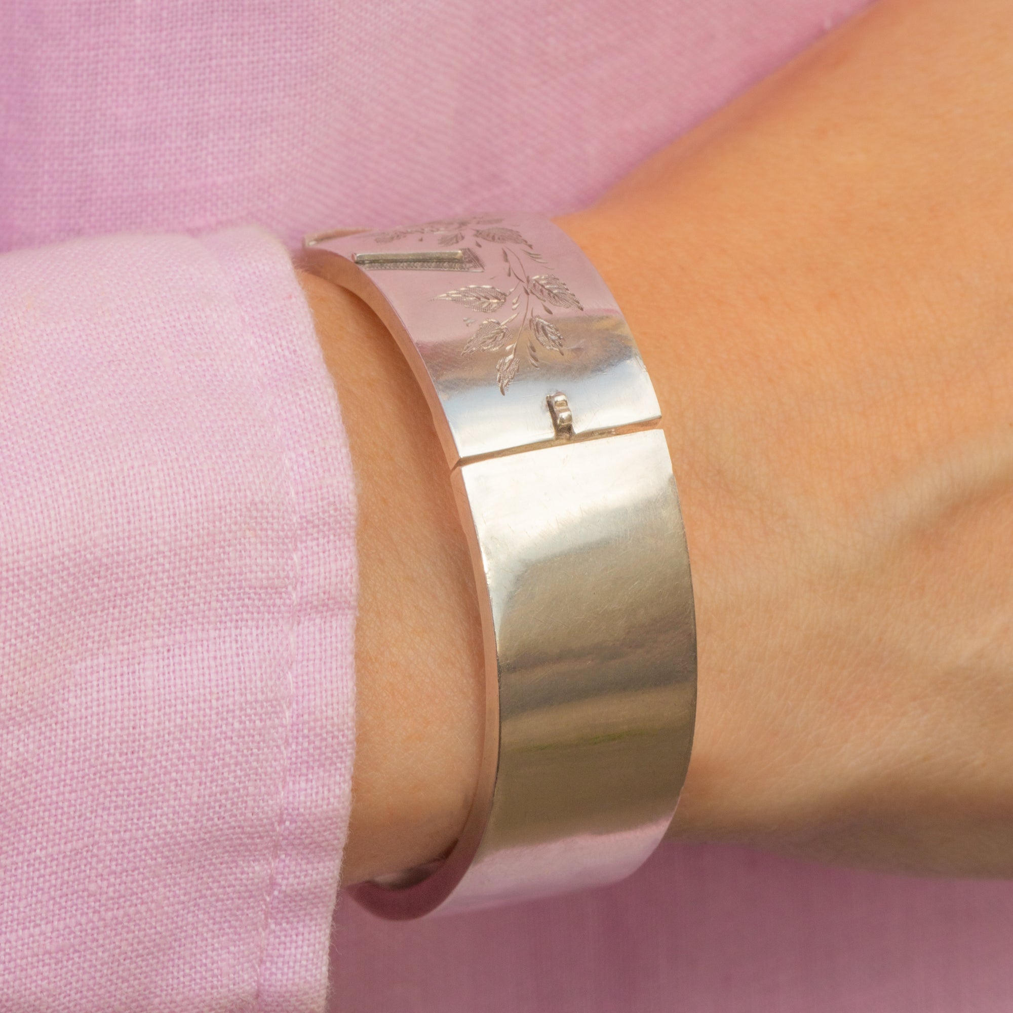 VERY GOOD. This Victorian Aesthetic Silver engraved wild roses bangle is in very good condition. The Silver is lustrous and the details have all remained crisp, with a light patina accrued within the engravings creating more depth. There is some surface wear on the back of the bangle, including a ding, but this does not impact the integrity of the piece. There is a slightly wobble once opened from where the hinge has slightly loosened, however when closed she is secure with a satisfying 'click'. Wear this antique bangle in both confidence and style!