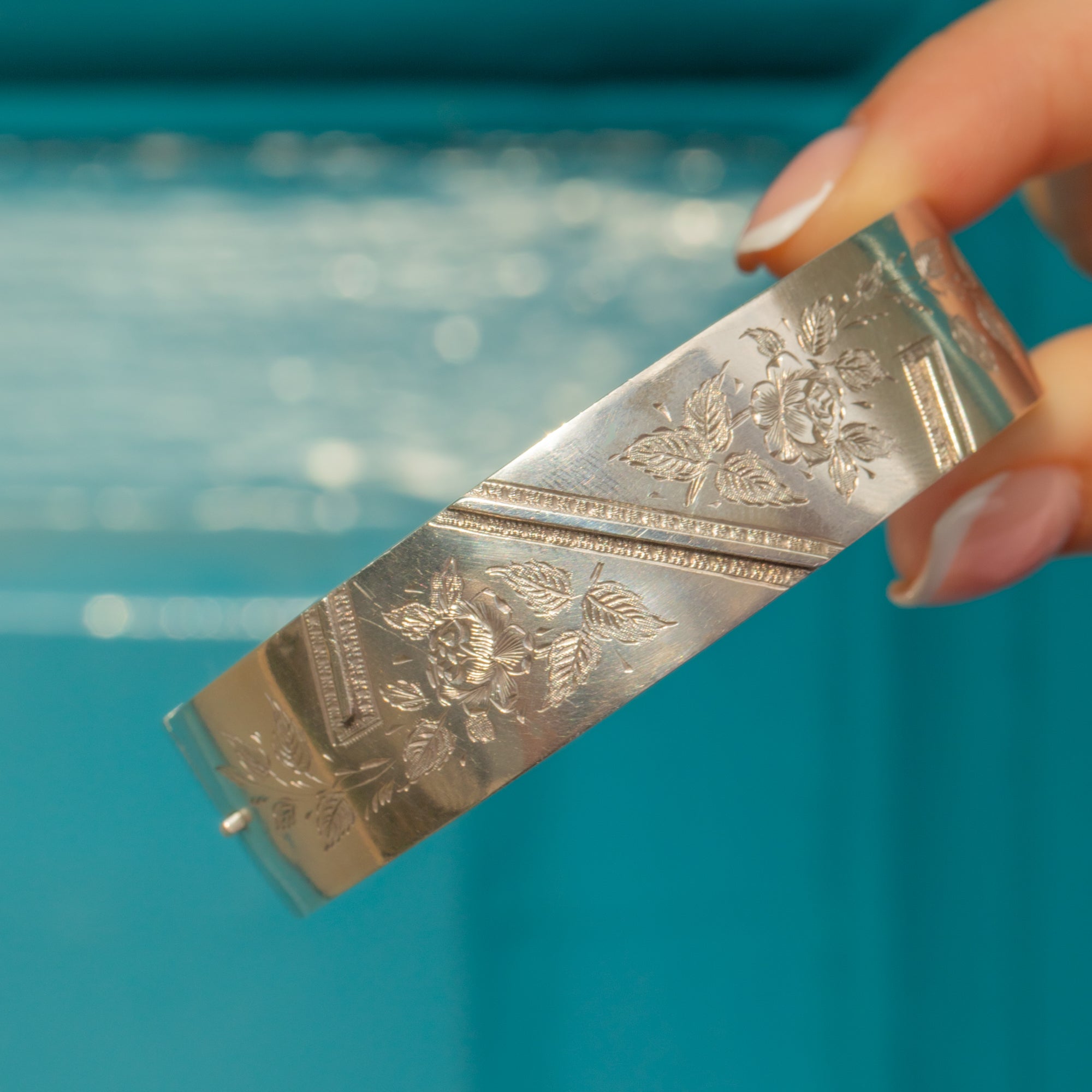 Immerse yourself in the sheer beauty of this Victorian Aesthetic Silver engraved wild roses bangle! Whimsical engravings adorn the front of the bangle, with pretty and detailed roses accompanied by asymmetrical lines creating a decorative adornment for your wrist.