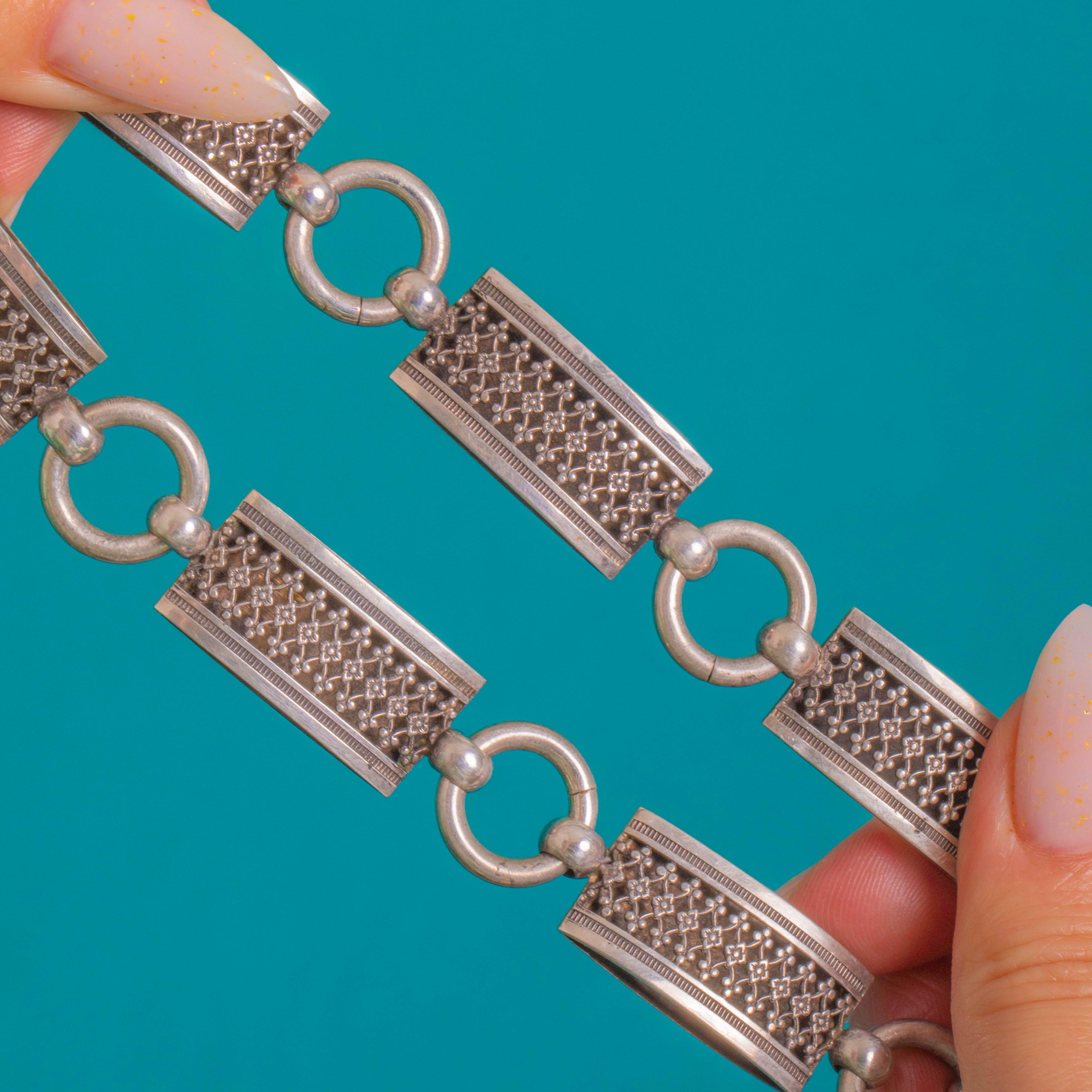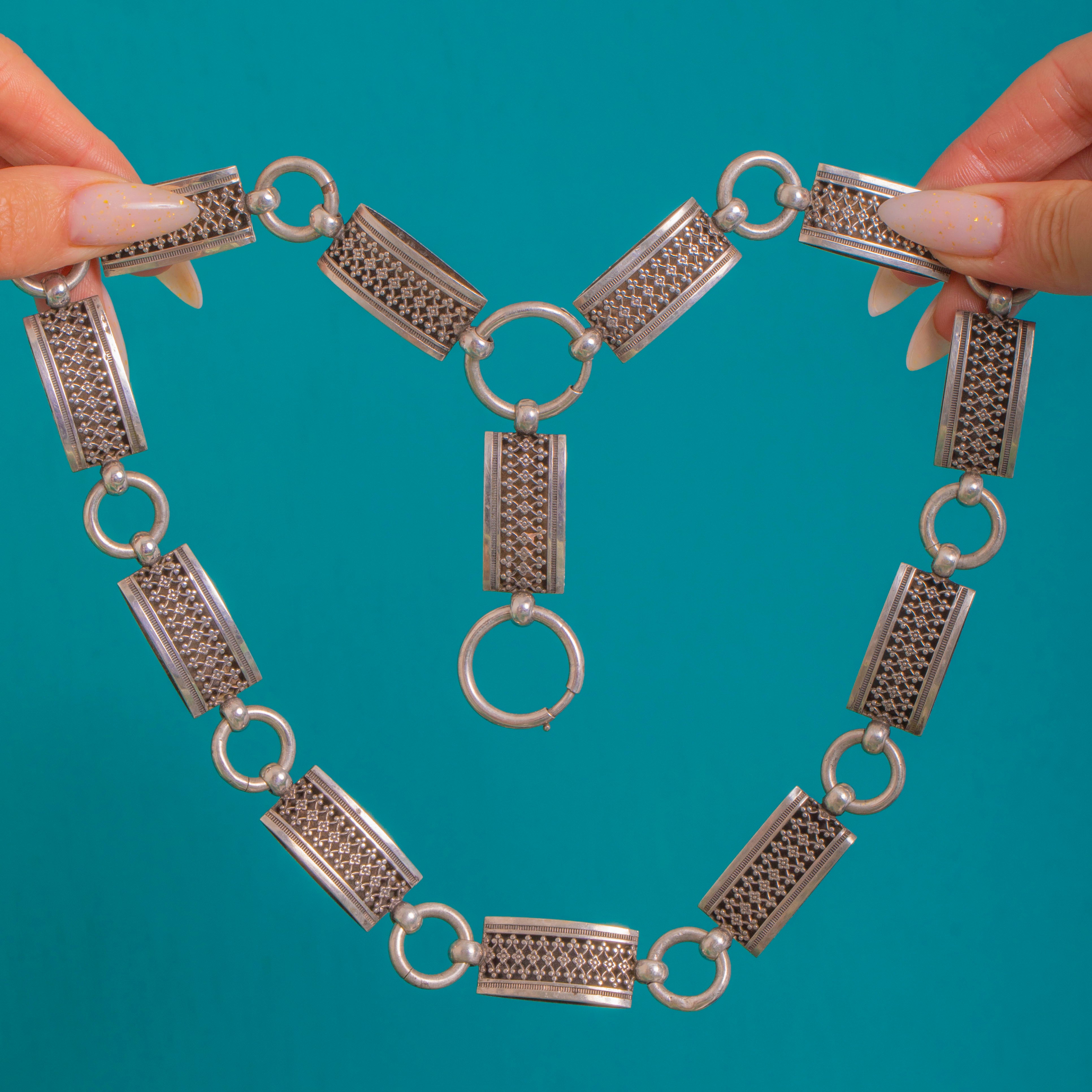Bold and beautifully architectural, this Victorian book chain necklace is composed of alternating rectangular plaque links and chunky round connectors for a striking, collarbone-skimming silhouette. Each plaque is richly detailed with a raised beaded lattice framed by crisp reeded borders, the oxidised recesses adding depth and drama to the Silver sheen. Two oversized bolt rings complete the look—one forming the clasp and a second at the front acting as a decorative drop or practical hanger for a pendant or locket.