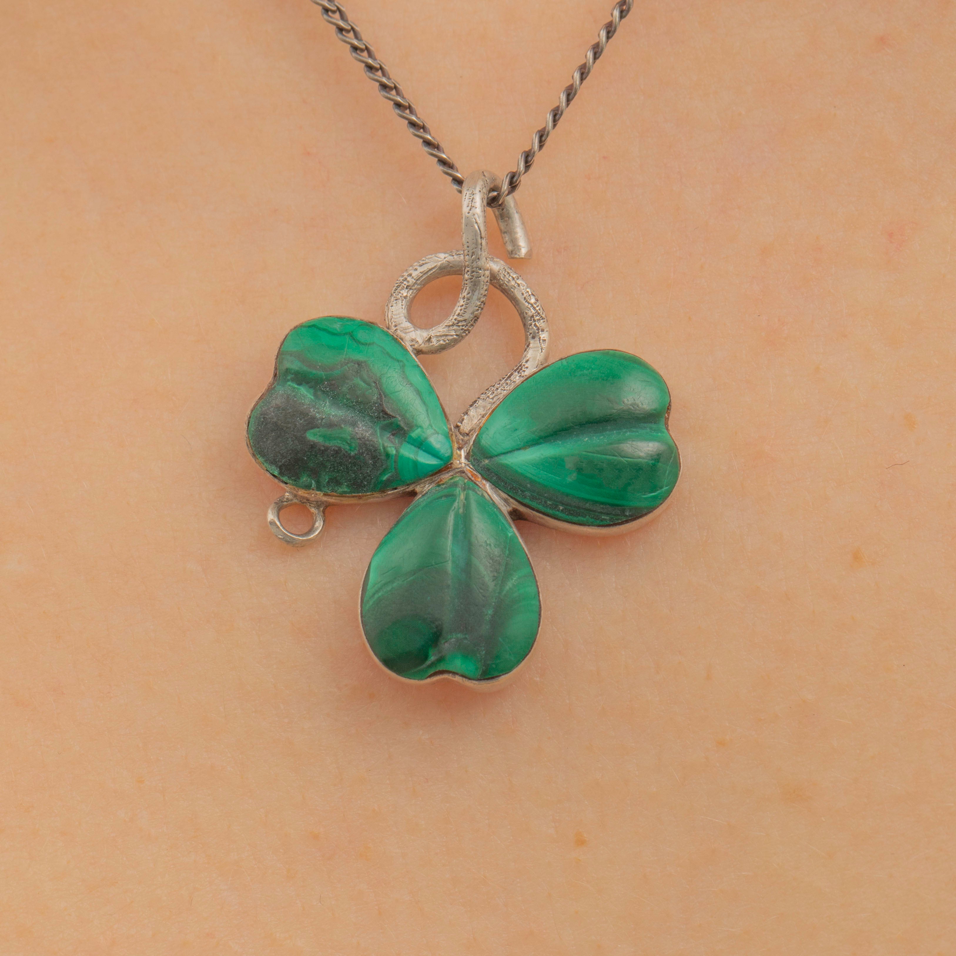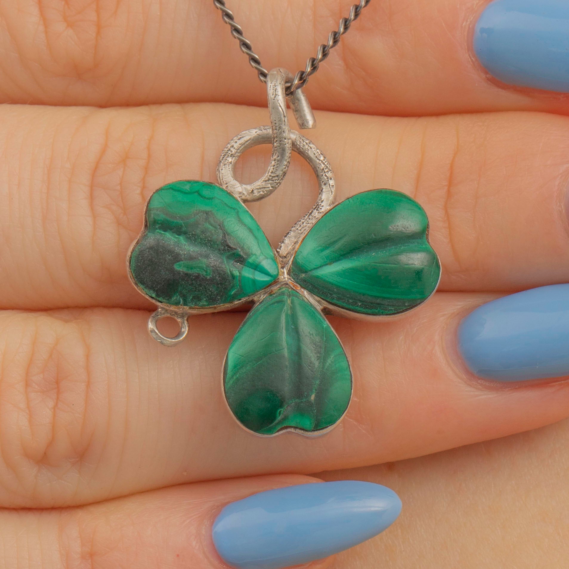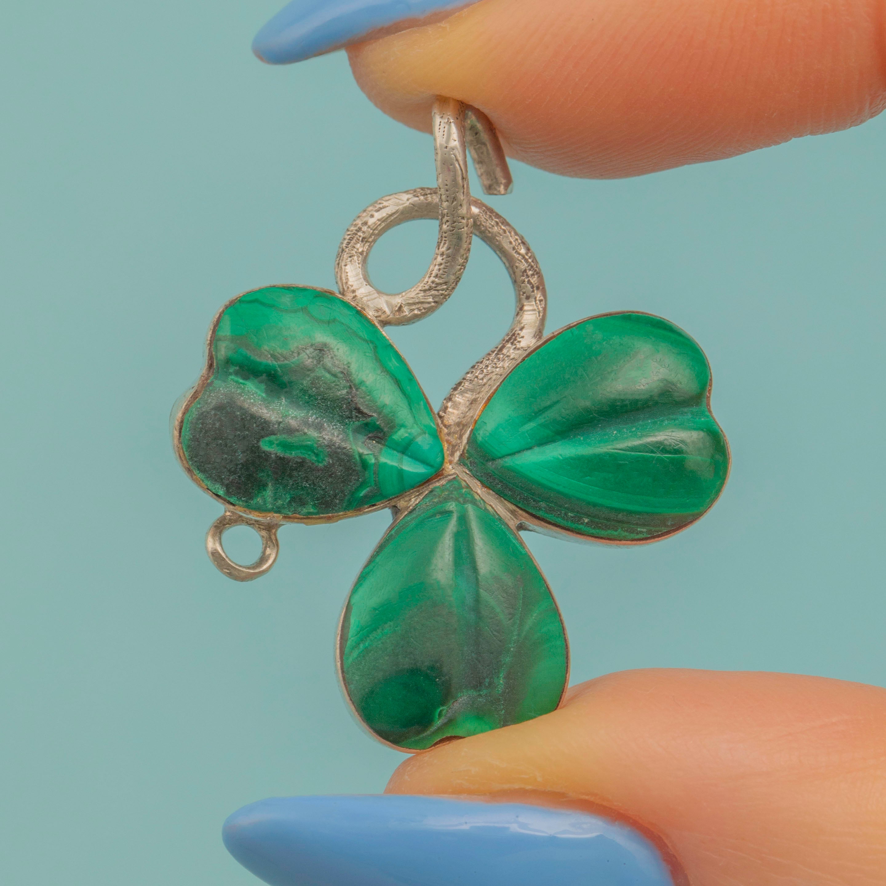 VERY GOOD-EXCELLENT. This Victorian Silver Malachite clover pendant is in wonderful condition throughout. The deep green of the Malachite perfectly complements the Sterling Silver. There are one or two scuffs to the Silver on the back of the pendant which cannot be seen during wear. The Malachite is securely set and the ornate bale allows the pendant to be affixed to a chain of your choice easily!