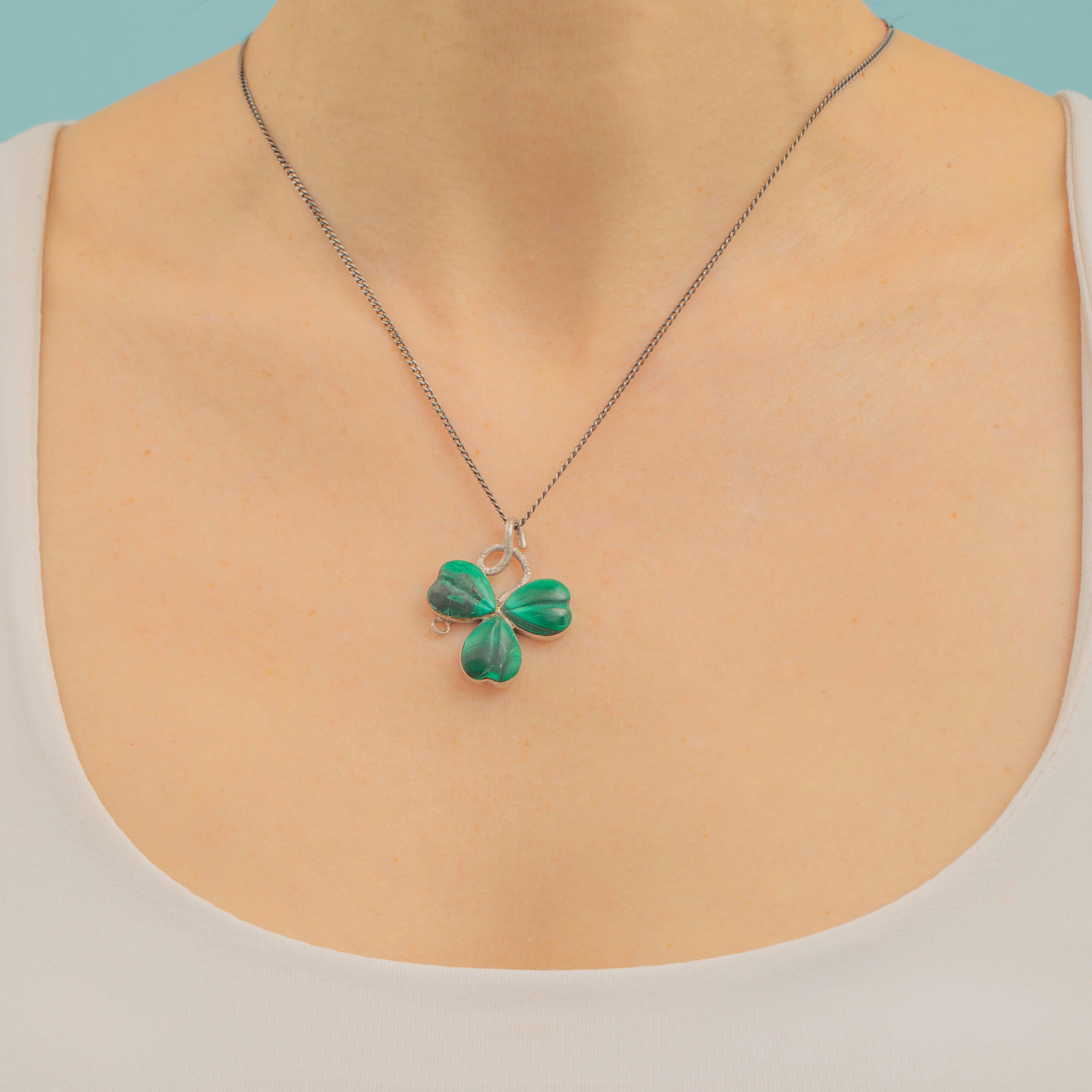 We adore this sweet Victorian Silver Malachite clover pendant! Inlaid with marvellously marbled Malachite, the shamrock sits snug within a chunky Sterling Silver bezel.