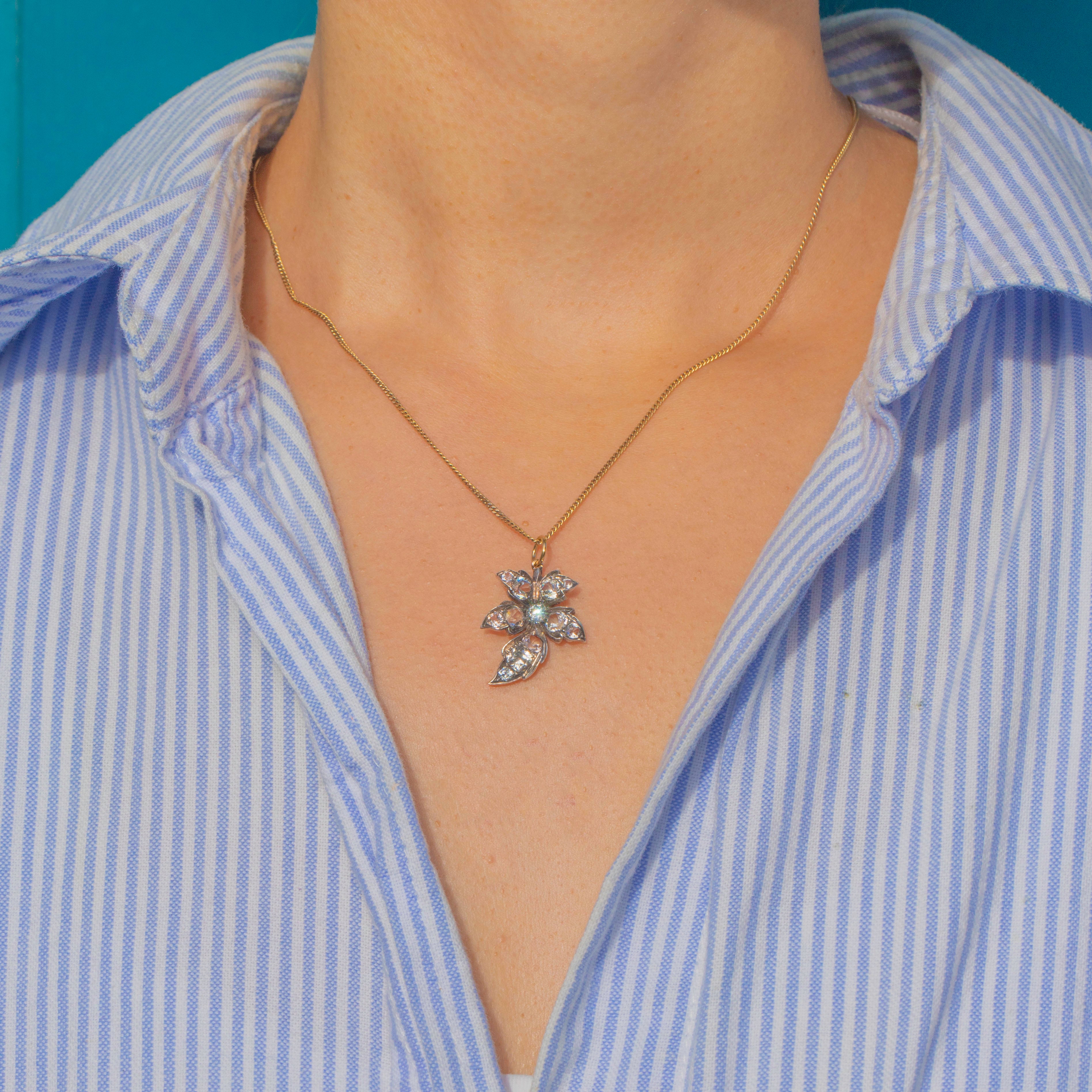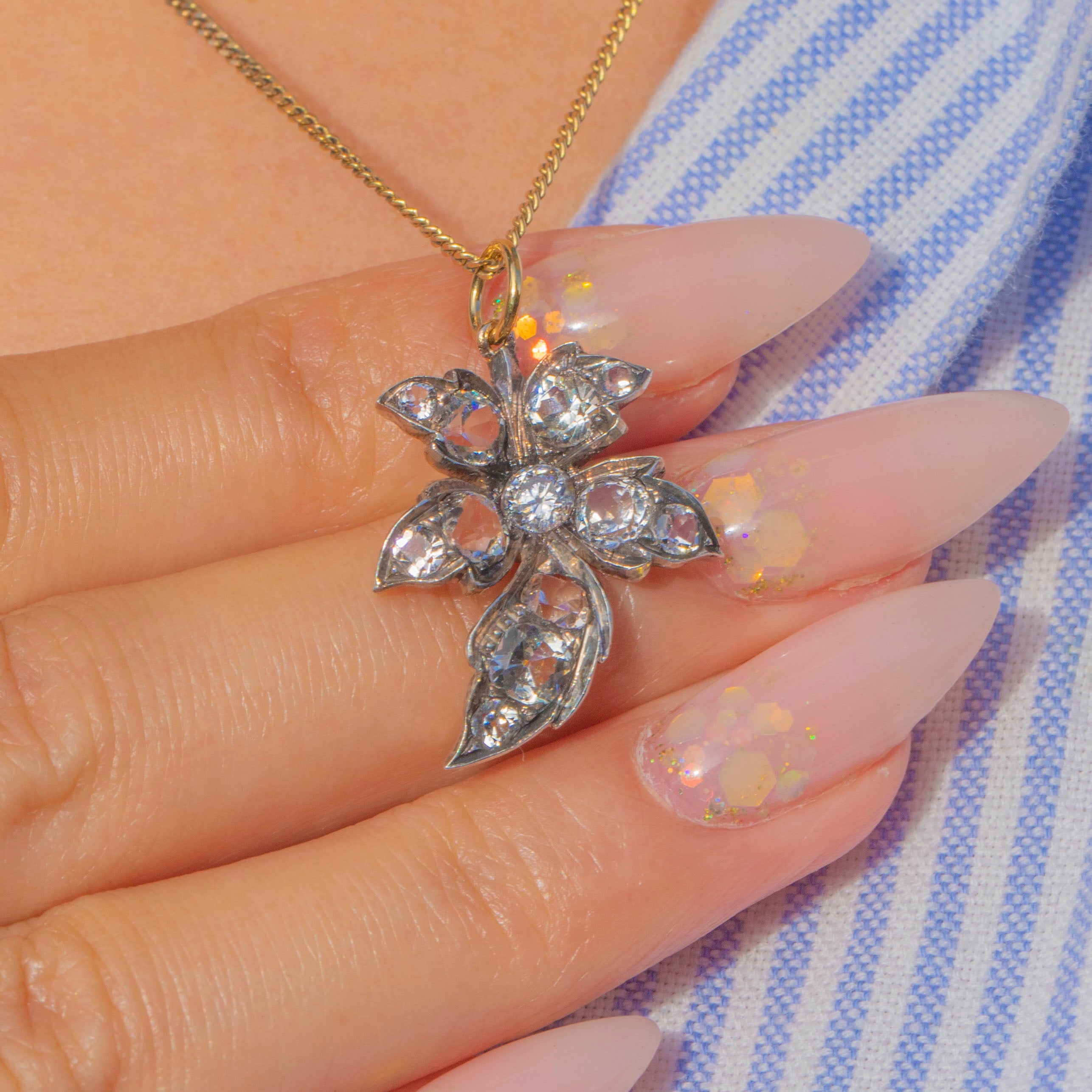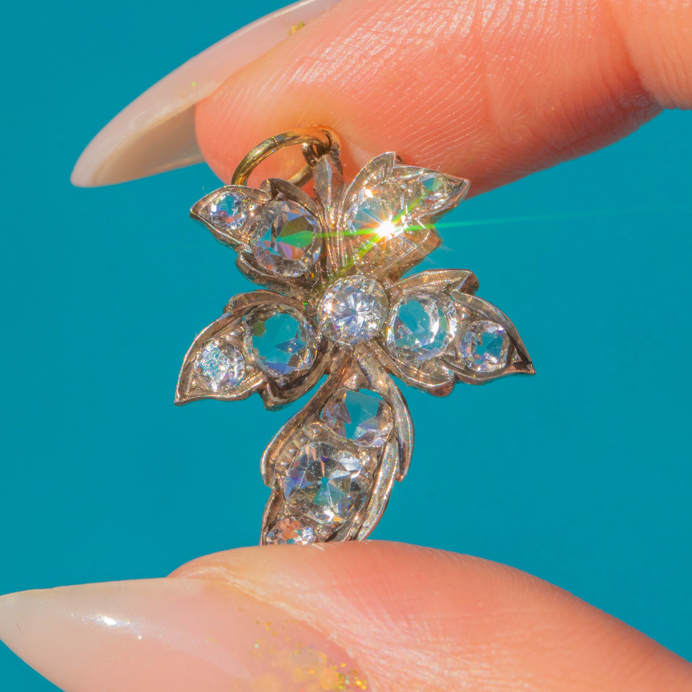 This Victorian charm takes the form of a graceful leaf, glittering with graduated white Paste stones that shimmer in the light. The Paste gems range from 2.5mm to 3.5mm in diameter, creating a naturalistic, organic effect that perfectly suits the foliate design.