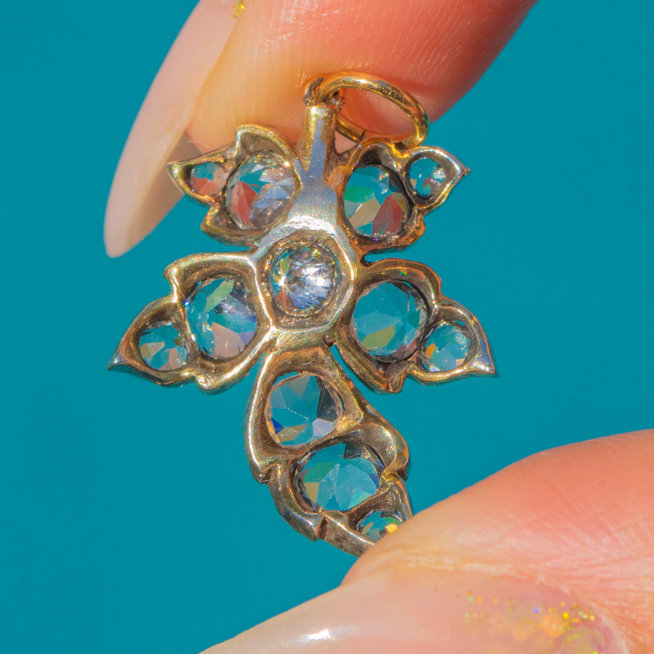MATERIALS: Tests as Silver with 18ct Gold backing, 18ct Gold hasp and jump-ring, Paste.