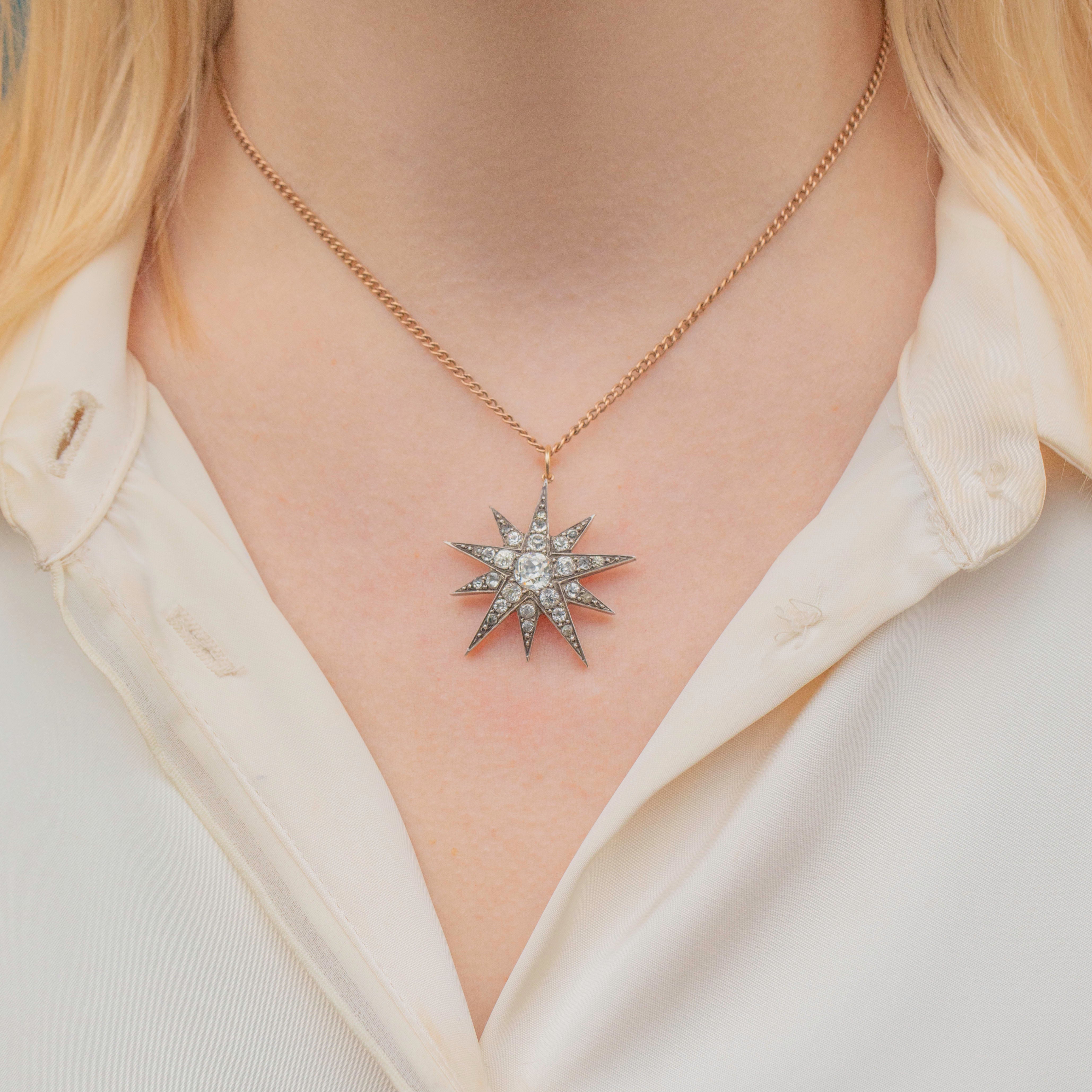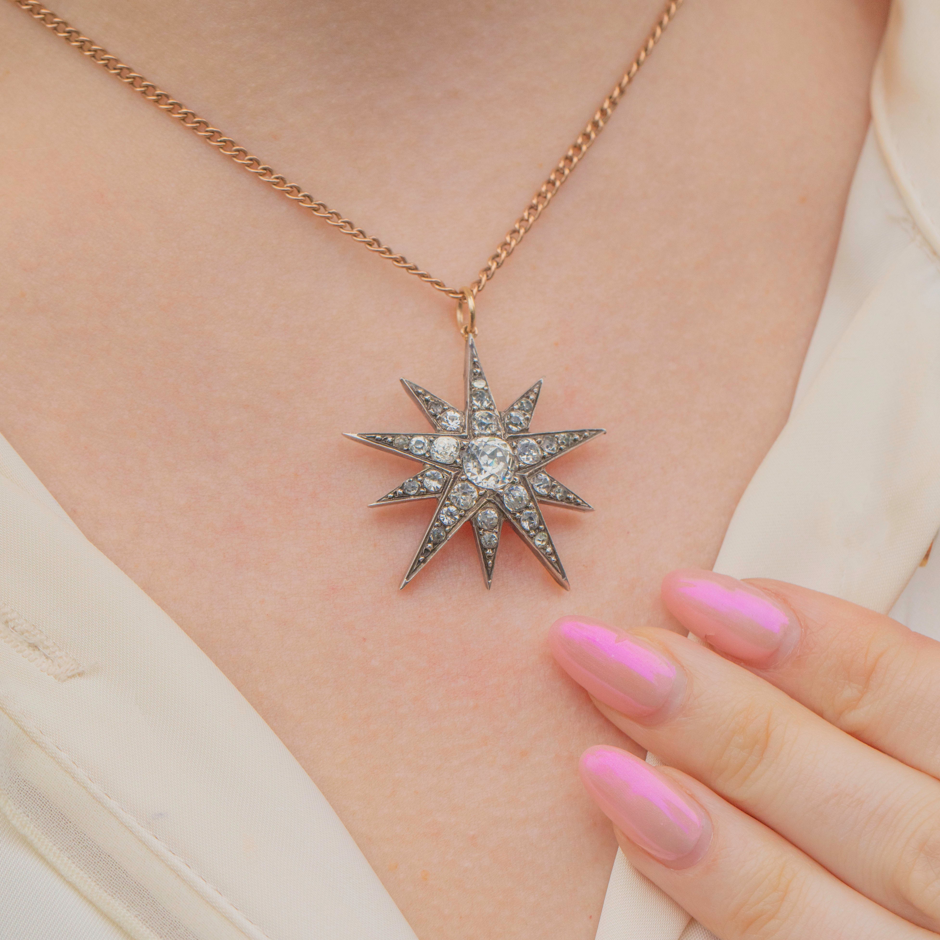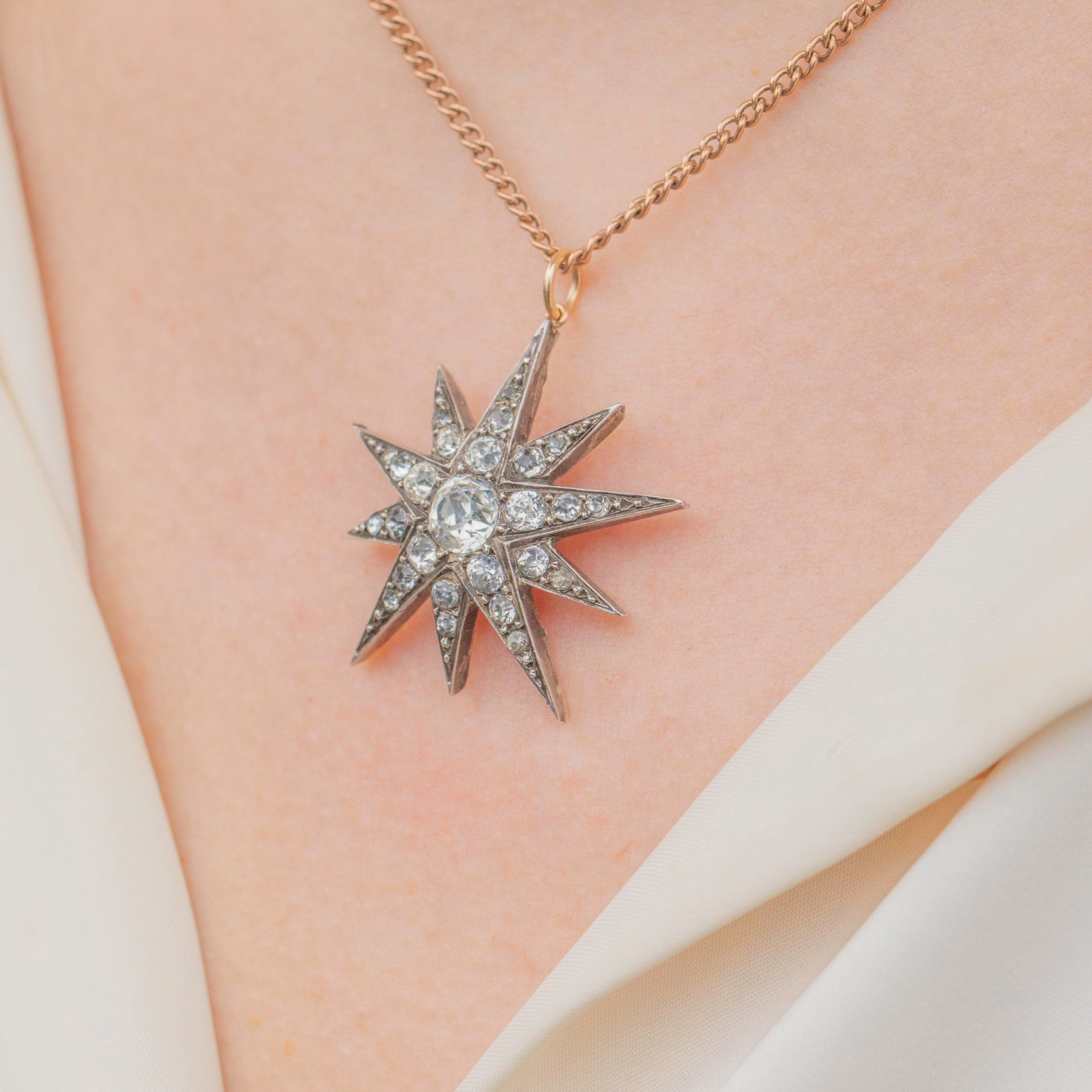 This bright Victorian Silver Paste star pendant will bring a bold celestial statement to your décolletage! This antique pendant is inalid with a selection of scintillating Diamond Paste, emphasised by the patina that has accrued within the Sterling Silver settings creating a dramatic contrast.