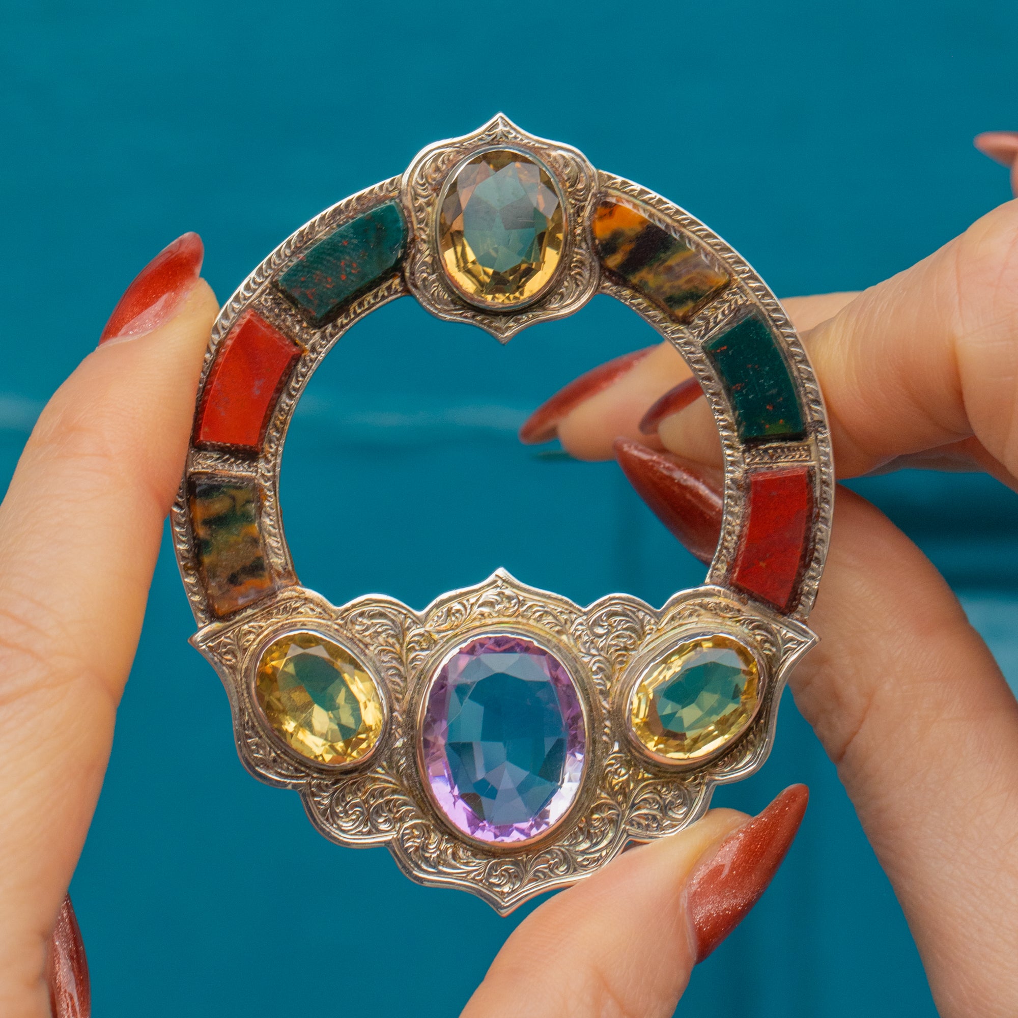 This Victorian Silver Scottish Agate brooch is packed with antique charm and character! Crafted from lustrous Silver and backed with 9ct Gold, this large Victorian brooch is coloured with a myriad of gemstones and is a true feast for the eyes!