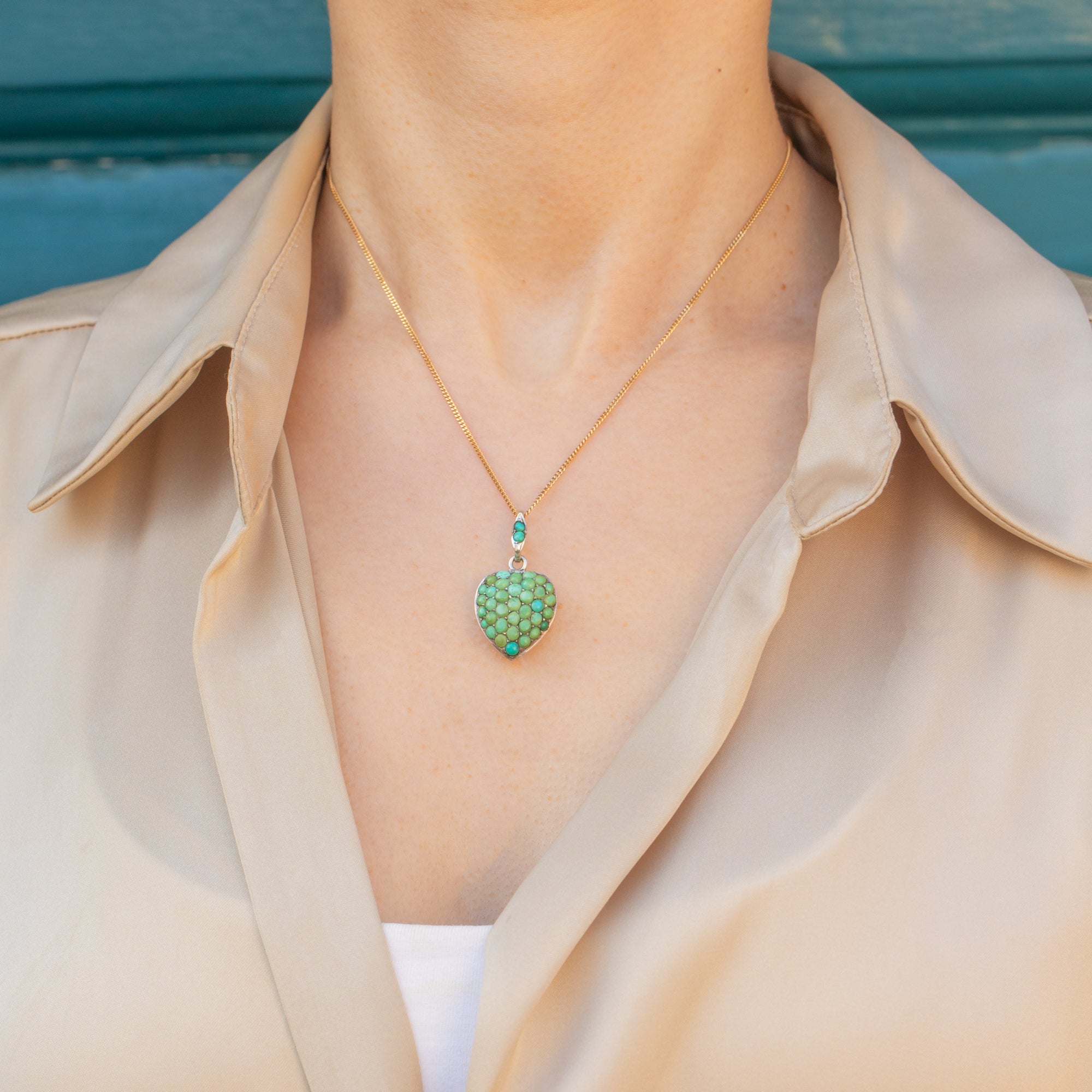 Crafted from glossy Sterling Silver, this Victorian pavé heart pendant is adorned with an array of Turquoise stones, each with a distinct and unique blue-green saturation. She is complete with a locket back, perfect for holding a cherished photograph close to your heart.