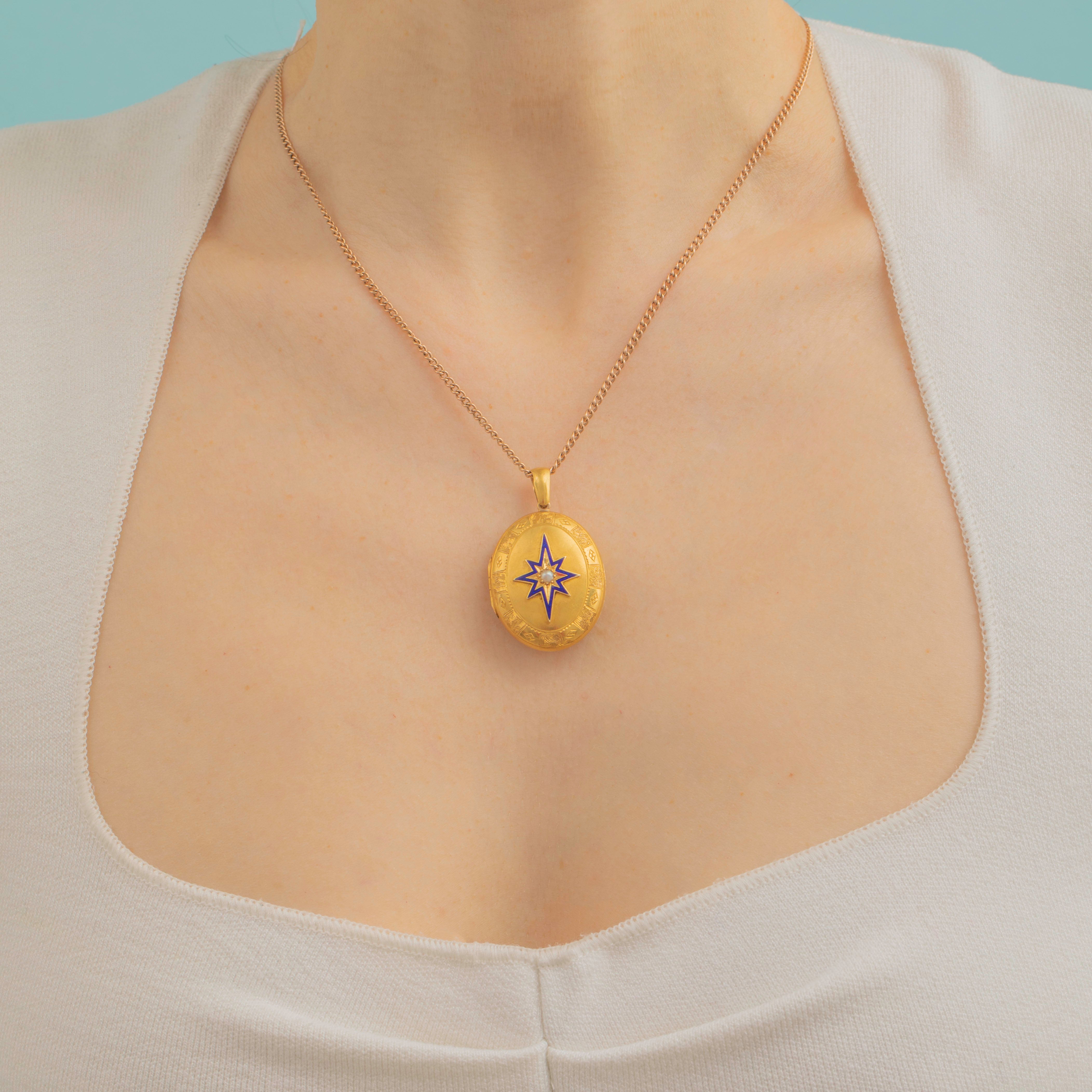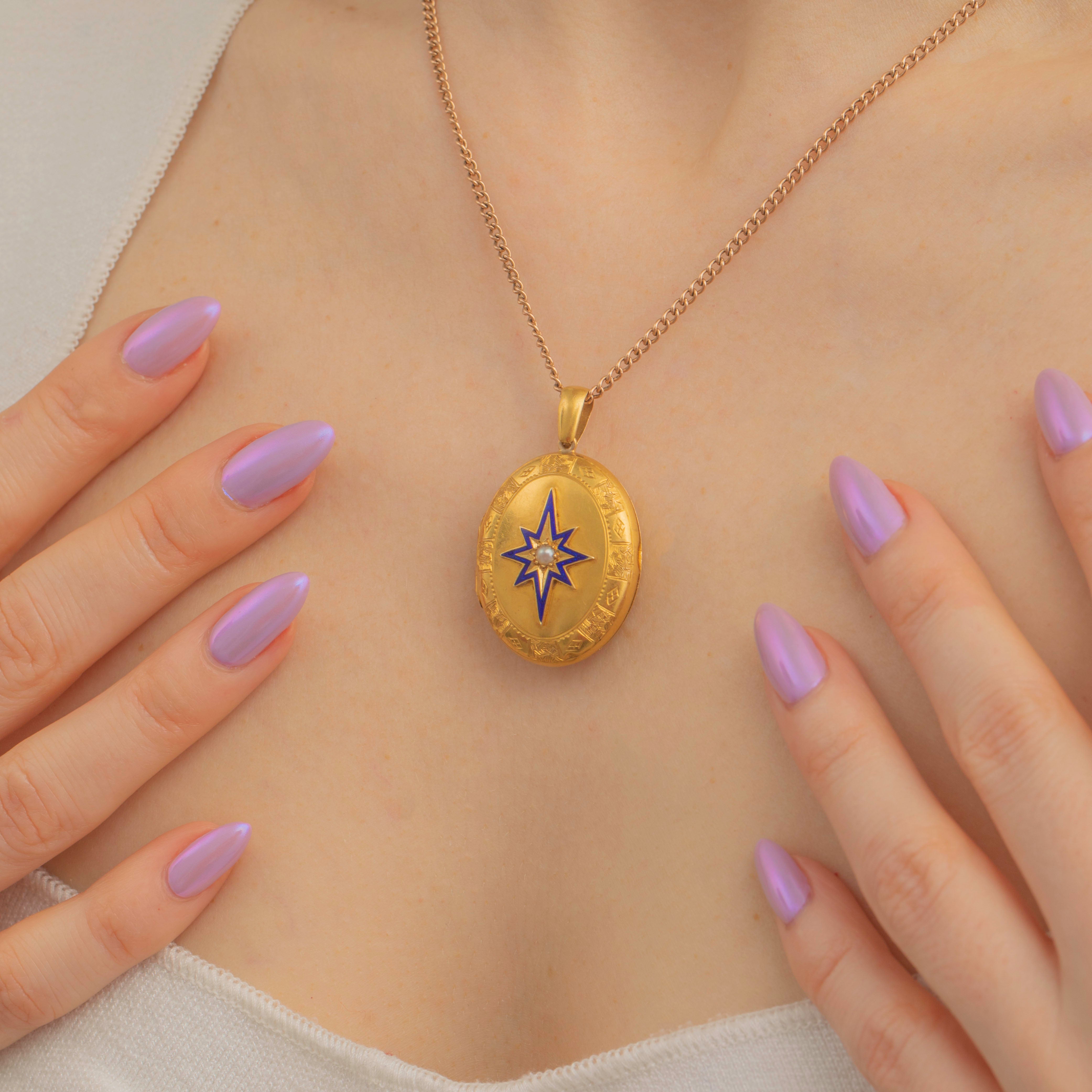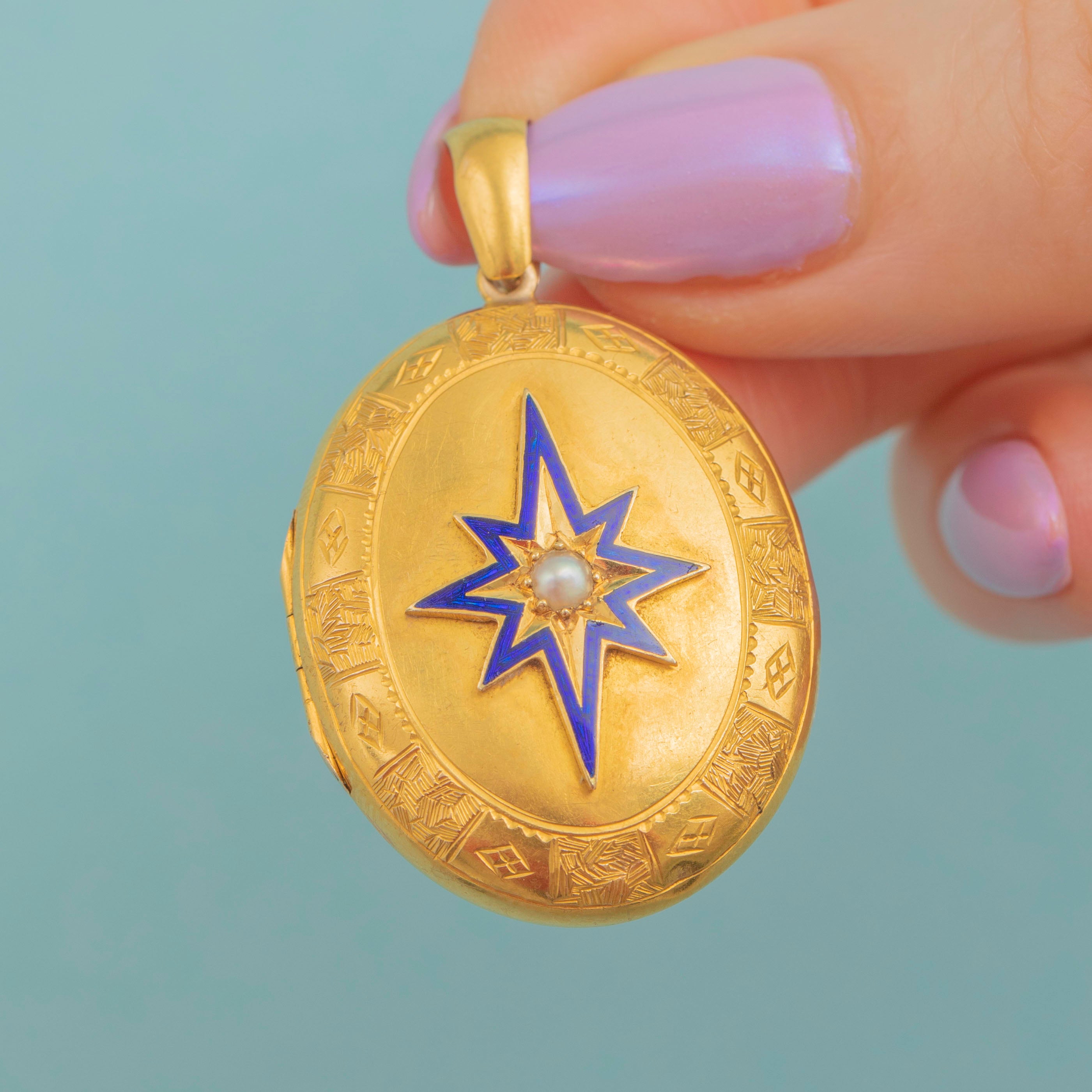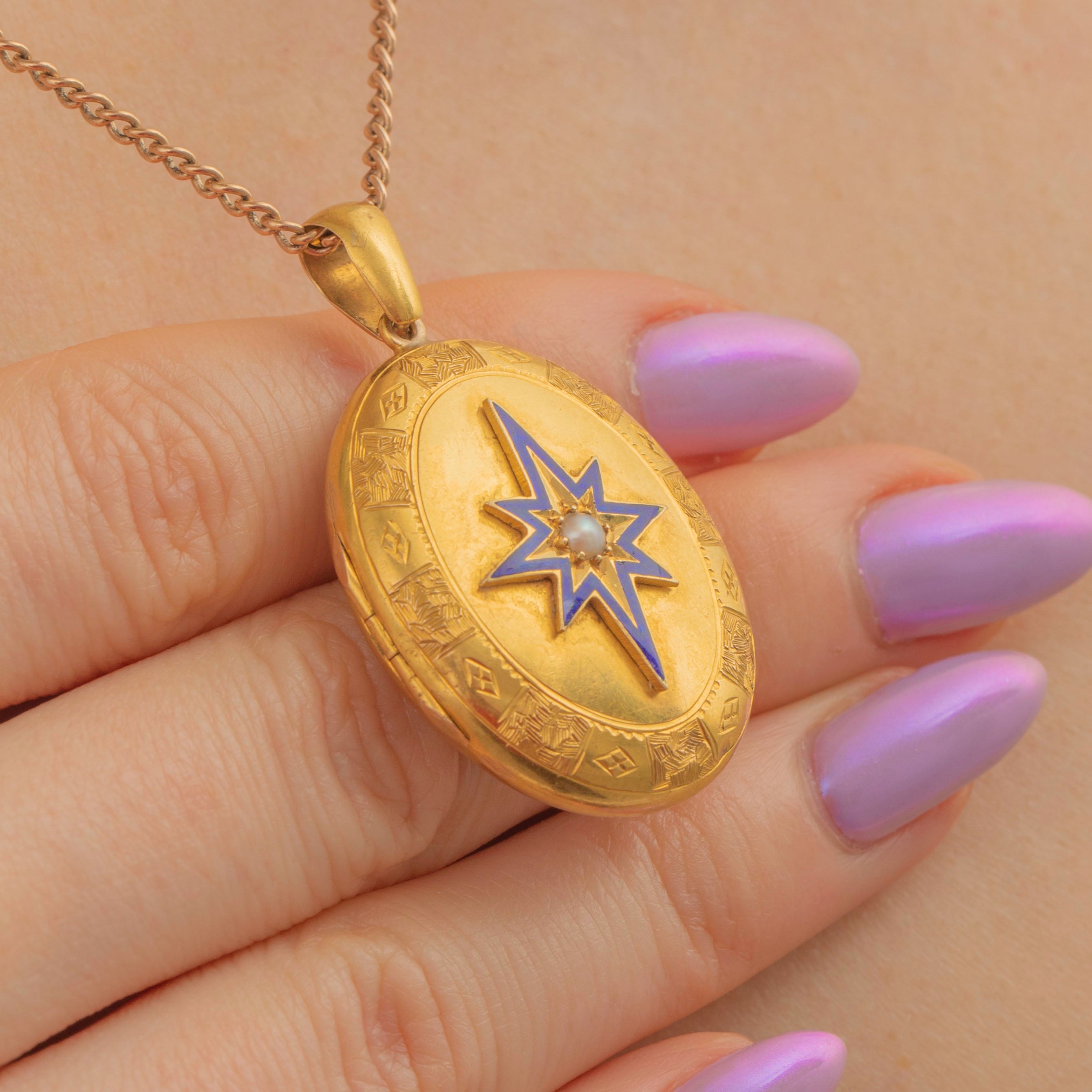 Victorian Solid 18ct Gold Engraved Locket with Blue Enamel Pearl Star