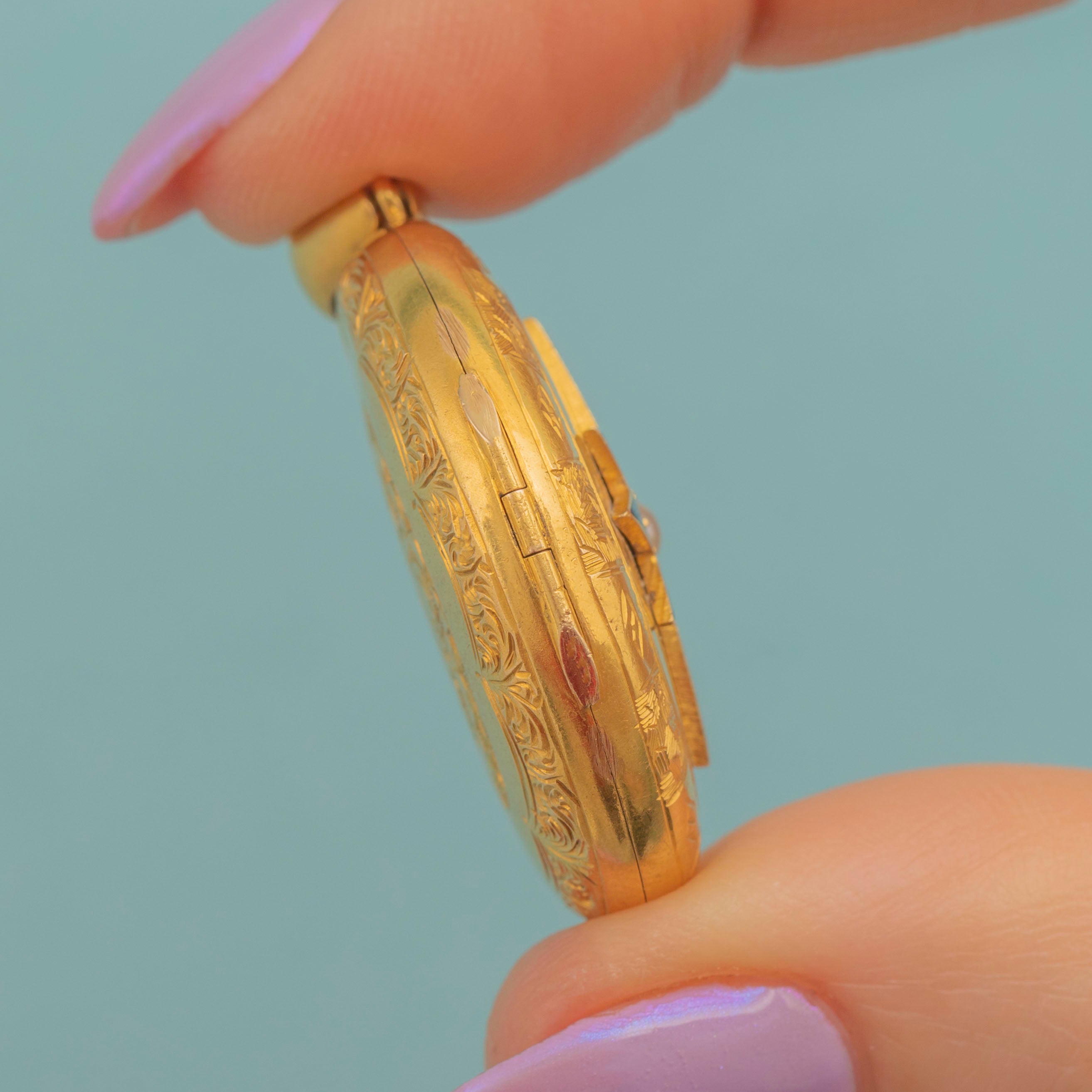 VERY GOOD. This Victorian solid 18ct Gold engraved locket is in very good condition. The locket has kept its form incredibly well, despite its grand age, and still has two frames present. The Enamel is still crisp and bright and the Pearl is secure. The only thing to note in the locket is on the inside of the left locket door, where there is excess glue that is likely to secure the star into place. This is only visible when there is nothing inside the locket, so you won't be able to see it when photos are placed inside.
