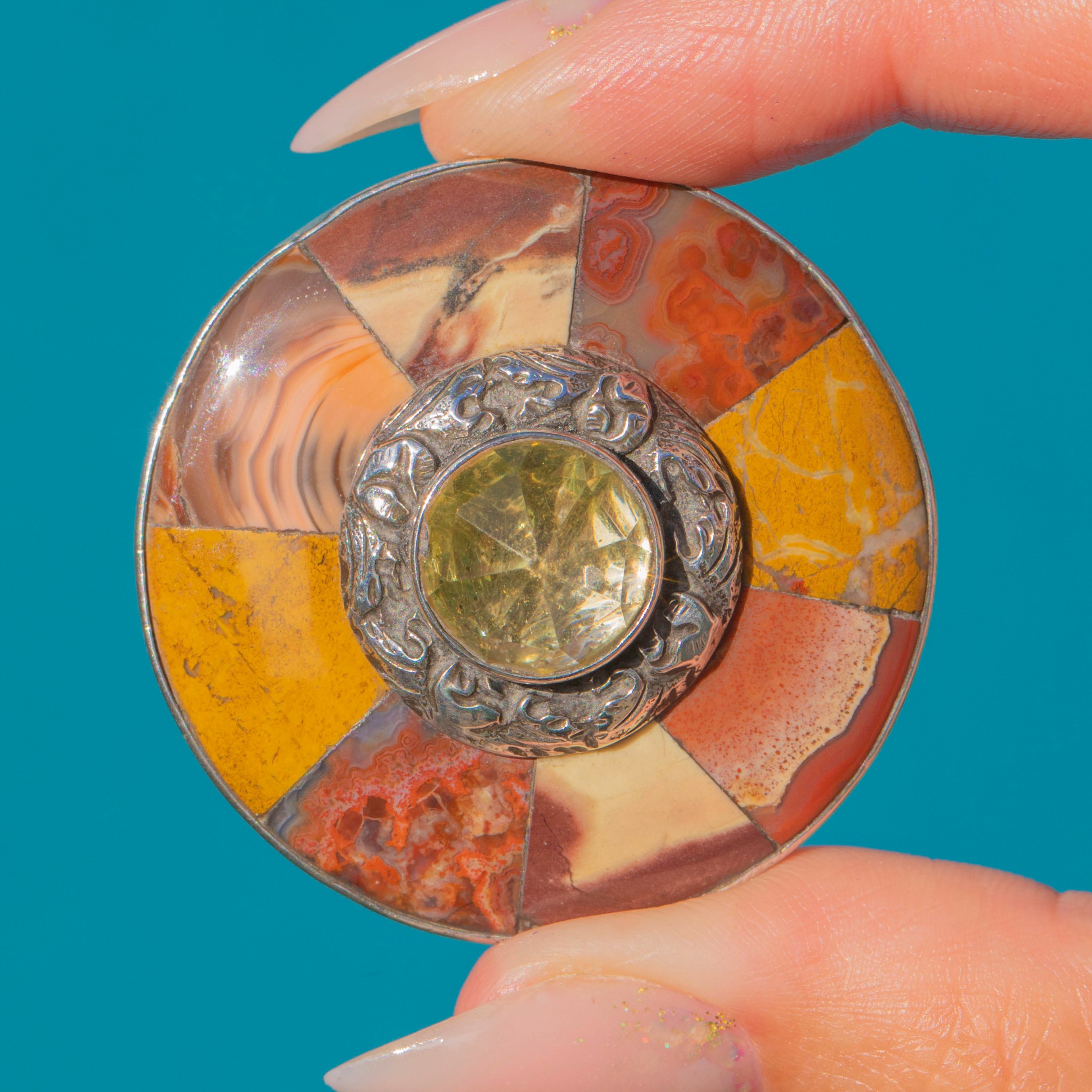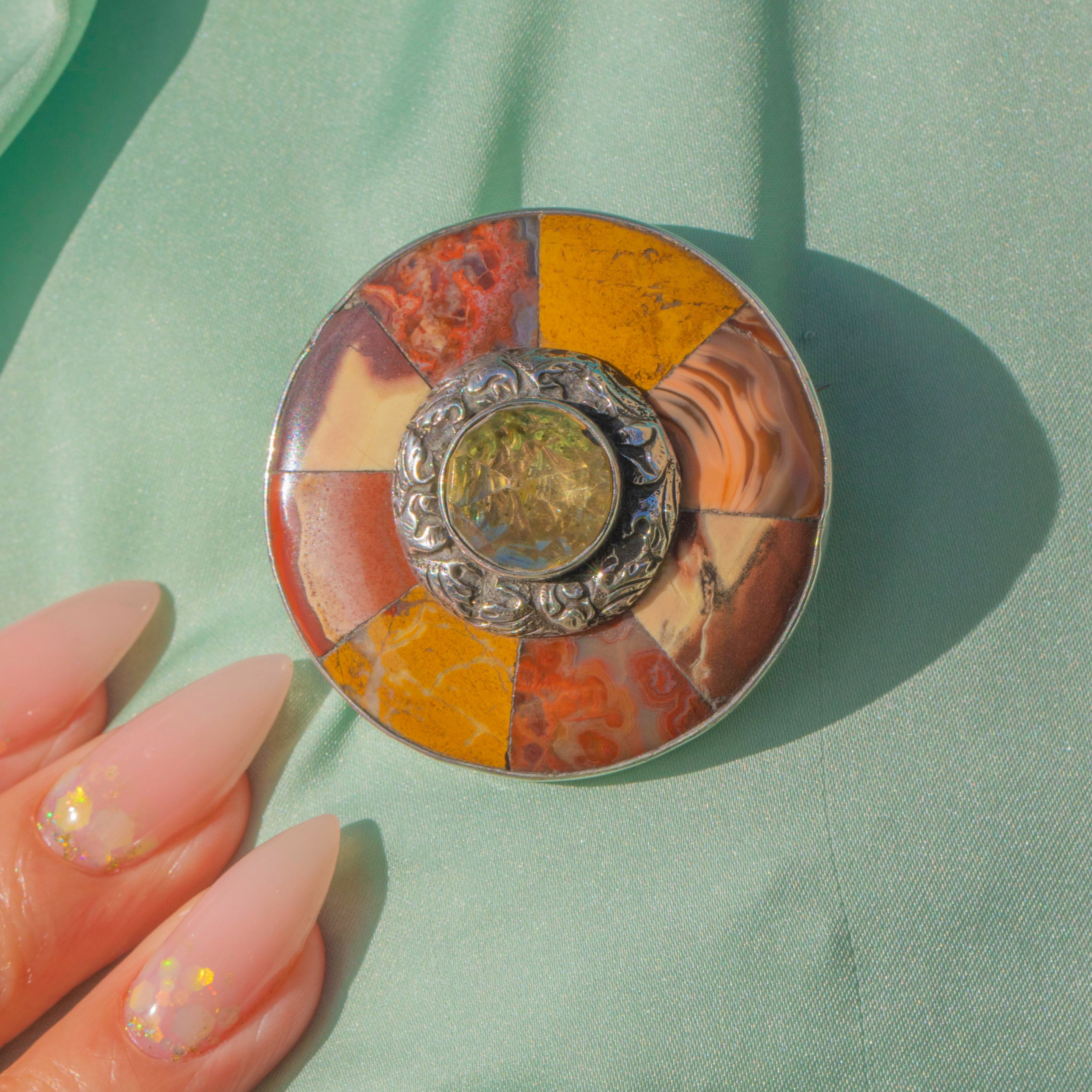 EXCELLENT: The Agates and Jaspers are fine specimens with strong colour and no chips or cracks. The Citrine remains vibrant with crisp rose-cut facets. All stones are secure and well set. The Silver pin is sturdy, though the c-clasp and pin do not sit snugly and will need to be fastened through thicker fabric for best security.