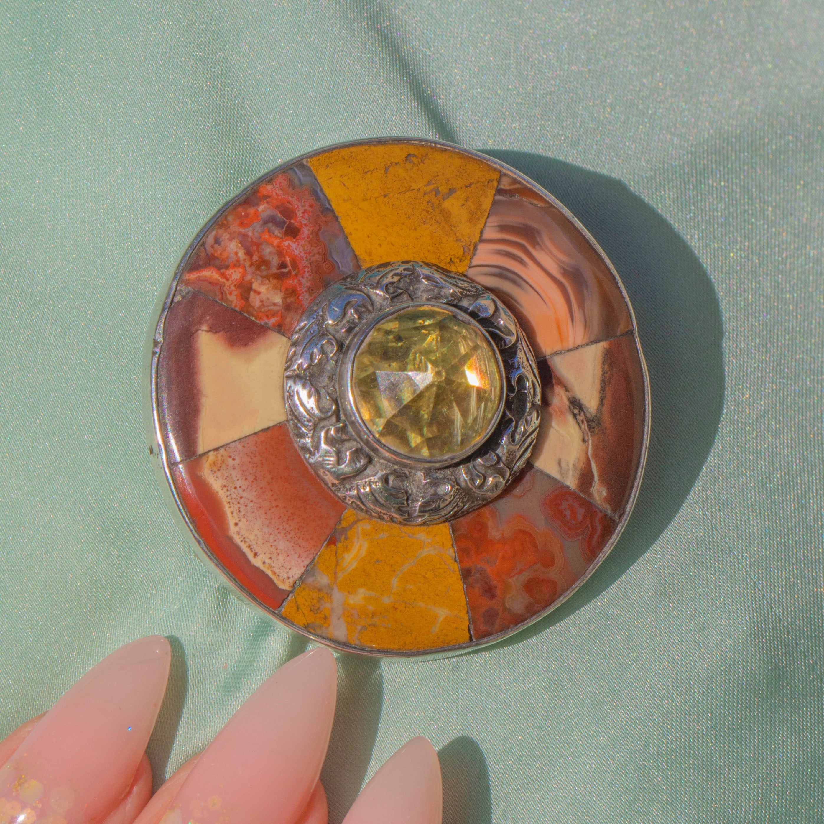 This impressive antique Scottish brooch dates to c.1880 and showcases the superb craftsmanship of Victorian jewellery. A glowing rose-cut Citrine takes pride of place at the centre, its crisp facets radiating a bright lemon-yellow hue. Surrounding it, hand-cut Agates and Jaspers are meticulously pieced together in a perfect circular form, displaying a palette of earthy autumn tones from mustard yellow to cream and warm russets.